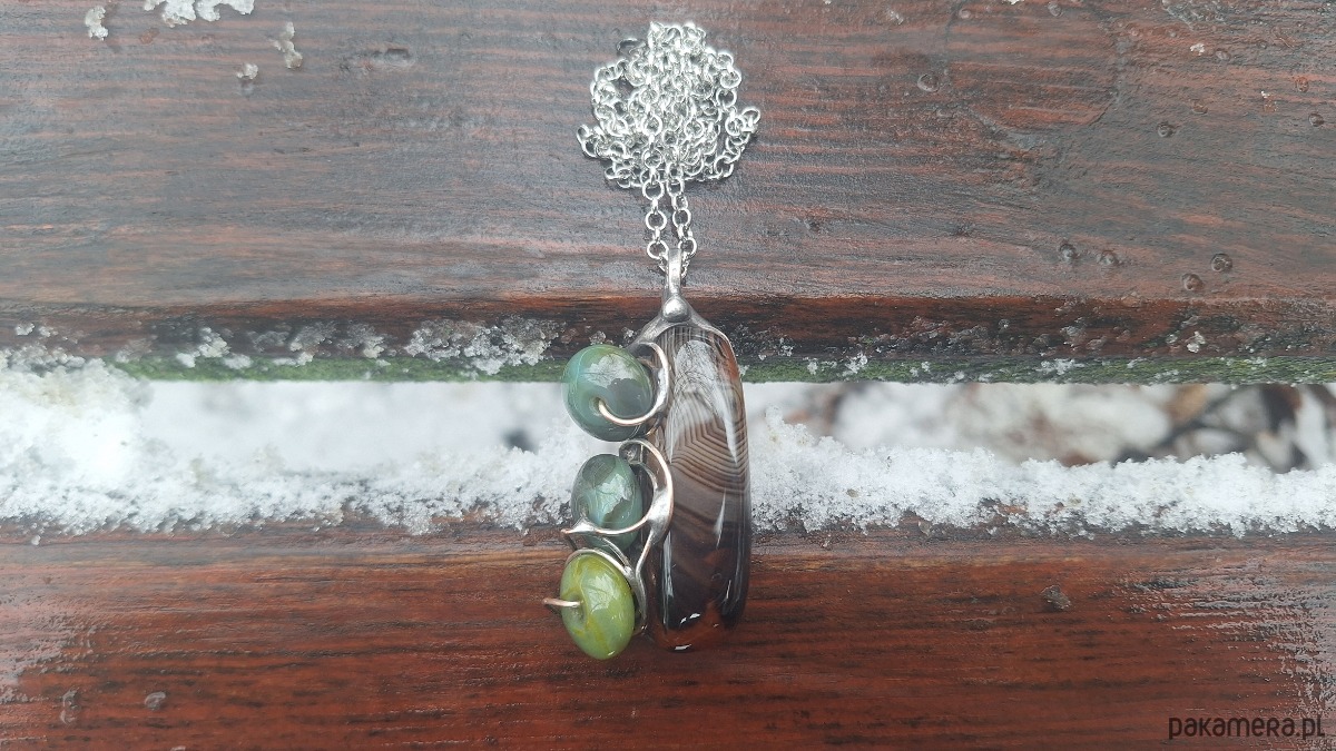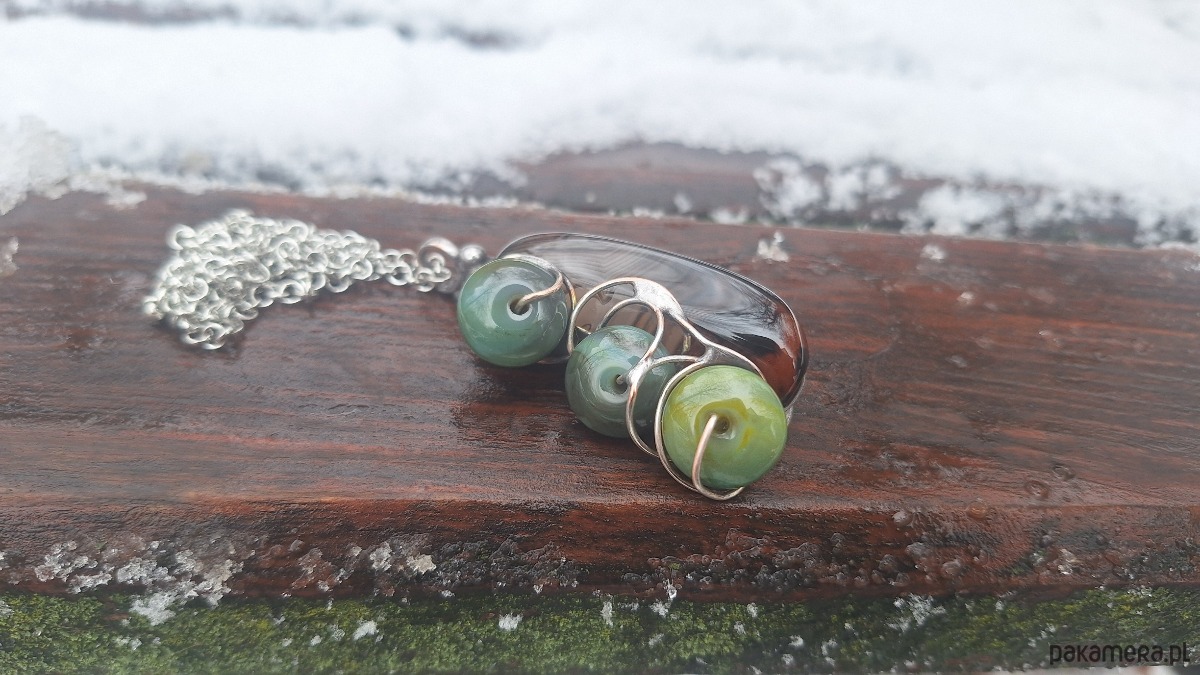 Wisiorek wykonany z miedzi, cyny i agatów. Wymiary ok. 5 na 3 cm. Zawieszony na łańcuszku o długości ok. 50 cm.