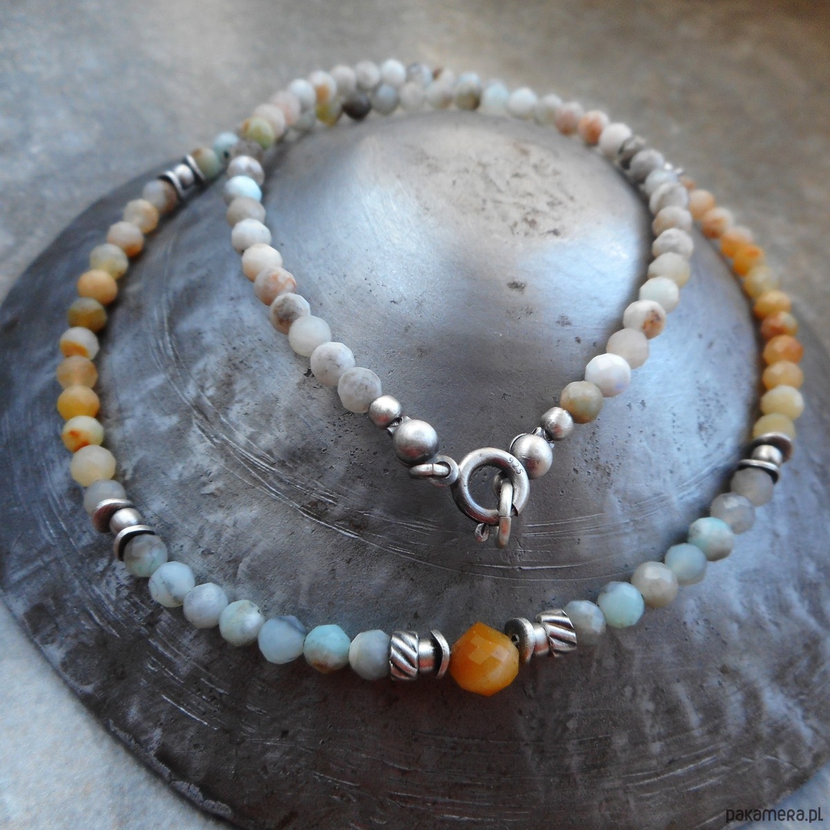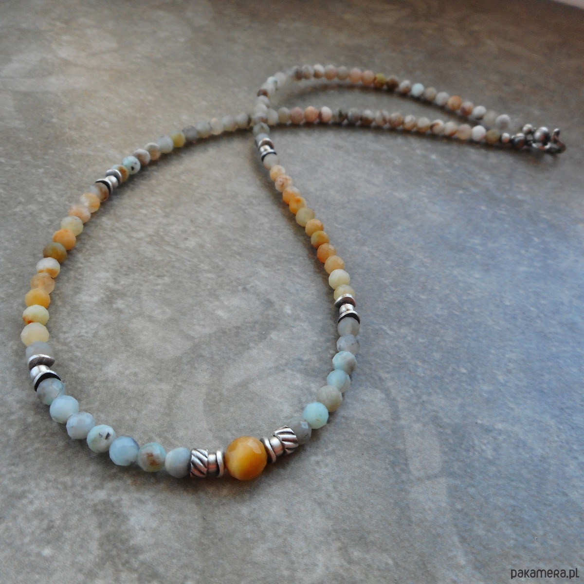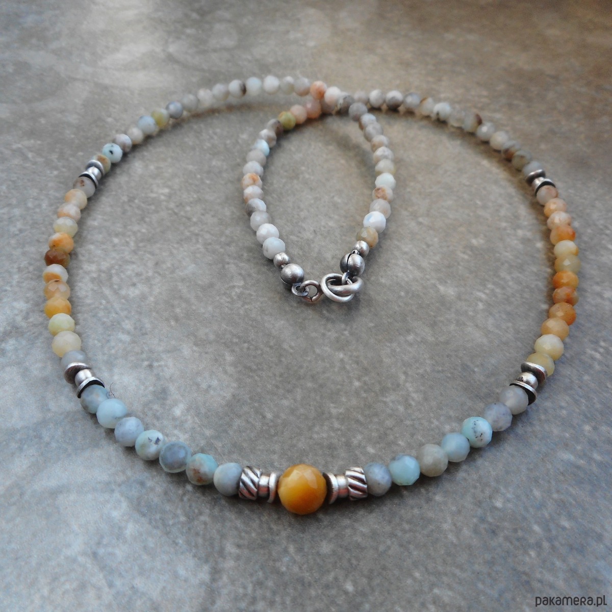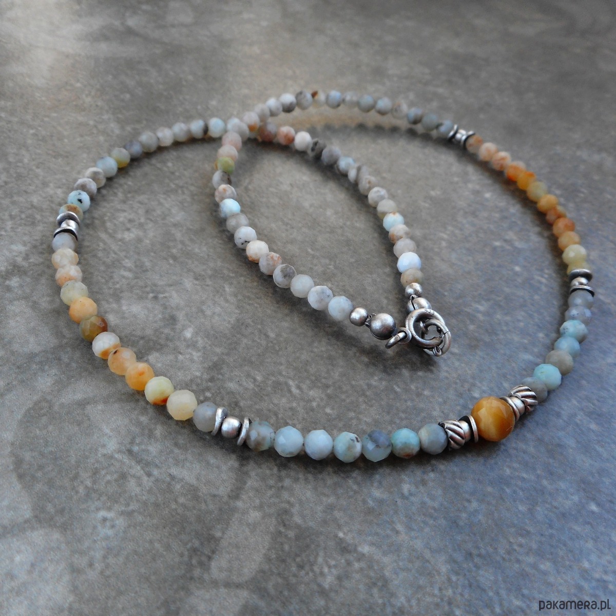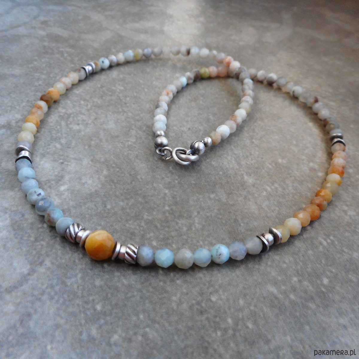 Piękny, krótki naszyjnik wykonany ze szlachetnego srebra i kamieni naturalnych; w stonowanych odcieniach, minimalistyczny i elegancki
