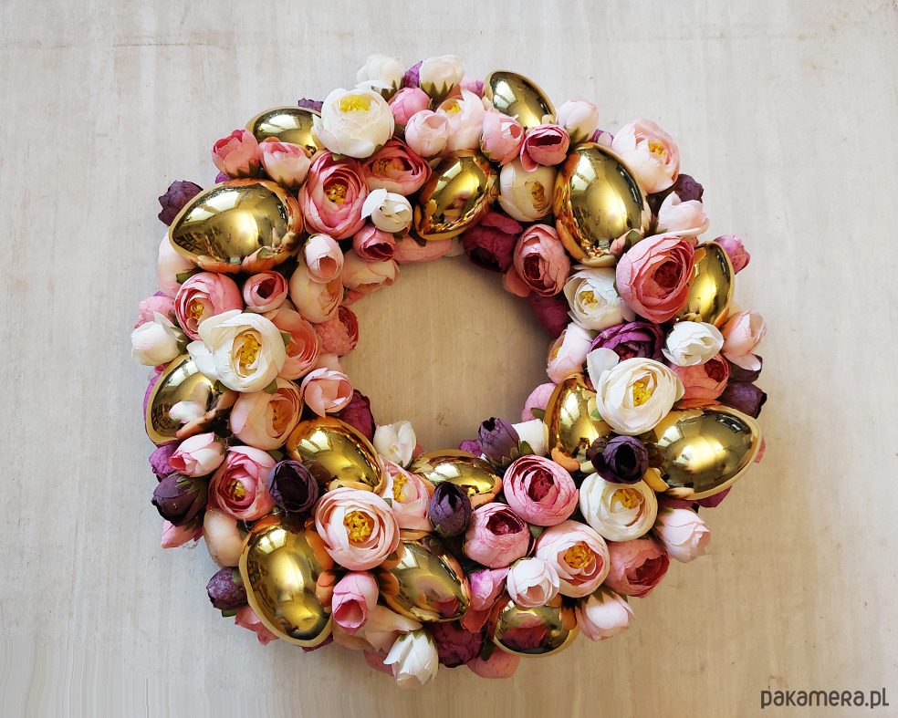 Minimalistyczny, eleganci, wielkanocny wianek. Wykonany został z wysokiej jakości jaskrów uzupełnionych świątecznymi pisankami połyskującymi złotem. Pogodna kolorystyka, utrzymana w tonacjach różu, fioletu i kremu ożywi każde wnętrze lub przywita Twoich gości, wisząc na drzwiach. Średnica ok 30cm.