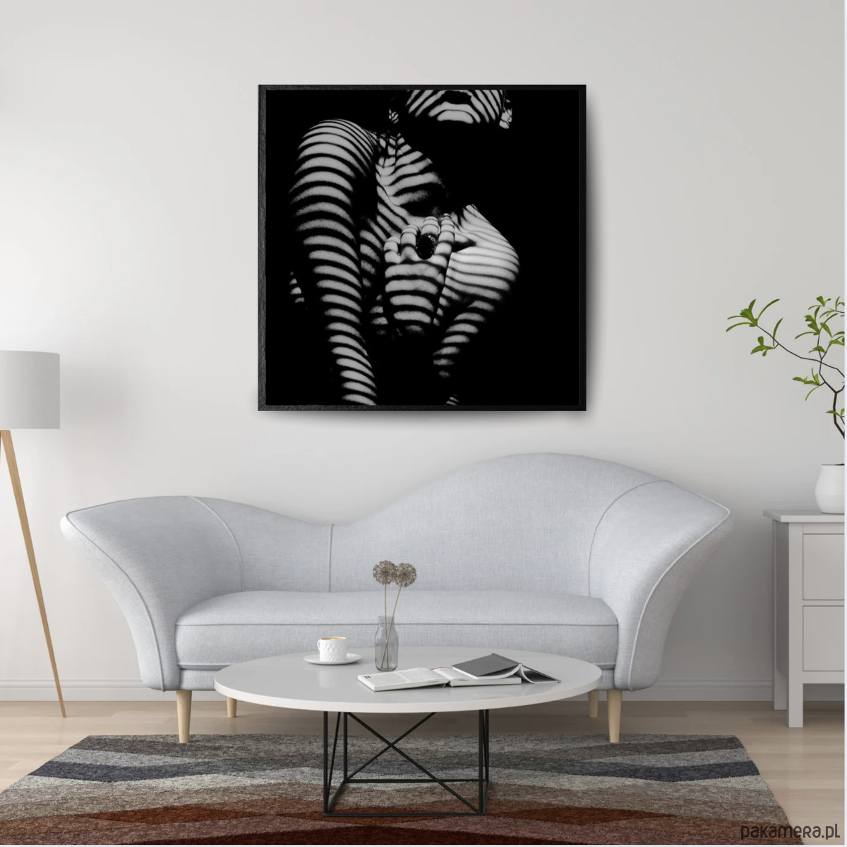Fotografia artystyczna, akt na płótnie satynowanym 60x60 cm, gotowa do zawieszenia na ścianie -naciągnięta na solidny blejtram i utrwalona werniksem (mat lub piękny pół połysk satynowy), co daje dodatkowe zabezpieczenie przed urazami zewnętrznymi. Werniks w bardzo elegancki sposób wydobywa fakturę płótna, a pół połysk dodatkowo ożywia kolory. Dzięki werniksowi można obraz od czasu do czasu delikatnie przetrzeć na sucho z kurzu.