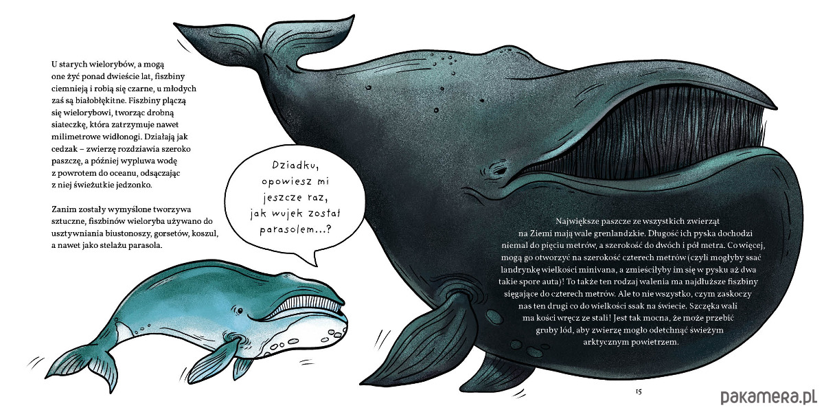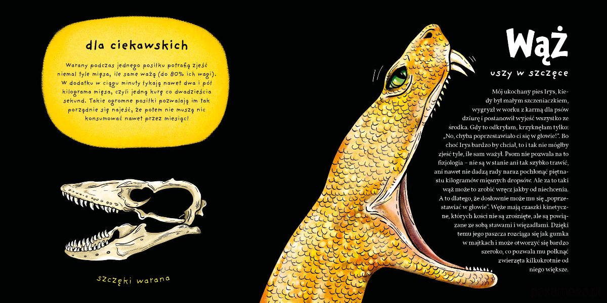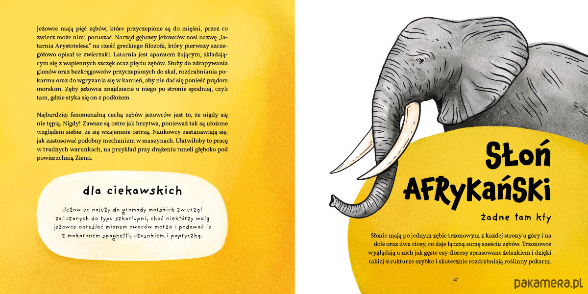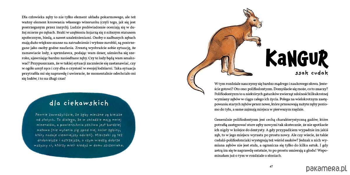 A jak dowiecie się z tej książki, są też takie zwierzęta, które żyją dosłownie tak długo, jak pozwalają im na to ich własne zęby! Poznamy tu więc pyski dzikie i udomowione, łagodne i niebezpieczne, niemal bezzębne i w zęby przebogato uzbrojone!