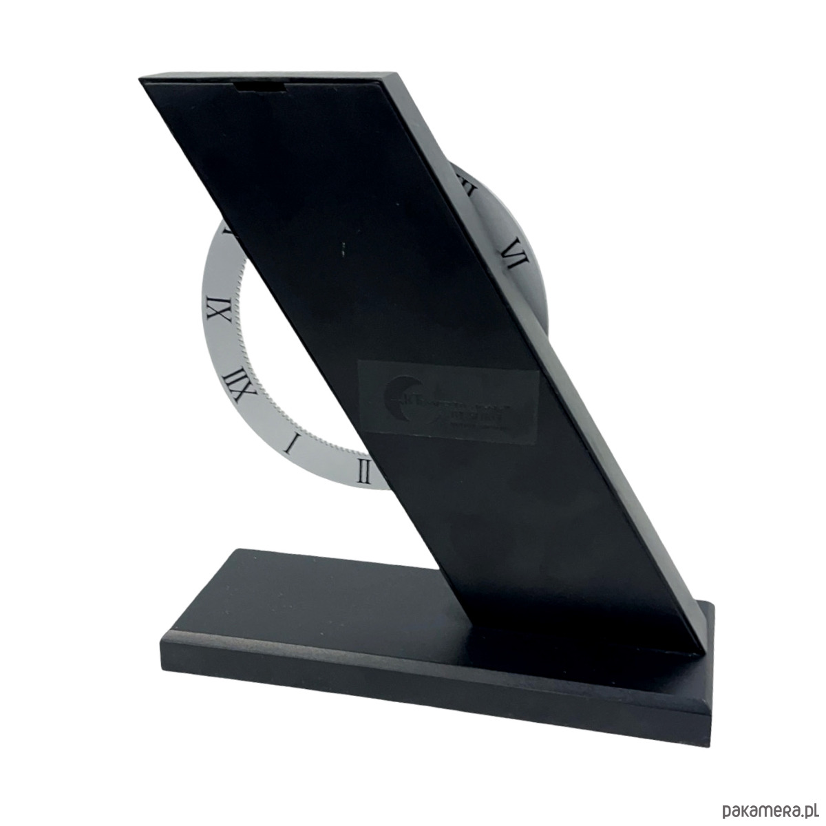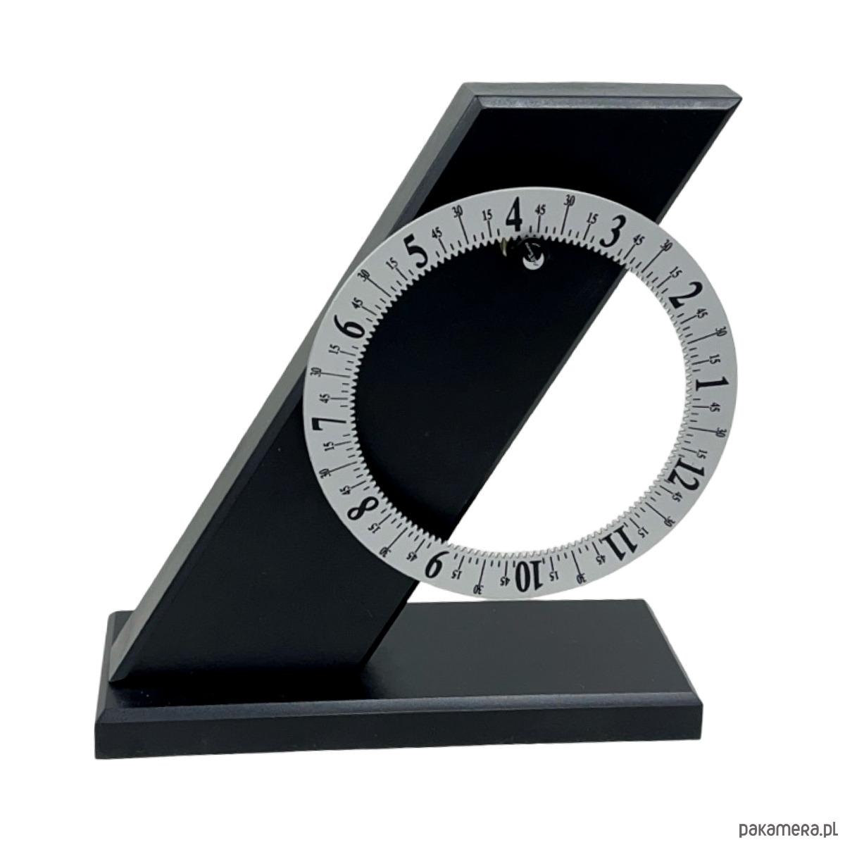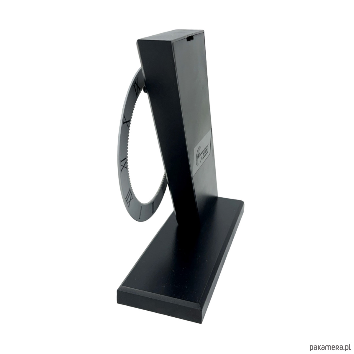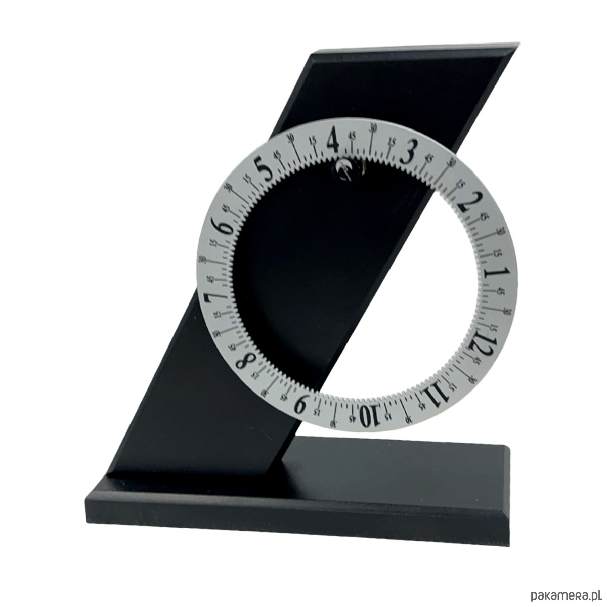 Zegar biurkowy postmodernistyczny — metal malowany proszkowo w kolorze grafitowym/czarnym, obrotowa tarcza z białymi cyframi arabskimi i podziałką minutową, mechanizm kwarcowy zasilany bateryjnie. Konstrukcja w formie pochyłego stelaża ("Z") z osadzoną obrotową tarczą, która obraca się pokazując godziny przy stałej wskazówce u góry. Tarcza dwustronna — z jednej strony cyfry arabskie, z drugiej cyfry rzymskie. Sygnatura na odwrocie: "ARTEMPO DESIGN by SEIKO / Patent Aur. Italy 1991/...". Wymiary: 22 × 19 × 7 cm. Włochy/Japonia, lata 90. XX w. Stan bardzo dobry, mechanizm sprawny.