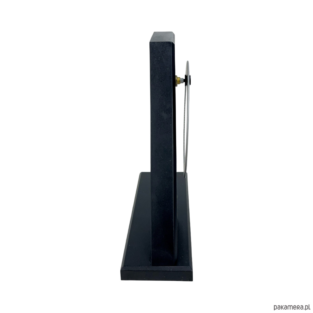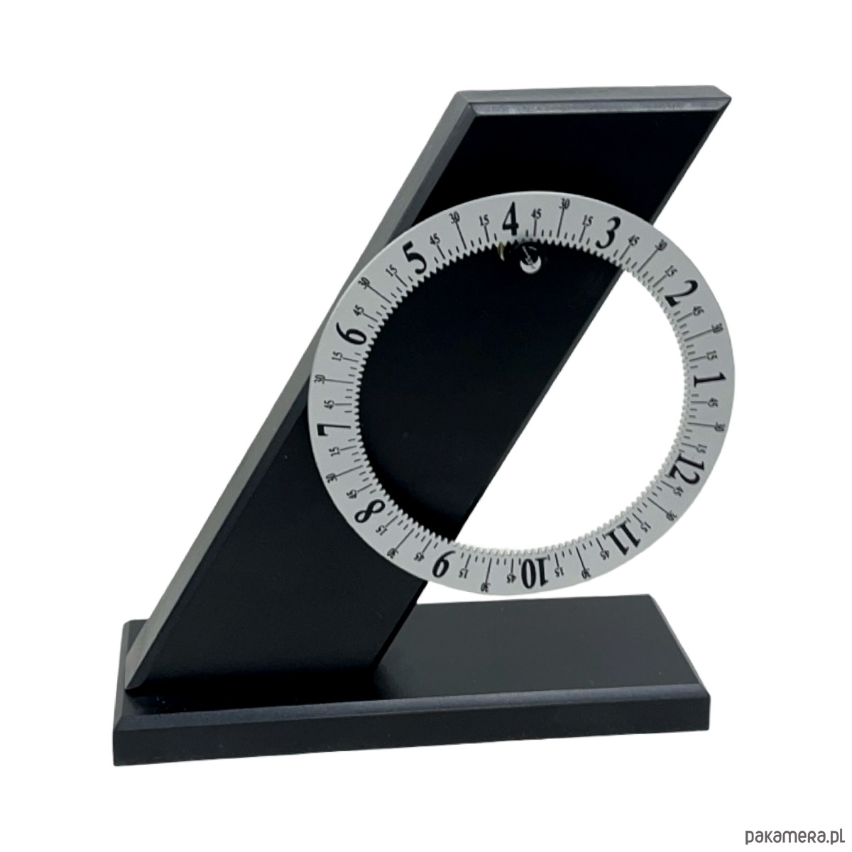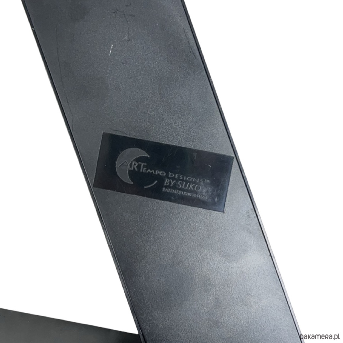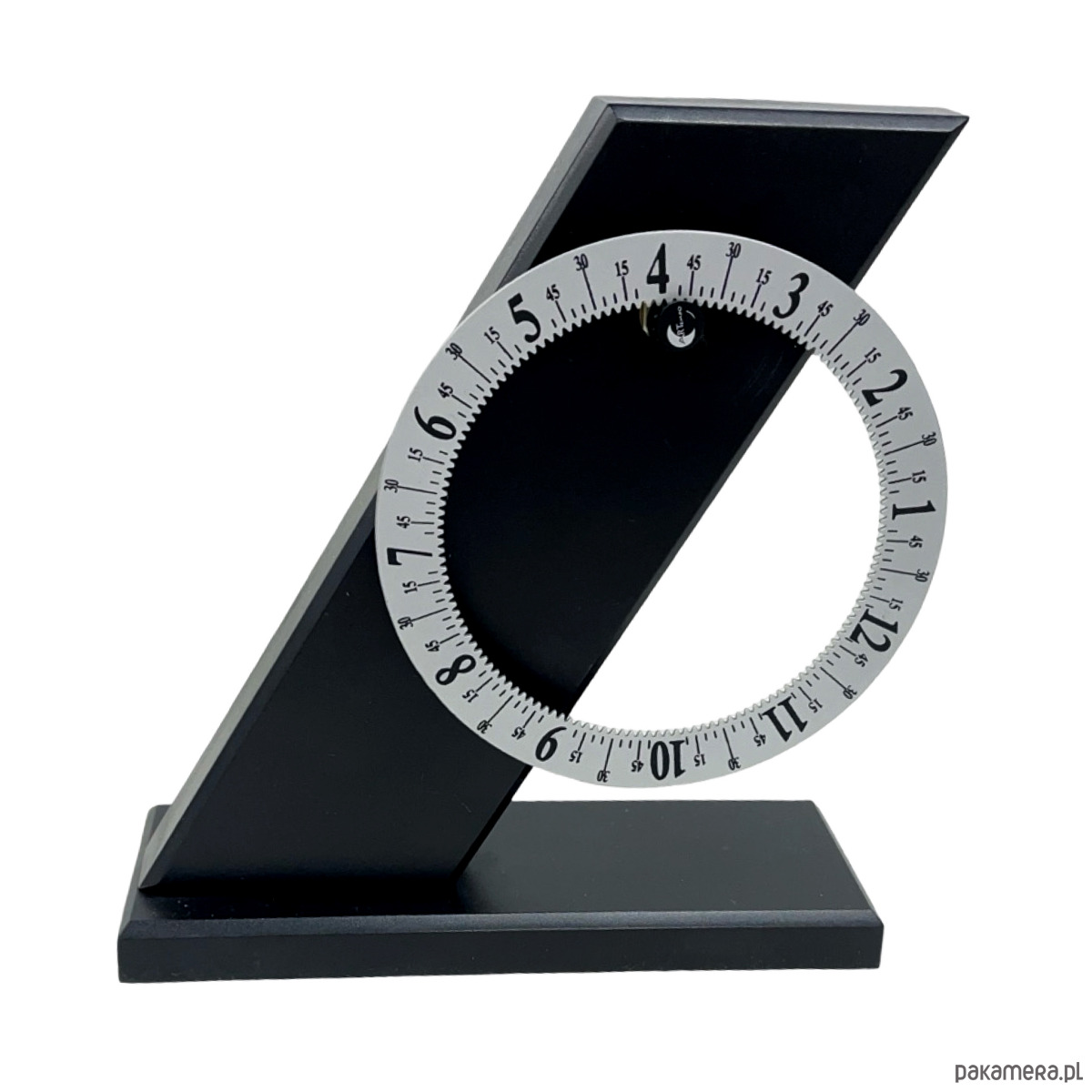 Zegar biurkowy postmodernistyczny — metal malowany proszkowo w kolorze grafitowym/czarnym, obrotowa tarcza z białymi cyframi arabskimi i podziałką minutową, mechanizm kwarcowy zasilany bateryjnie. Konstrukcja w formie pochyłego stelaża ("Z") z osadzoną obrotową tarczą, która obraca się pokazując godziny przy stałej wskazówce u góry. Tarcza dwustronna — z jednej strony cyfry arabskie, z drugiej cyfry rzymskie. Sygnatura na odwrocie: "ARTEMPO DESIGN by SEIKO / Patent Aur. Italy 1991/...". Wymiary: 22 × 19 × 7 cm. Włochy/Japonia, lata 90. XX w. Stan bardzo dobry, mechanizm sprawny.