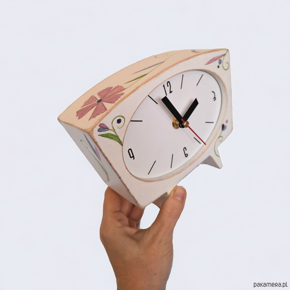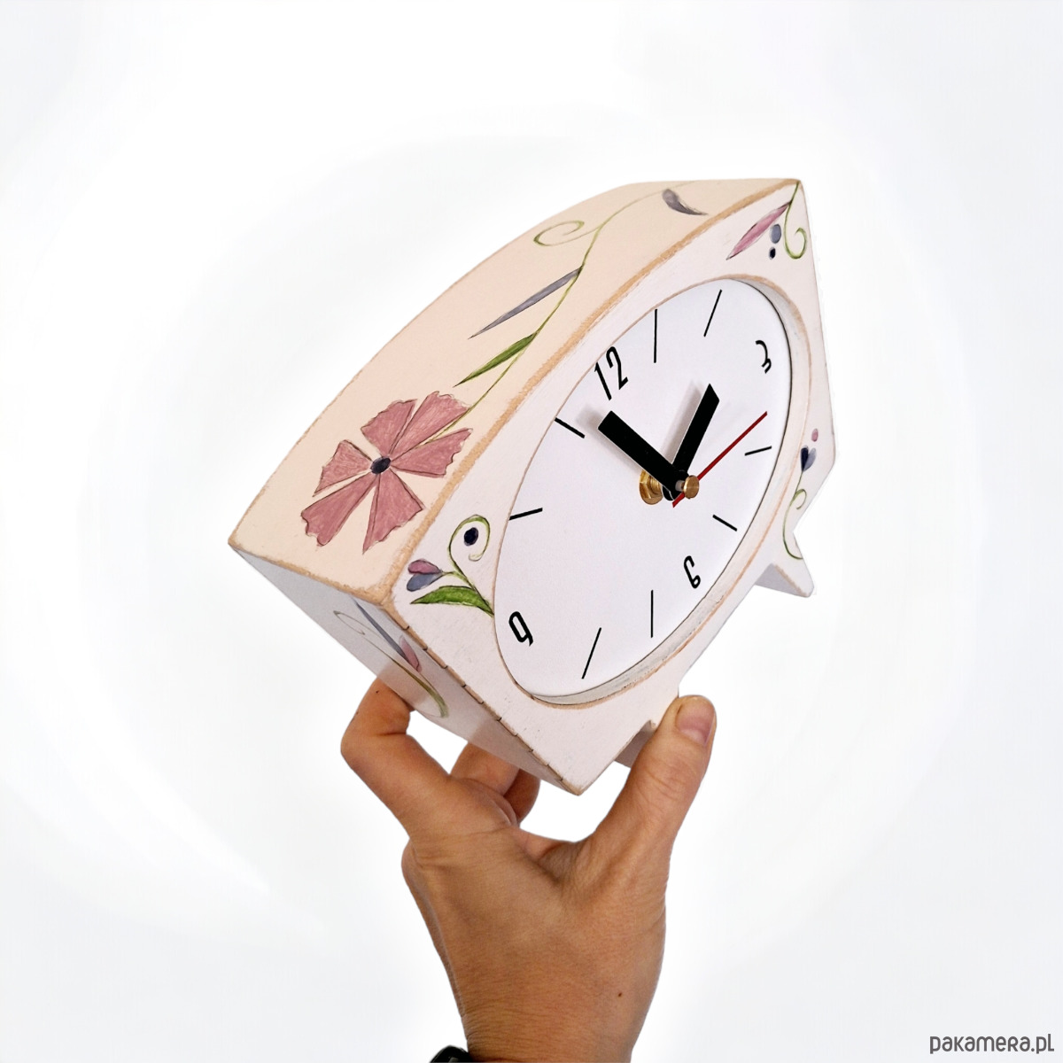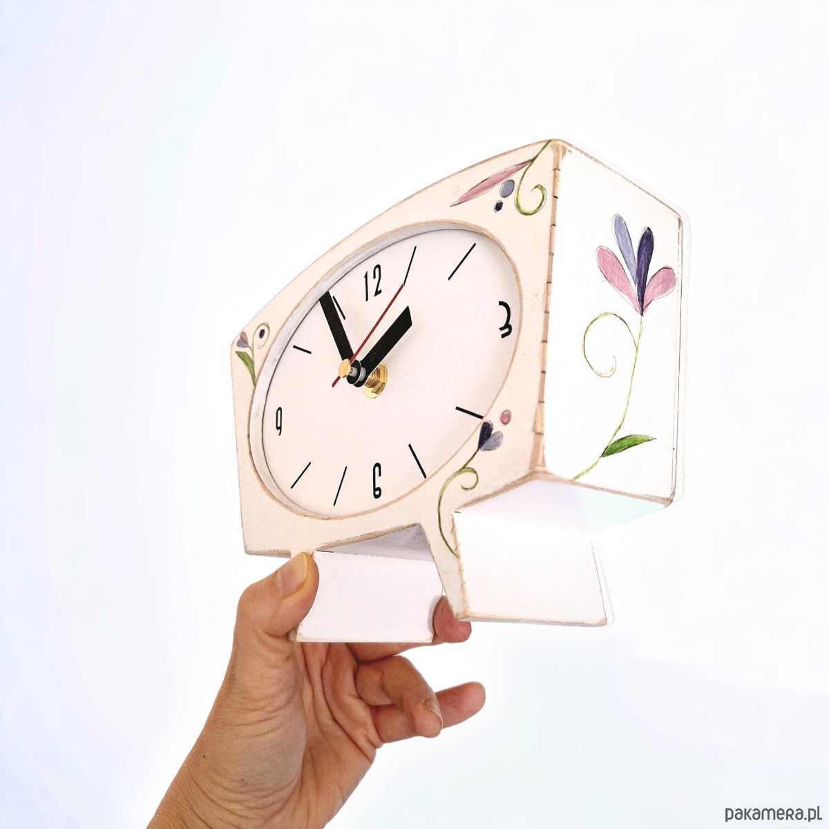 Nowa kolekcja inspirowana latami 60 i 70. Ten mały zgrabny zegarek jest idealny na prezent, dekoracyjny element każdego wnętrza, któremu doda charakteru minionych lat. wymiary 16 cm x 19 cm x 7,5 cm. Zegarek pomalowany został farbami akrylowymi w filkowe kwiaty i zabezpieczony ekologicznym lakierem. Wykonany ze sklejki drewnianej