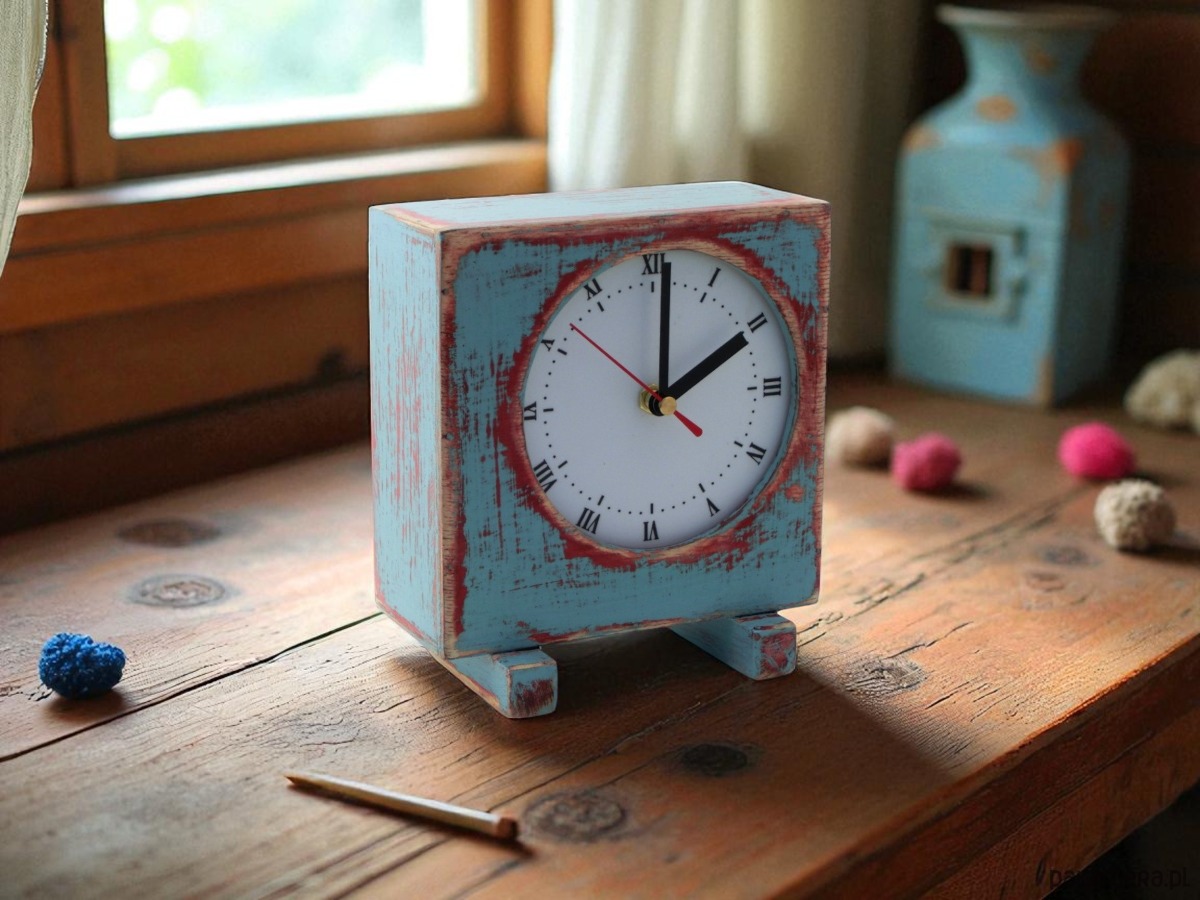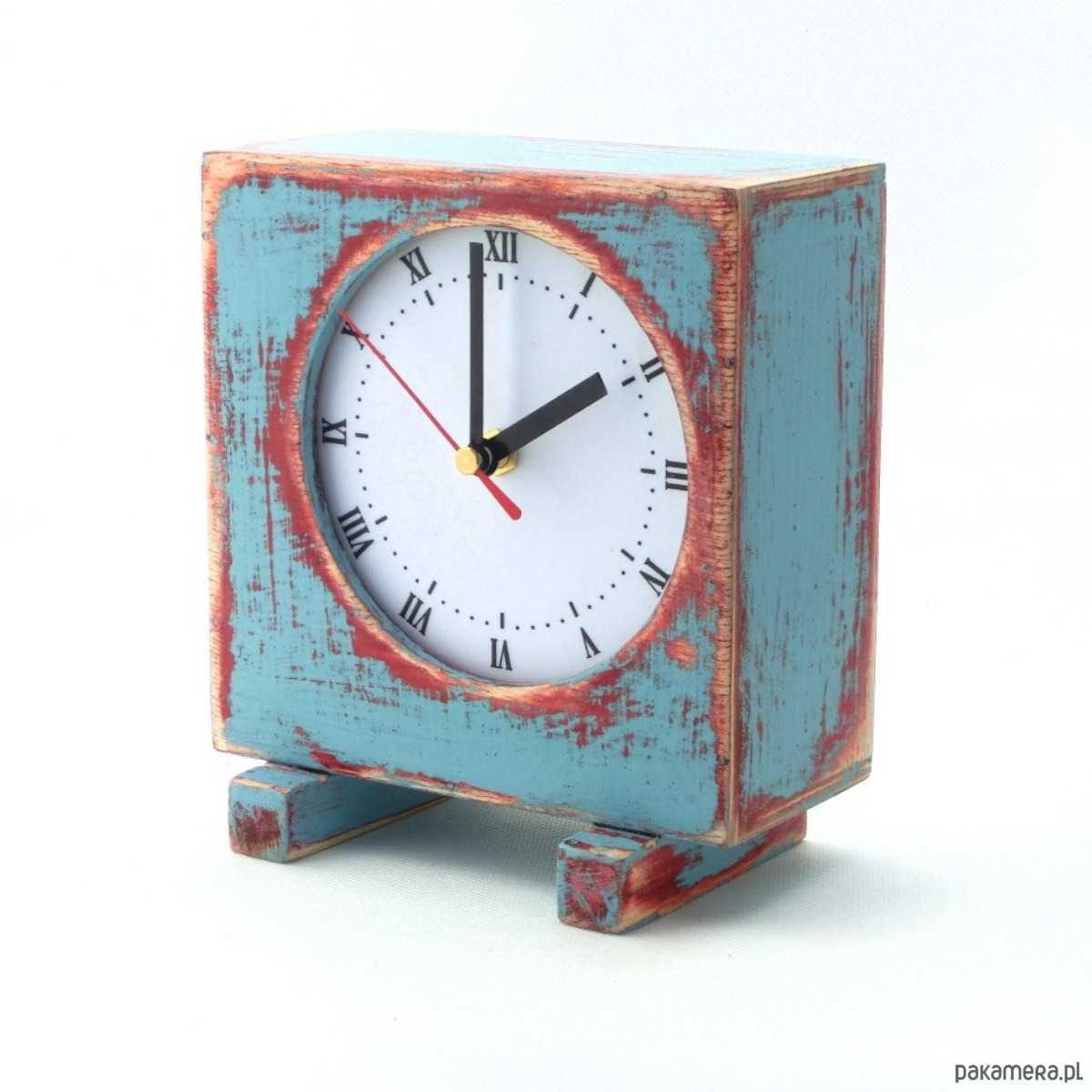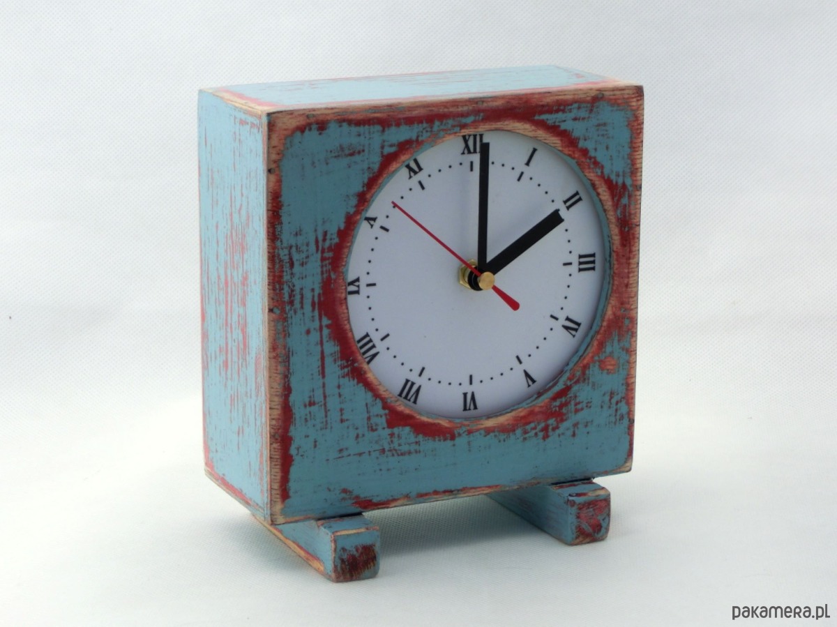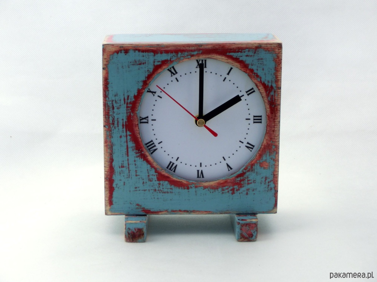 Nowa kolekcja inspirowana latami 60 i 70. Ten mały zgrabny zegarek jest idealny na prezent, dekoracyjny element każdego wnętrza, któremu doda charakteru minionych lat. wymiary 21cm x 20 cm x 7 cm. Zegarek pomalowany został farbami akrylowymi i zabezpieczony ekologicznym lakierem. Wykonany ze sklejki drewnianej