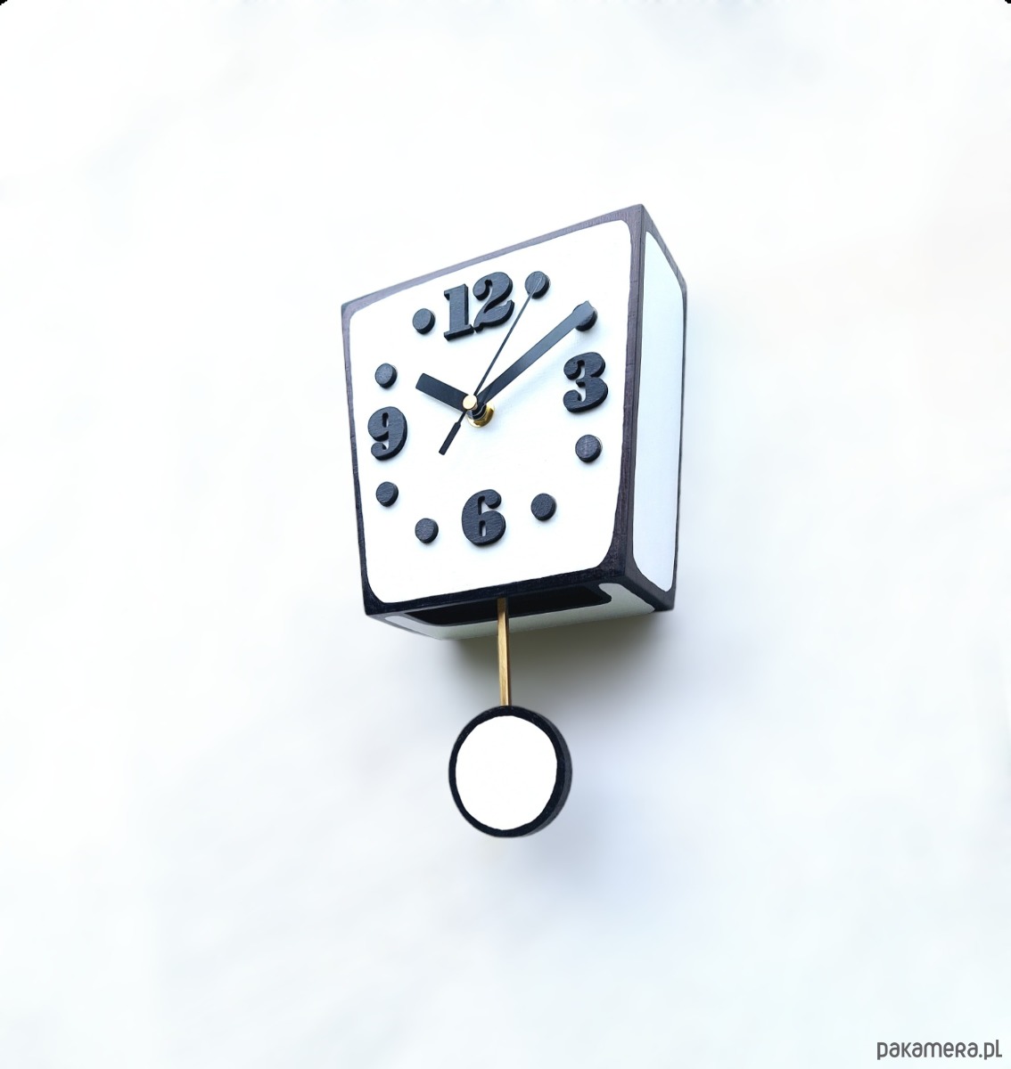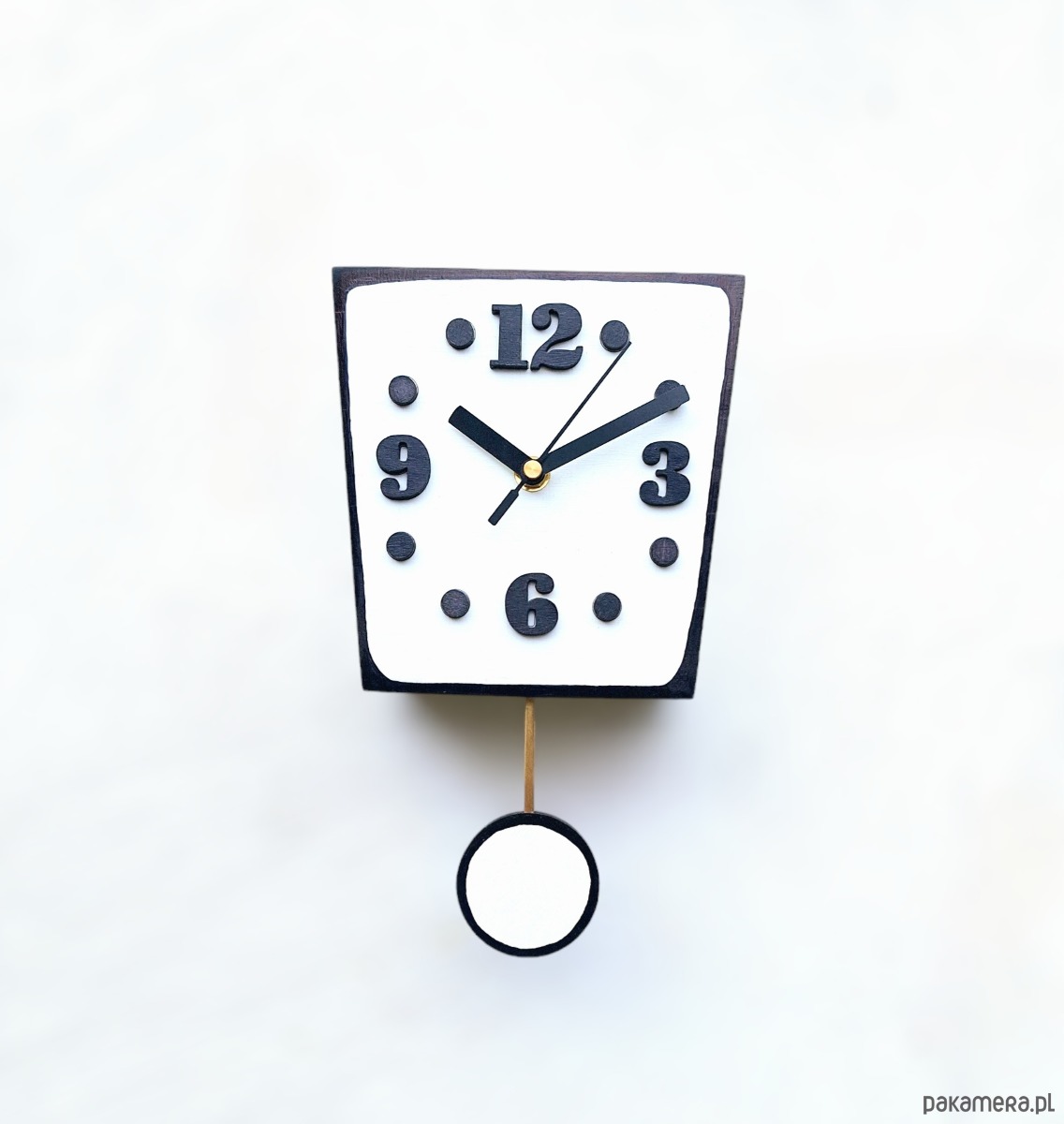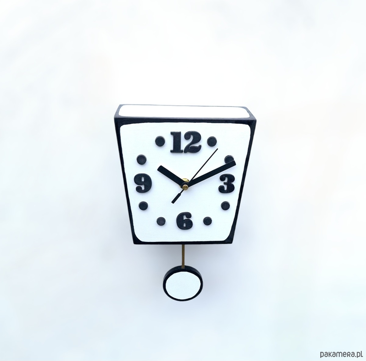 Wyjątkowy zegarek z wahadłem Black and White , pomalowany farbami akrylowymi, zabezpieczony ekologicznym lakierem. Wykonany ze sklejki drewnianej o wymiarach szer.16 cm, wys. (z wahadłem) 26cm, gł. 7cm.