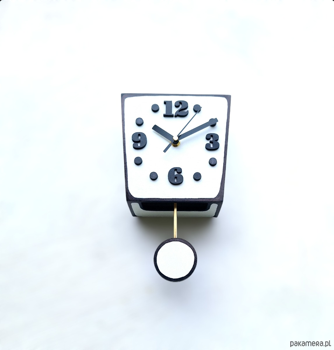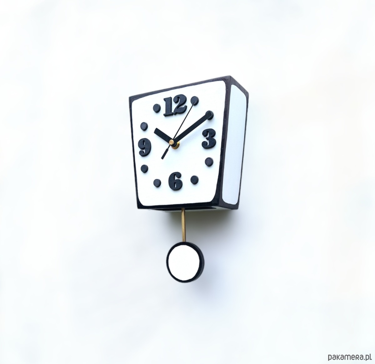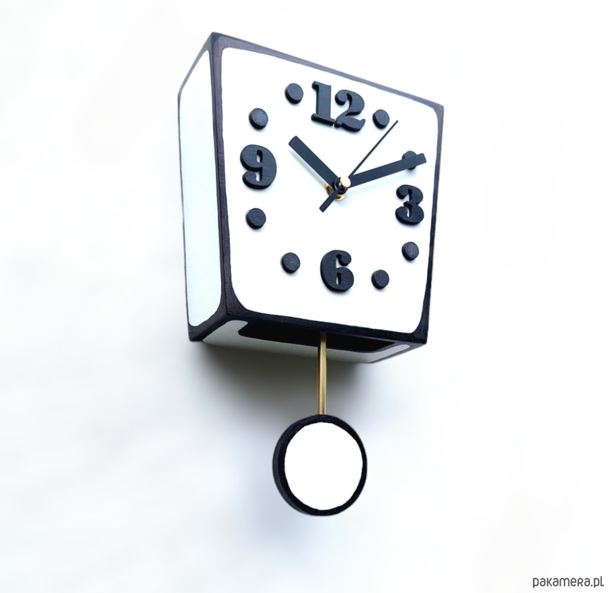 Wyjątkowy zegarek z wahadłem Black and White , pomalowany farbami akrylowymi, zabezpieczony ekologicznym lakierem. Wykonany ze sklejki drewnianej o wymiarach szer.16 cm, wys. (z wahadłem) 26cm, gł. 7cm.