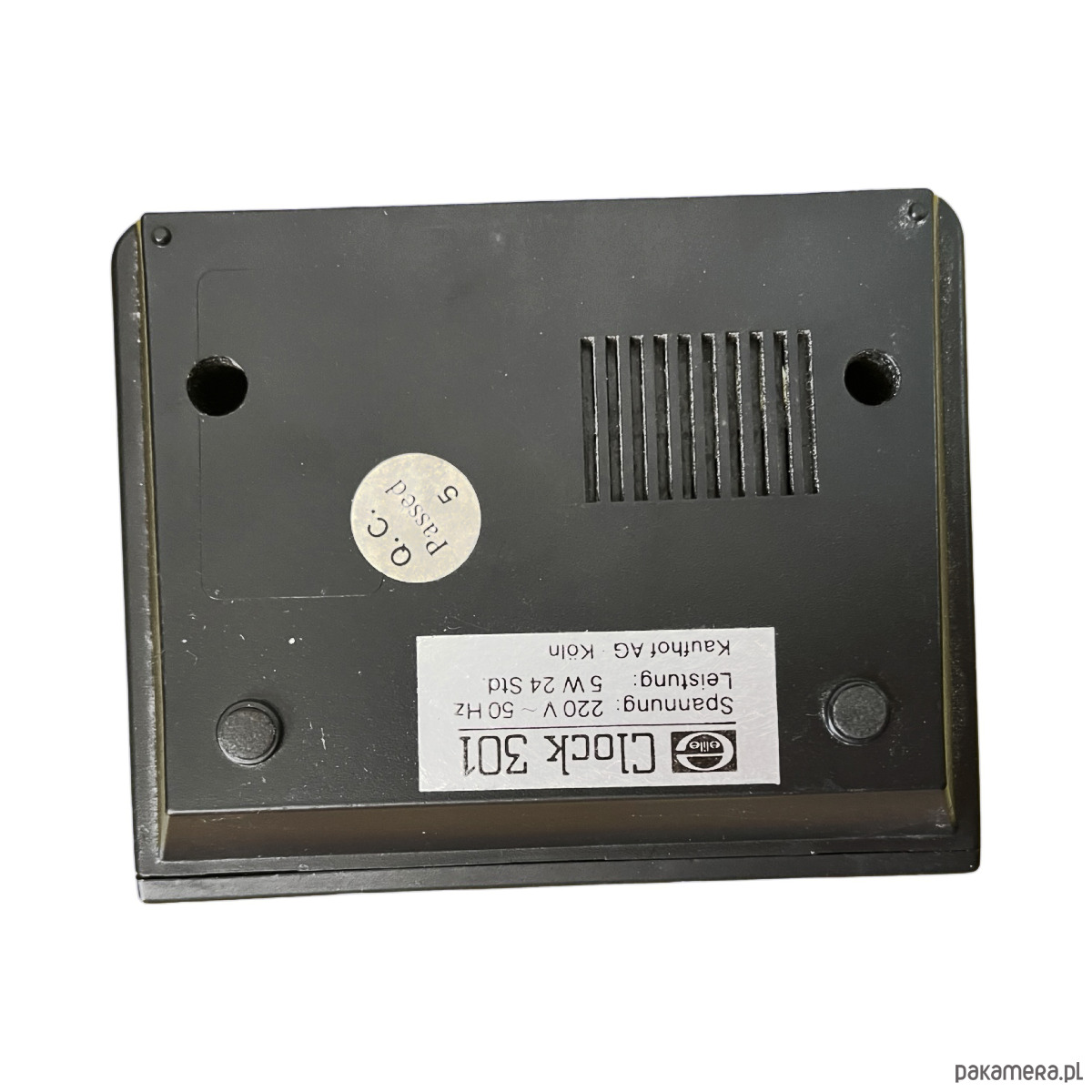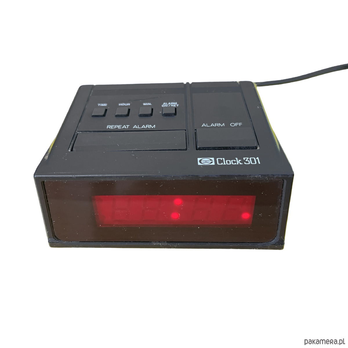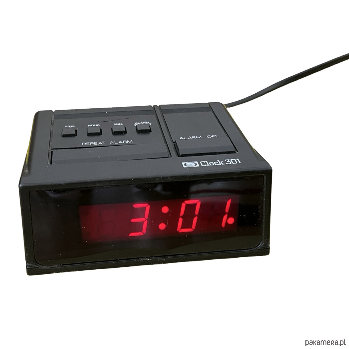 Ciekawy, zegar z funkcją budzika typ Clock 301 wyprodukowany w Nieczech na przełomie lat 70. i 80. dla firmy Elite. Budzik w stylu space age z elementami stylu popart, wykonany z wysokiej jakości tworzywa sztucznego w kolorze czarnym wykończone wyświetlaczem w kolorze czerwonym. Zegar z elektrycznym wyświetlaczem, w pełni sprawny w stanie ogólnym bardzo dobrym.