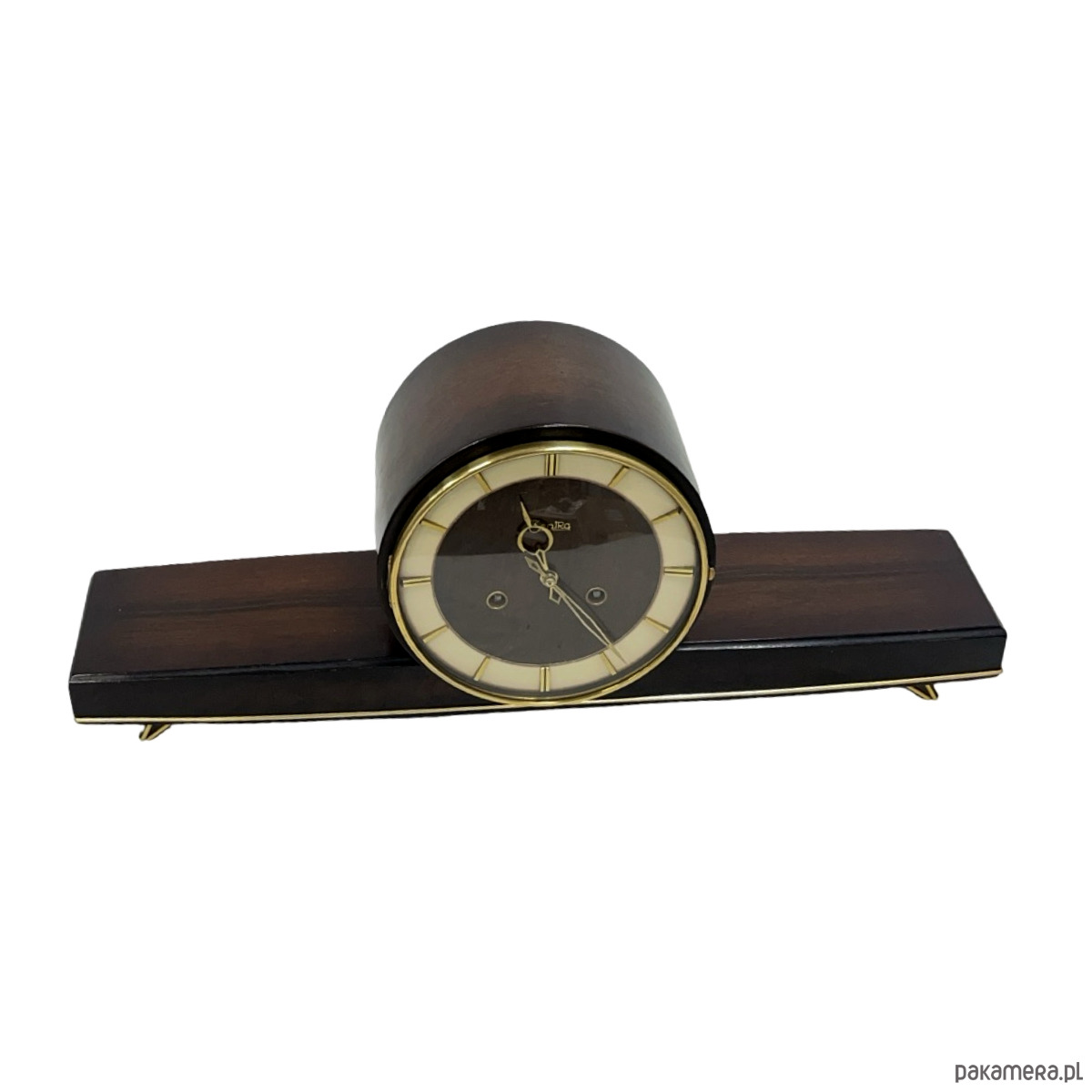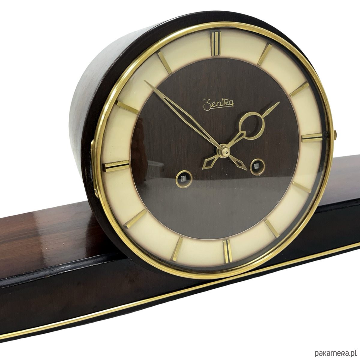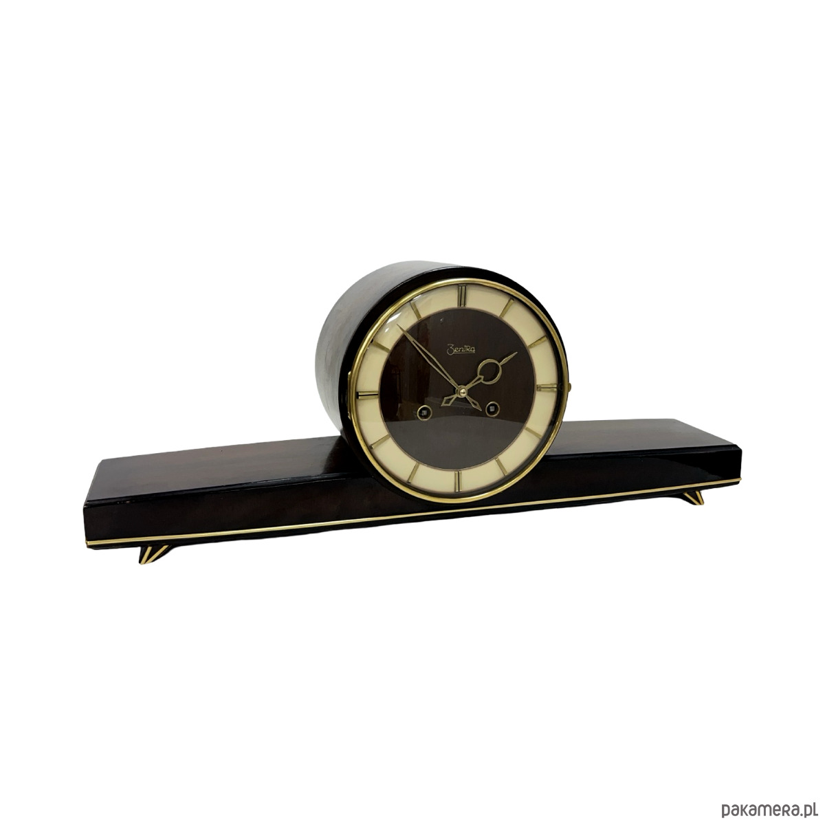 Zegar kominkowy Zentra — drewno lakierowane w kolorze czarnym z wysokim połyskiem, tarcza dwukolorowa (beżowo-złota i brązowa), indeksy i pierścień tarczy złocone, wskazówki złocone. Obudowa o wydłużonej horyzontalnej formie spoczywająca na złoconych nóżkach w kształcie stylizowanych klinów. Mechanizm nakręcany z biciem godzin i półgodzin, gong prętowy (dwa otwory nakręcania widoczne na tarczy). Na tarczy sygnatura: Zentra. Wymiary: 22 × 56 × 14 cm. Niemcy, lata 50. XX w. Stan bardzo dobry, mechanizm sprawny.