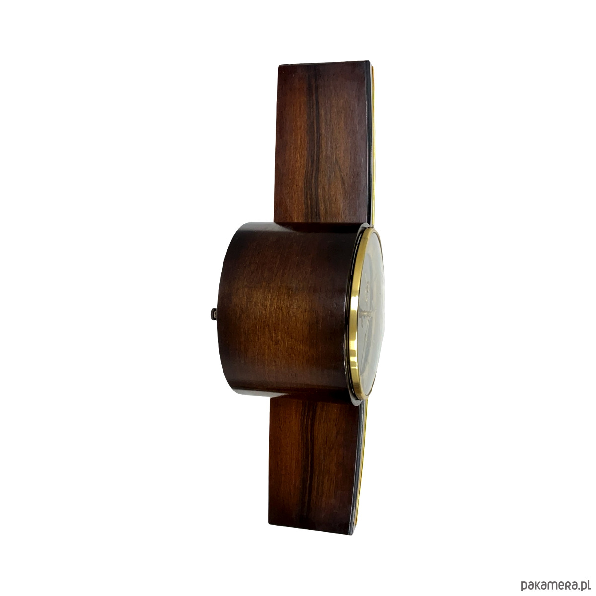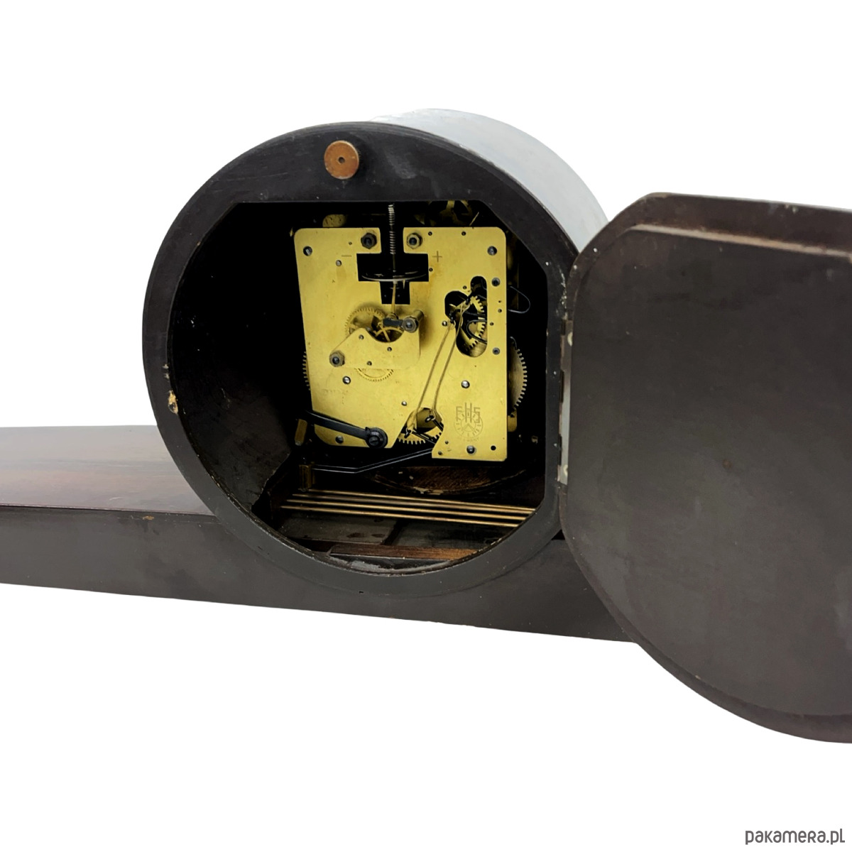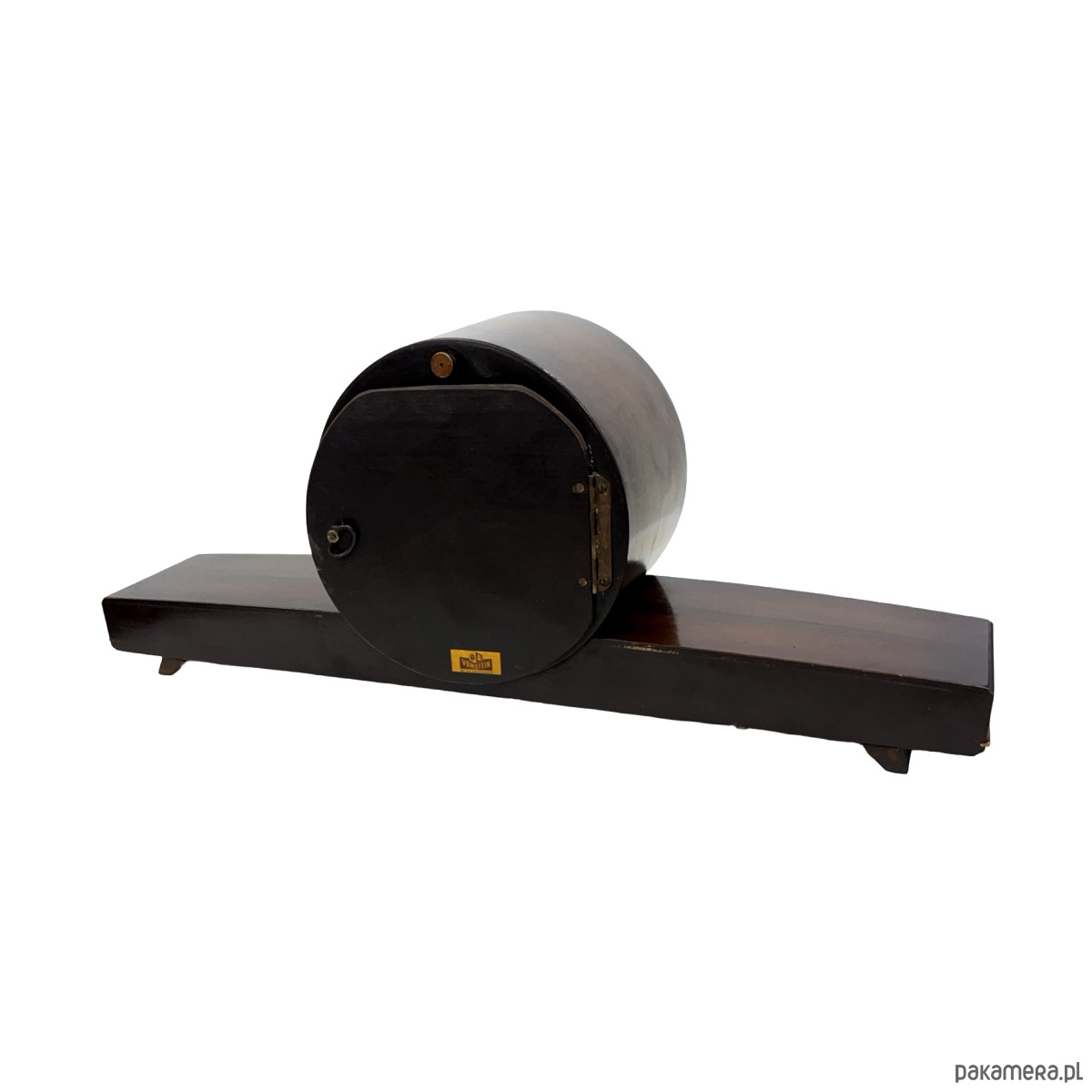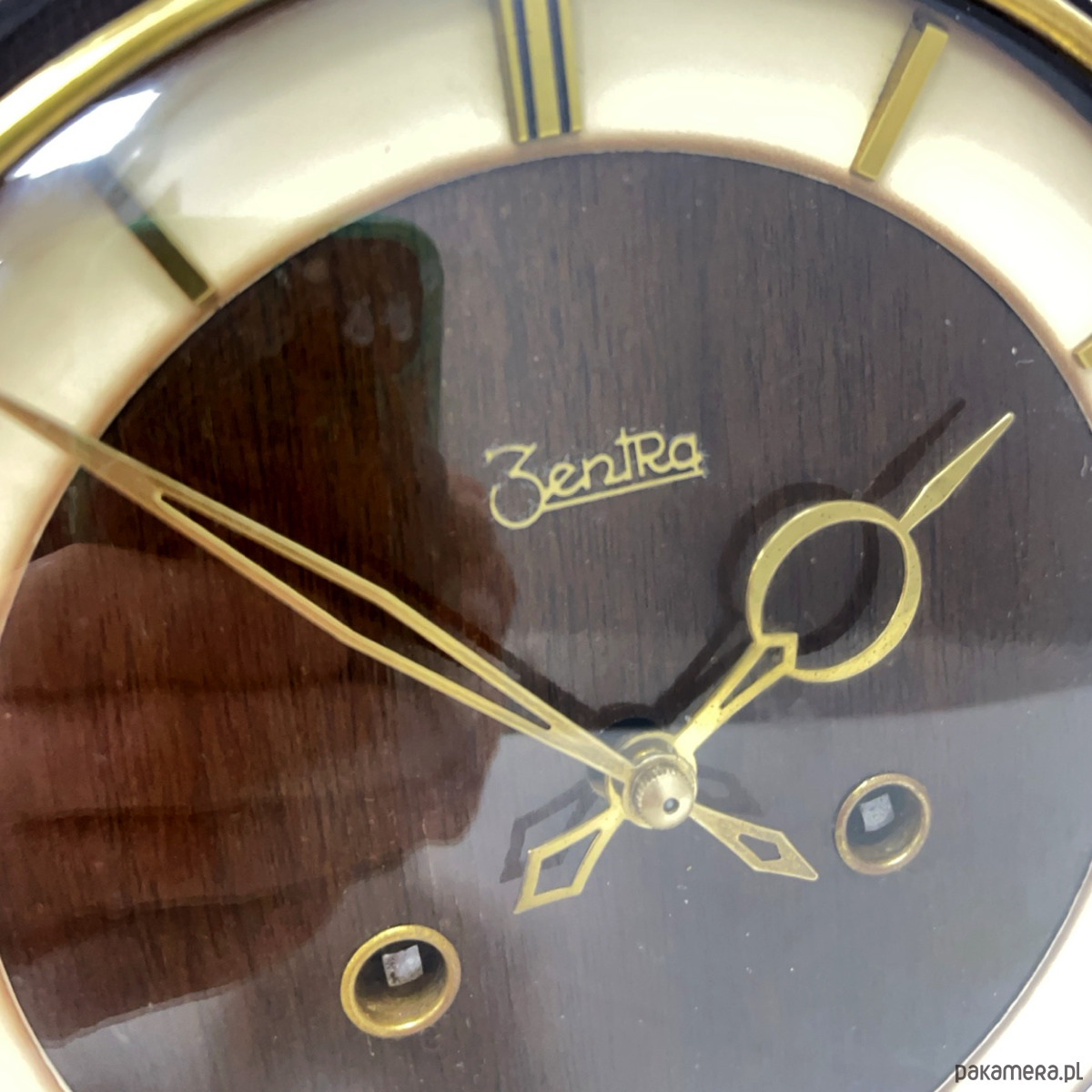 Zegar kominkowy Zentra — drewno lakierowane w kolorze czarnym z wysokim połyskiem, tarcza dwukolorowa (beżowo-złota i brązowa), indeksy i pierścień tarczy złocone, wskazówki złocone. Obudowa o wydłużonej horyzontalnej formie spoczywająca na złoconych nóżkach w kształcie stylizowanych klinów. Mechanizm nakręcany z biciem godzin i półgodzin, gong prętowy (dwa otwory nakręcania widoczne na tarczy). Na tarczy sygnatura: Zentra. Wymiary: 22 × 56 × 14 cm. Niemcy, lata 50. XX w. Stan bardzo dobry, mechanizm sprawny.