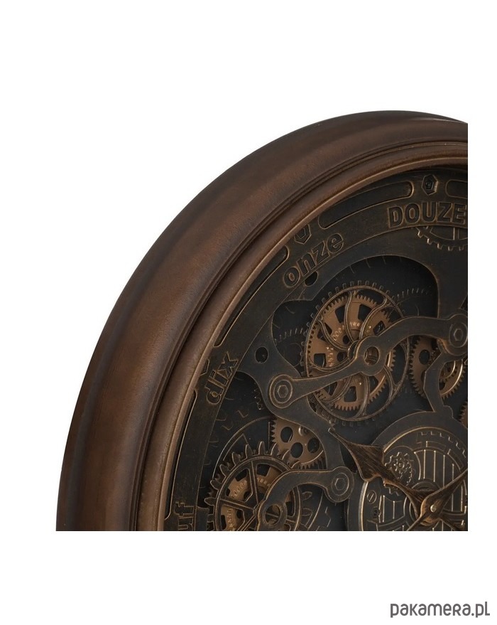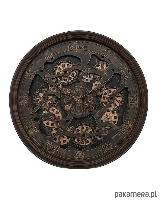 Bardzo ciekawy zegar ścienny o średnicy aż 76 cm. Wyróżnia się mechanizmem z widocznymi trybikami oraz ze starodawnymi wskazówkami. Wykonany z aluminium oraz polipropylenu. Przednia część szklana.