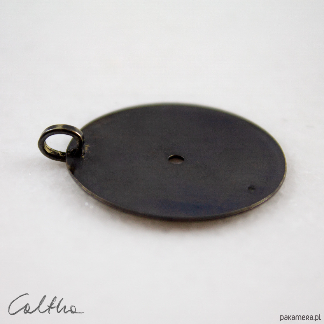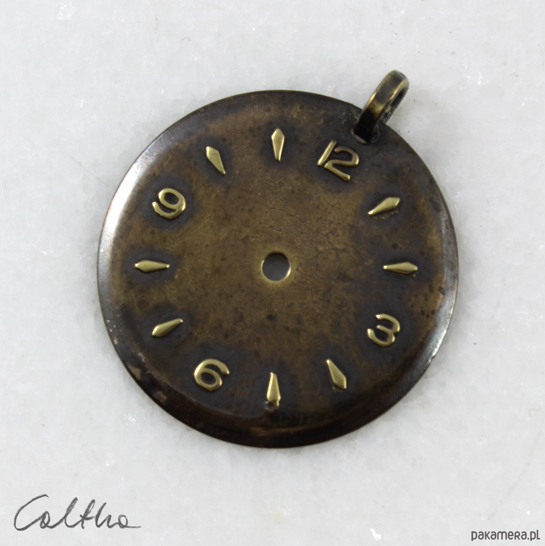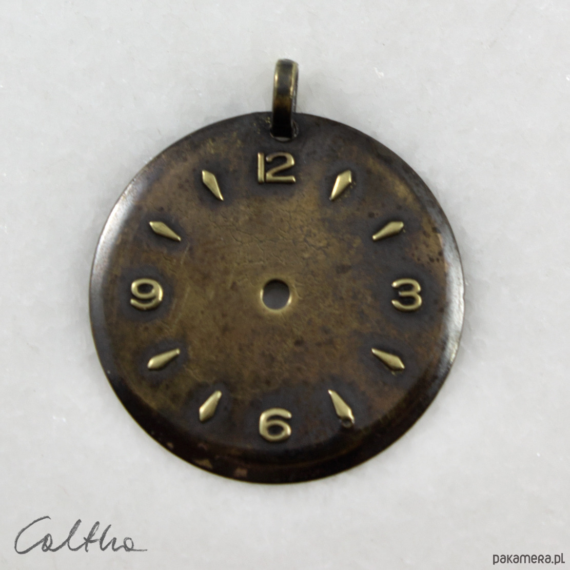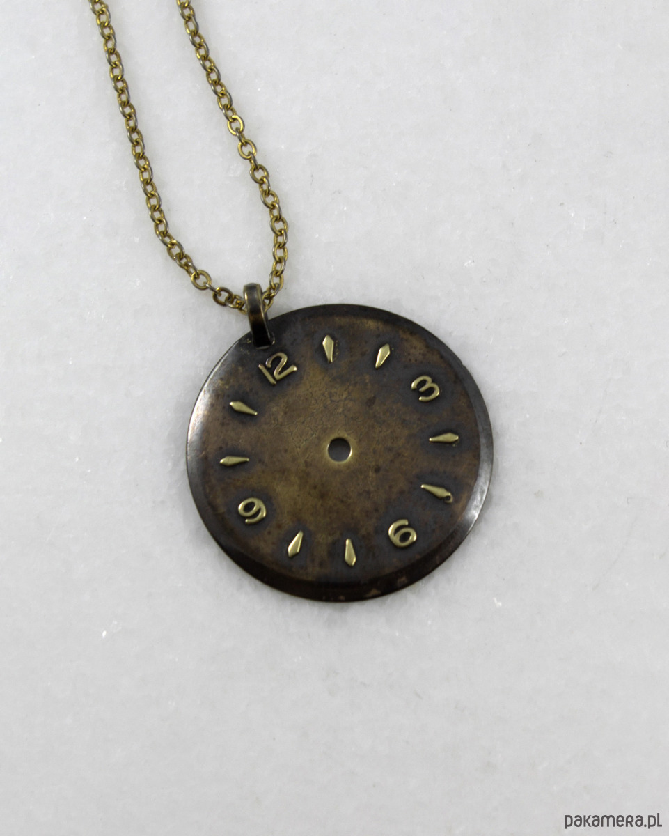 Zawieszka wykonana z tarczy starego zegarka wykonanej ze stopu miedzi. Tarcza została oczyszczona i pokryta ciemną patyną uzyskaną w procesie oksydacji (bez użycia sztucznych barwników).