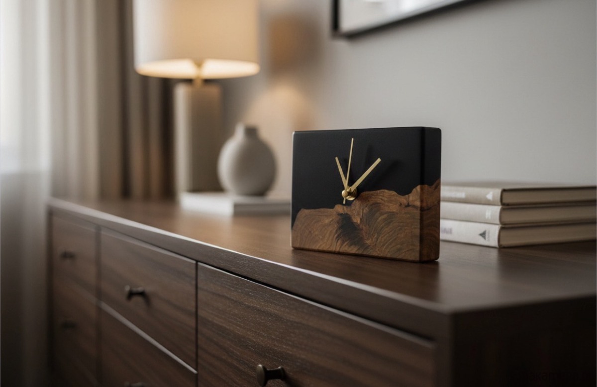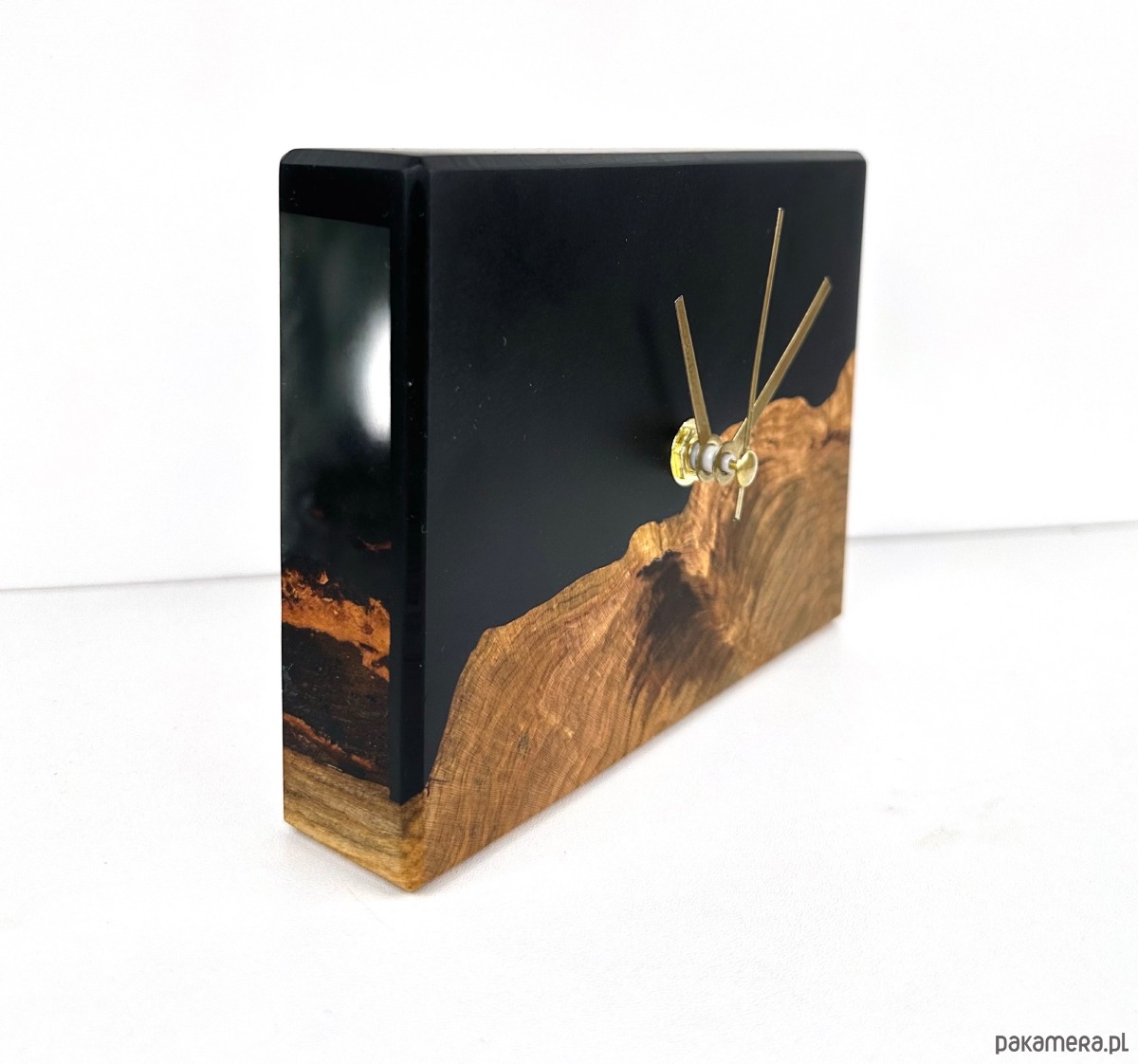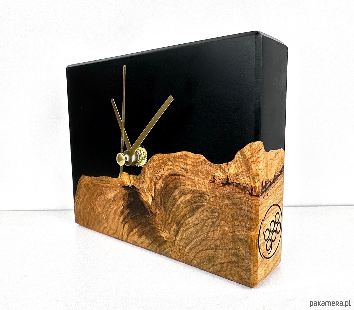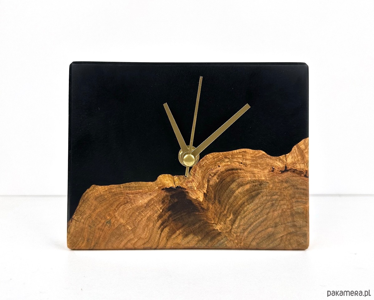 Minimalistyczny zegar na komodę lub biurko, który łączy naturalne drewno z elegancką czarną żywicą w macie. To unikatowy egzemplarz wykonany ręcznie – każdy fragment słojów drewna układa się inaczej, dlatego kupujesz jedyny w swoim rodzaju zegar, a nie masowy produkt z taśmy. Cichy mechanizm sprawia, że pracuje bez irytującego tykania, dzięki czemu idealnie nadaje się do sypialni, gabinetu, salonu czy miejsca pracy. Subtelne złote wskazówki pięknie kontrastują z głęboką czernią i ciepłą barwą drewna, tworząc nowoczesną, ale przytulną dekorację.