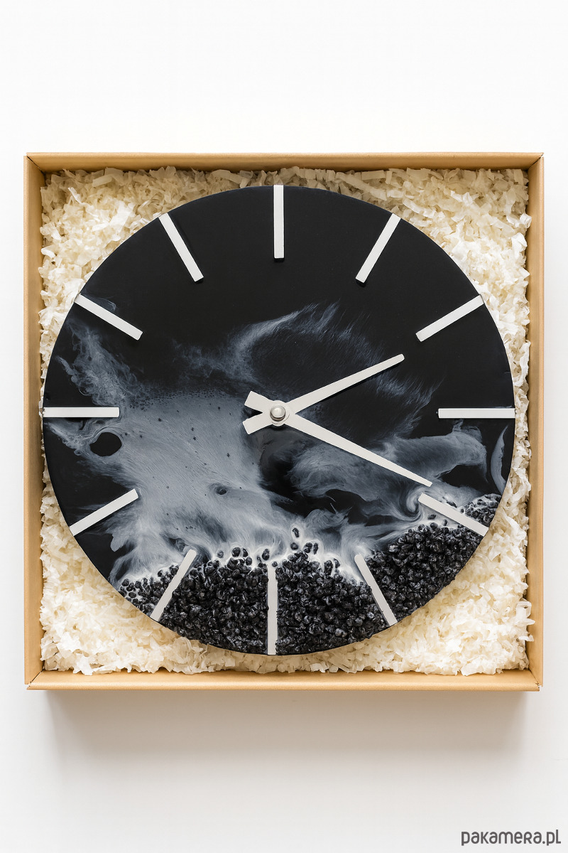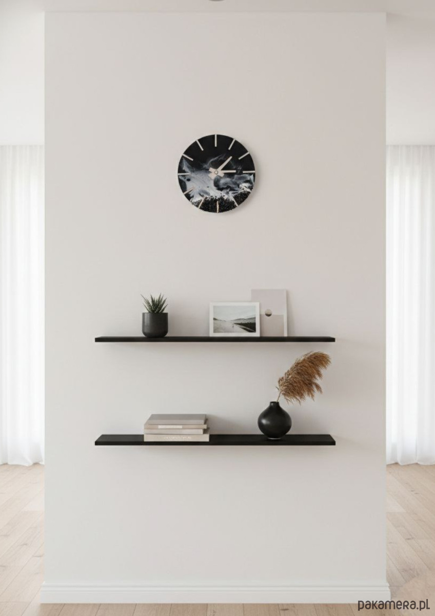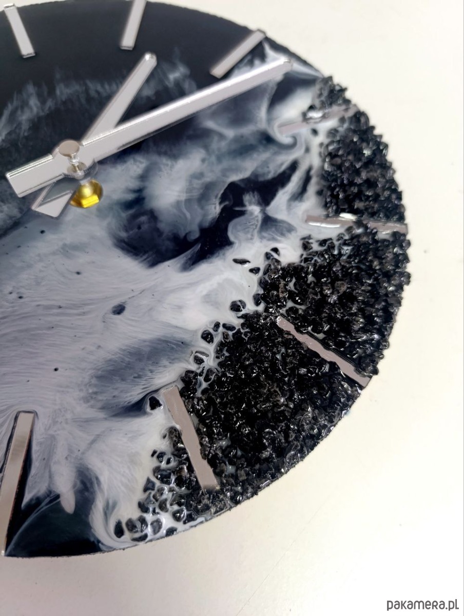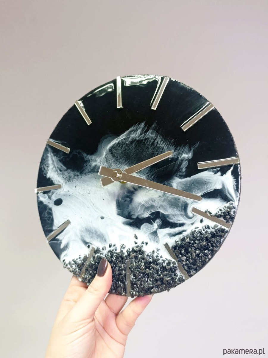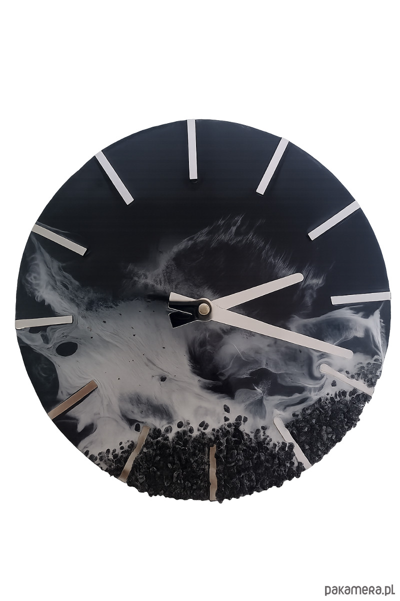 Nowoczesny, ręcznie wykonany zegar ścienny z żywicy epoksydowej, inspirowany surową estetyką natury. Głęboka czerń połączona z odcieniami grafitu i bieli tworzy dynamiczny efekt przypominający morskie fale uderzające o skalisty brzeg. Każdy zegar jest unikatowy – wzór powstaje spontanicznie i nie da się go powtórzyć.