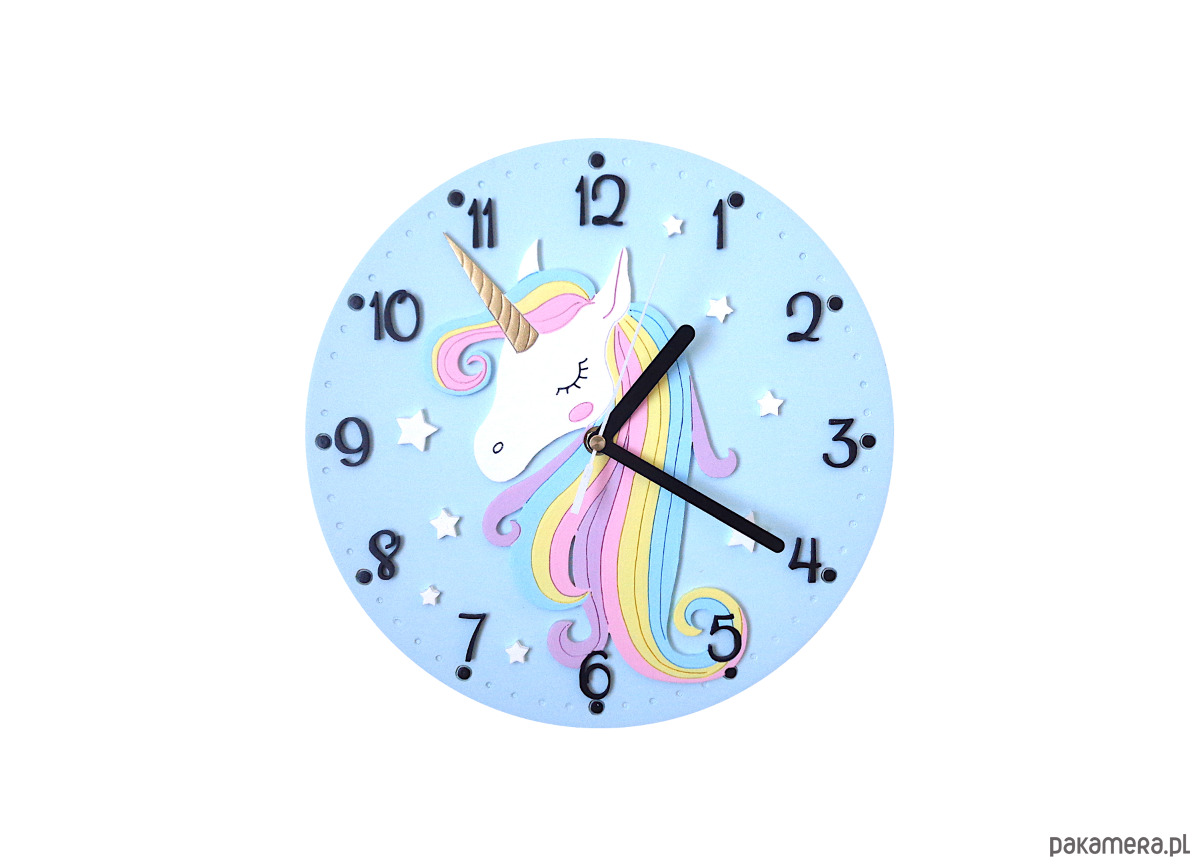 Przedstawiam Państwu uroczy zegar z jednorożcem idealny dla małej księżniczki:) Zegar jest wykonywany oraz malowany przeze mnie ręcznie w co wkładam duużo serca:) W zegarze dominują pastelowe kolory a cyfry oraz wskazówki w kolorze czarnym dobrze się odcinają co znacznie ułatwi dziecku odczytywanie godziny. Cyfry, gwiazdki oraz jednorożec są wycięte oraz naklejone na tarczę osobno co sprawia, że zegar wygląda wyjątkowo:) Tarcza pomalowana jest na kolor miętowy. Jestem otwarta na wszelkie zmiany kolorystyczne- zegar możemy dopasować do Państwa wymagań. Istnieje również możliwość wykonania zegara z dowolnym wzorem- z przyjemnością zrealizuję Państwa wizję:) Średnica tarczy to 27 cm, w zegarze zamontowany jest mechanizm bezgłośny, płynący. W naszym sklepie znajdziecie Państwo również ten model w kolorze różowym oraz miętowym, zapraszam :)