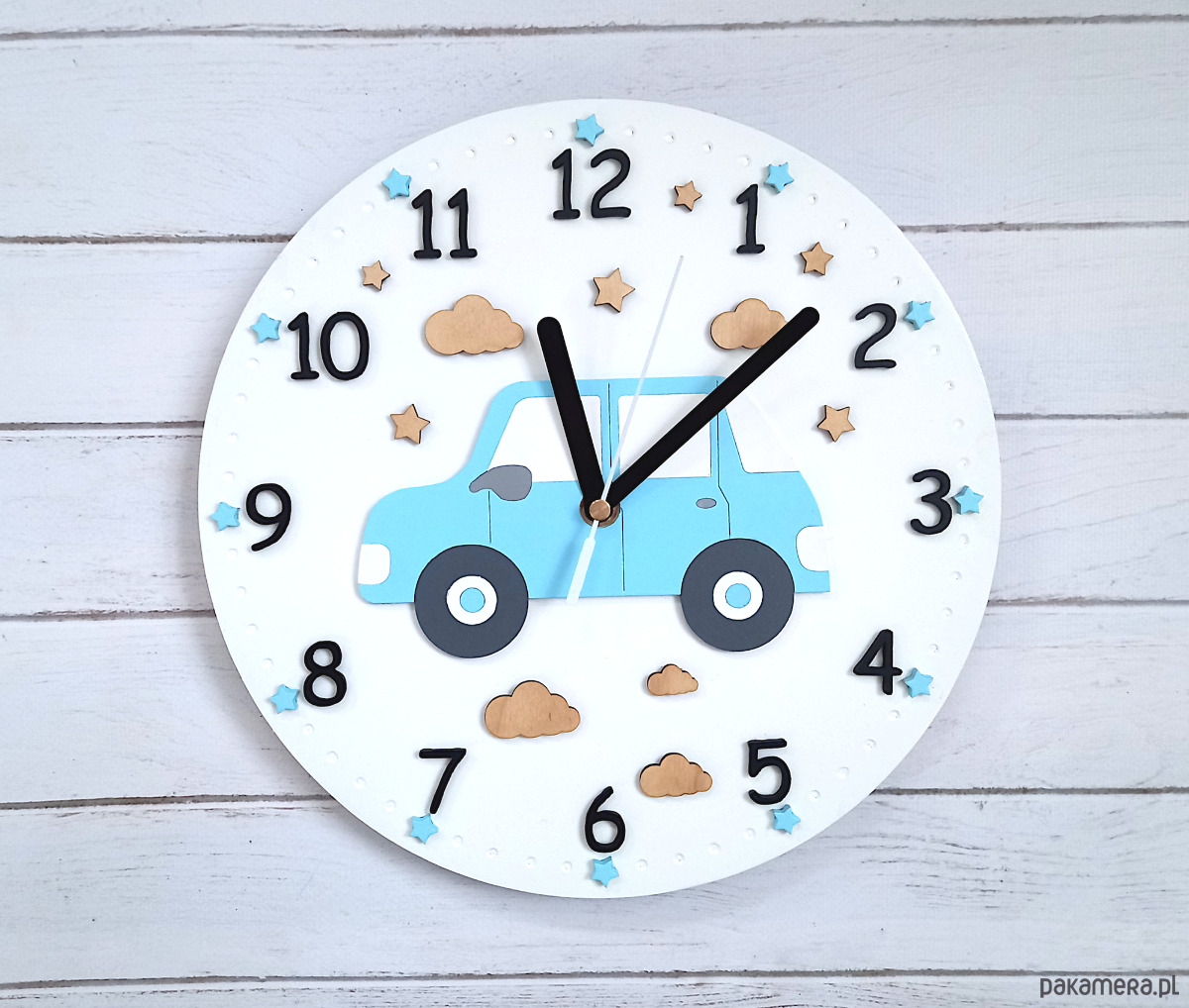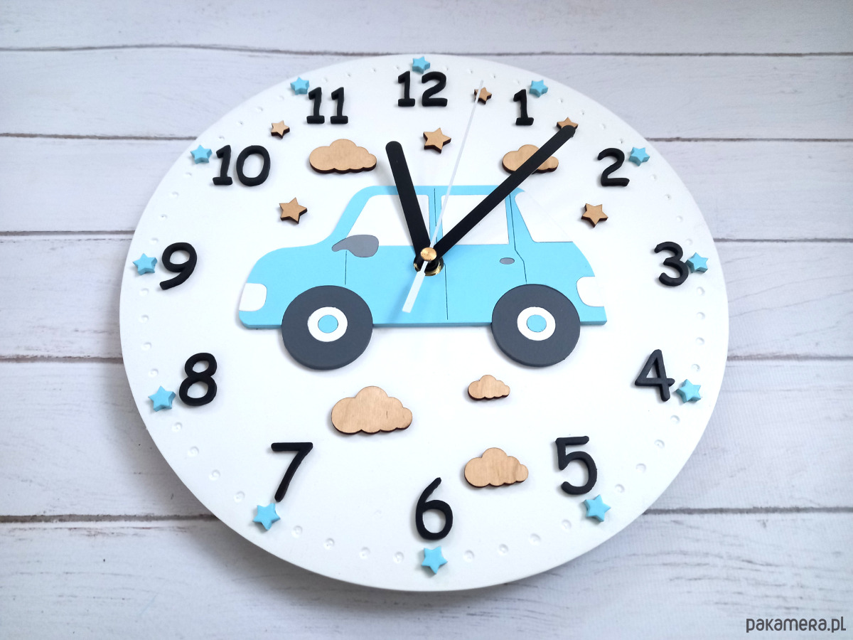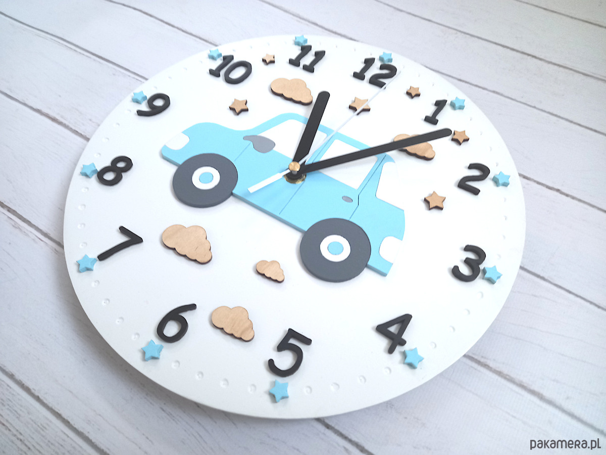 Witam:) Przedstawiam Państwu zegar ścienny dla małego szkraba z samochodem. Zegar jest wykonywany oraz malowany przeze mnie ręcznie w co wkładam dużo serca:) Tarcza pomalowana jest na kolor biały, samochód w kolorze niebieskim, gwiazdki i chmurki w naturalnym drewnie ładnie współgrają kolorystycznie. Cyferki w kolorze czarnym są dobrze widoczne i czytelne co znacznie ułatwi Państwa dziecku naukę odczytywania godzin. Cyferki, autko, chmurki oraz gwiazdki są wycięte i naklejone na tarczę osobno co tworzy fajny efekt:) Średnica tarczy to 27 cm a w zegarze zamontowany jest mechanizm bezgłośny, płynący.