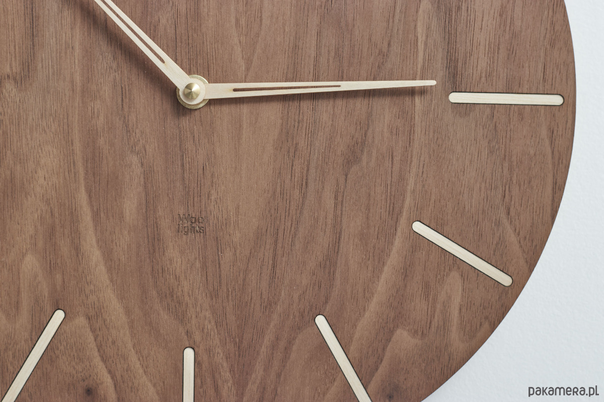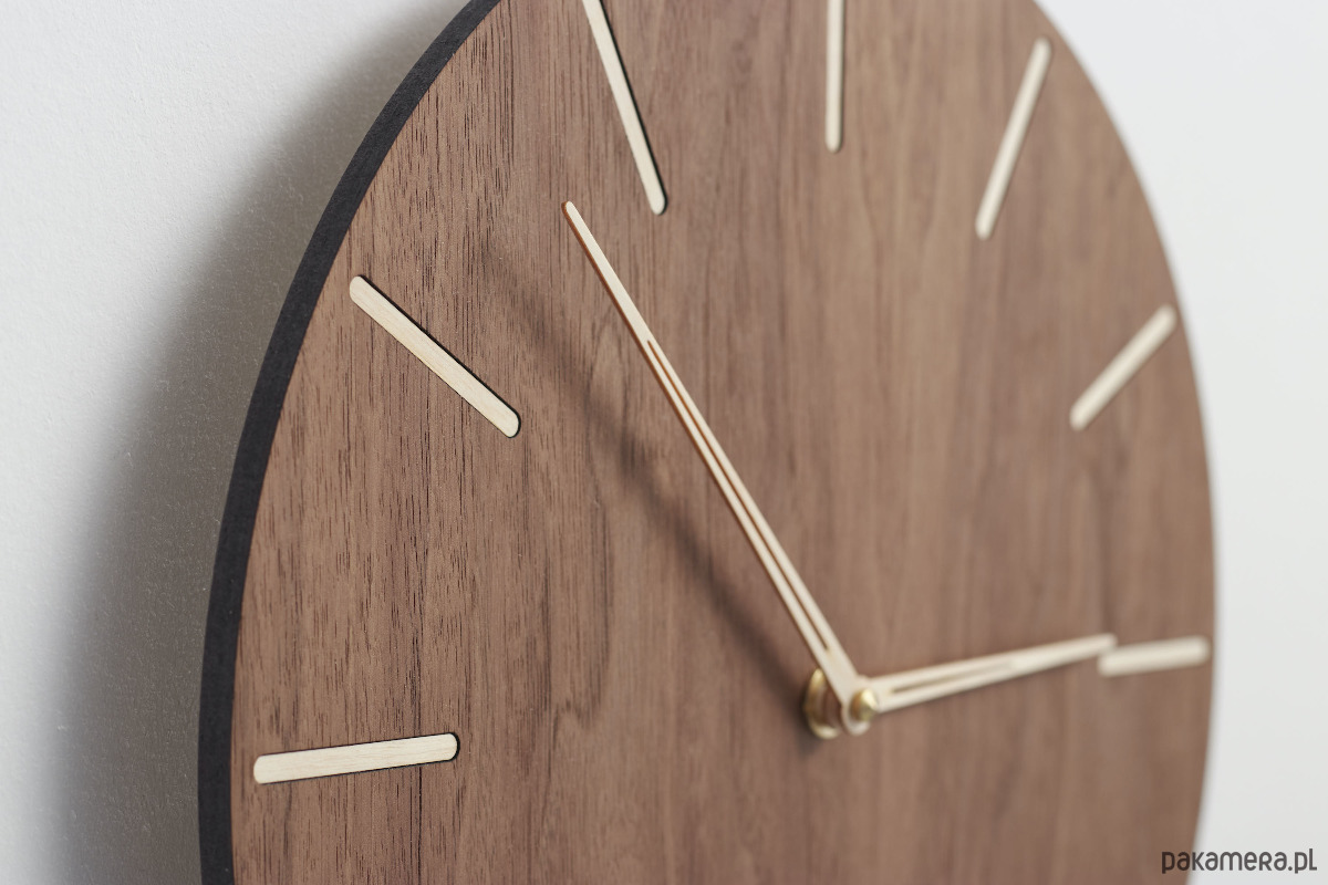 Zegar ścienny wykonany z drewna z prostymi znacznikami za specjalnie zaprojektowanymi smukłymi wskazówkami.