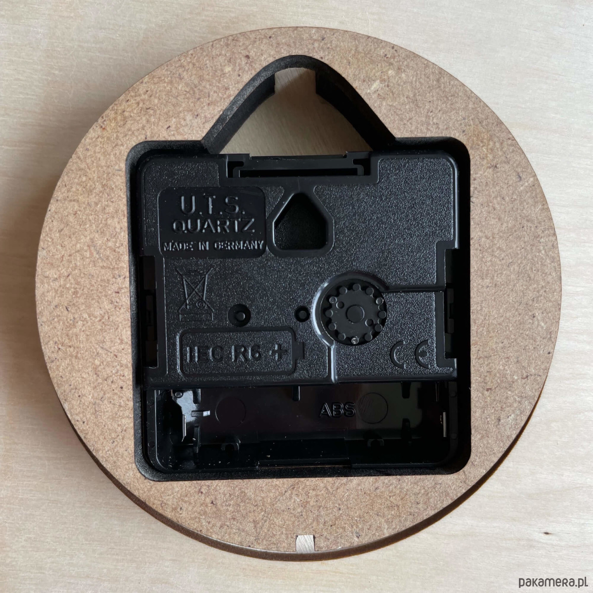 Prosty zegar ścienny z fornirowanej płyty MDF.