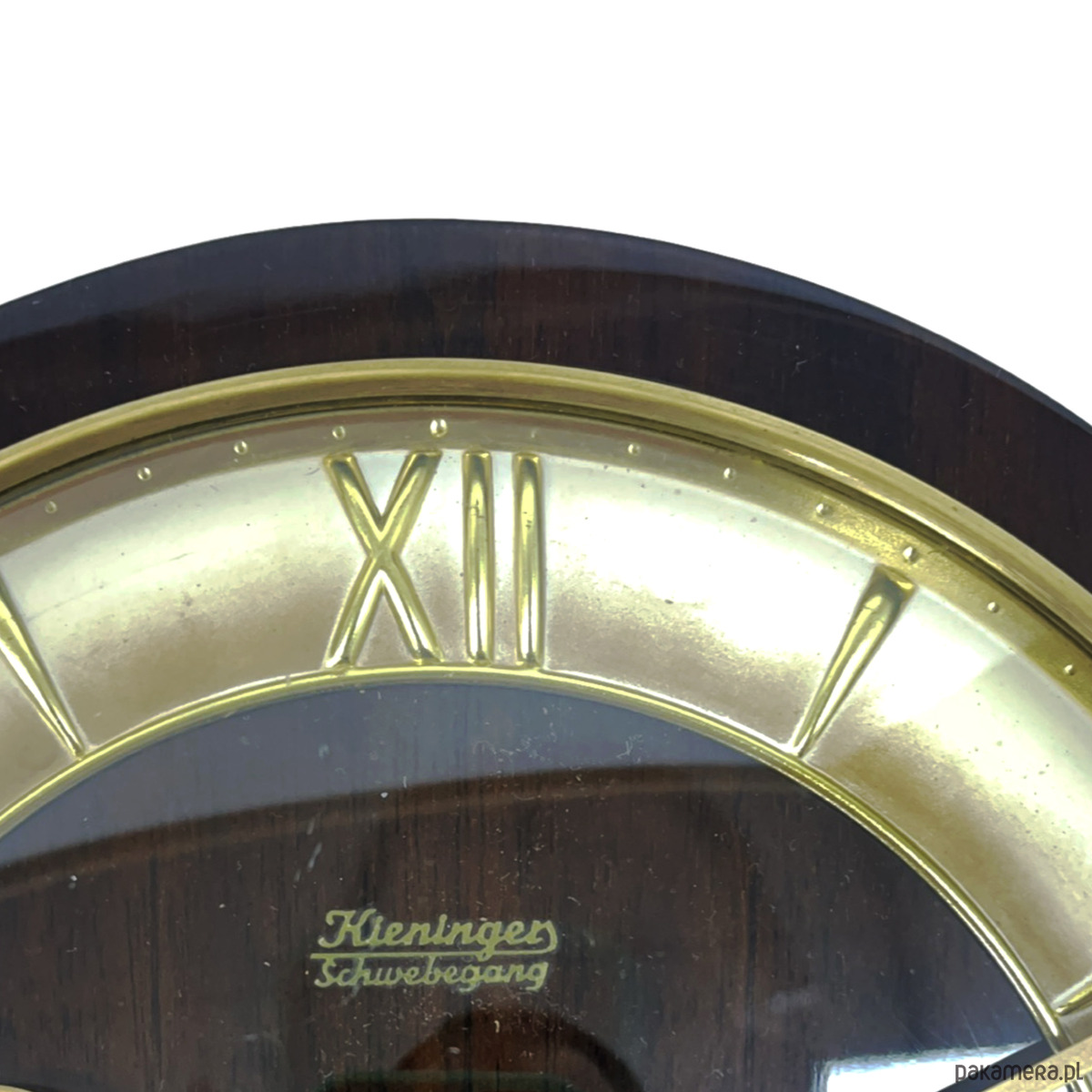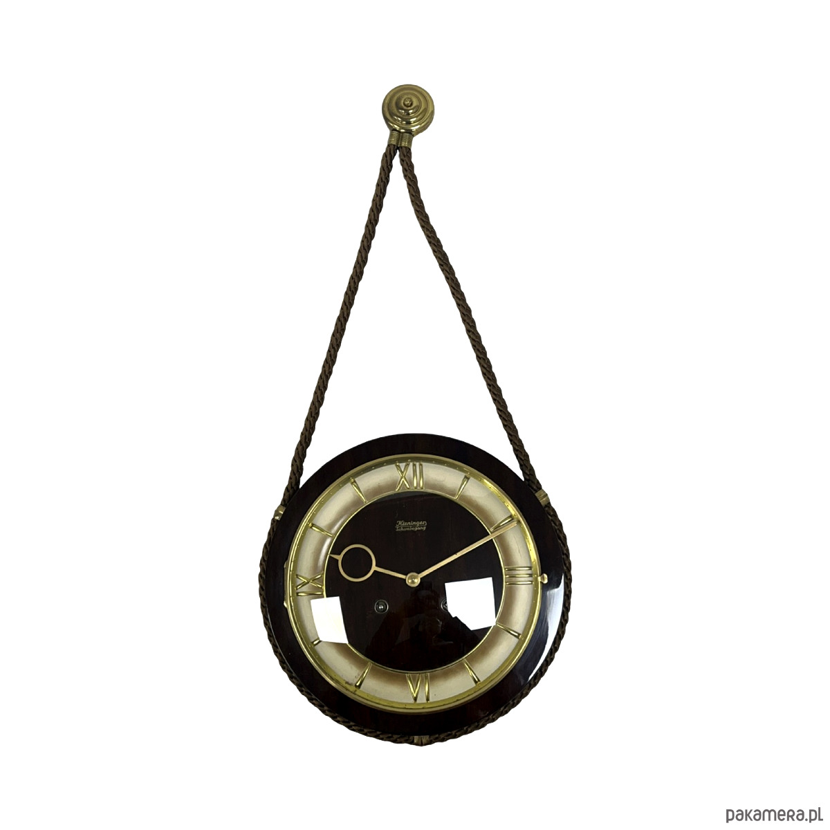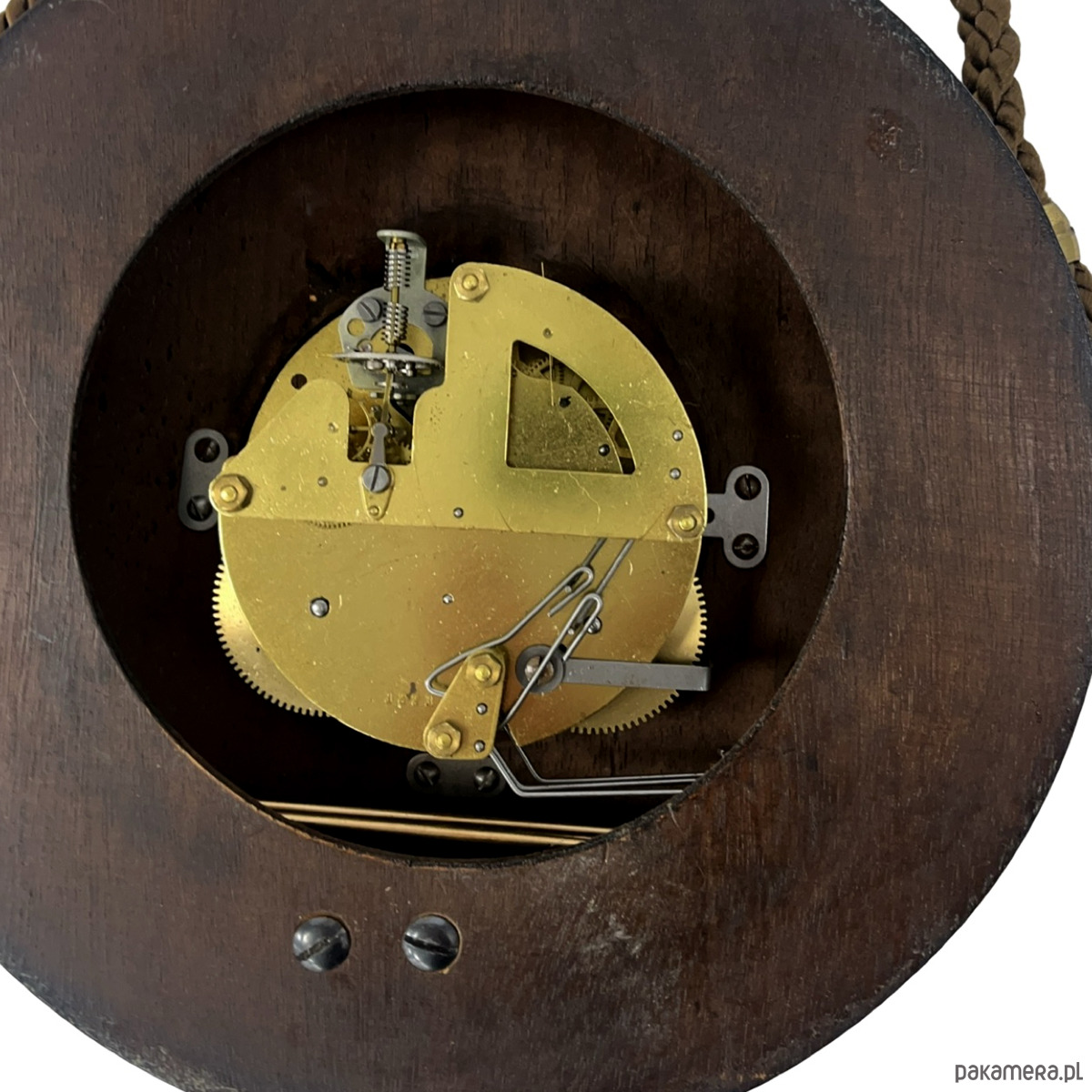 Zegar ścienny Kienzle z mechanizmem Schwebegang — drewno lakierowane w kolorze ciemnobrązowym, pierścień tarczy i wskazówki złocone (mosiądz), cyfry rzymskie złocone, zawieszenie na plecionym sznurze z mosiężnymi zaczepami. Charakterystyczna okrągła forma inspirowana zegarami okrętowymi (ship's clock) zawieszana na linie. Tarcza dwukolorowa: zewnętrzny pierścień złocisty z cyframi rzymskimi, środek ciemnobrązowy. Mechanizm precyzyjny Schwebegang (floating balance). Wymiary: 56 × 25 × 6 cm (łącznie z zawieszeniem). Niemcy, lata 50./60. XX w. Stan bardzo dobry, mechanizm sprawny.