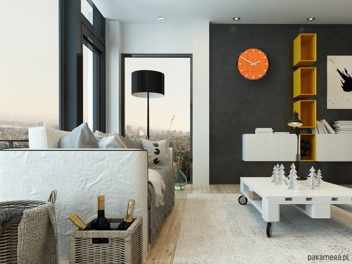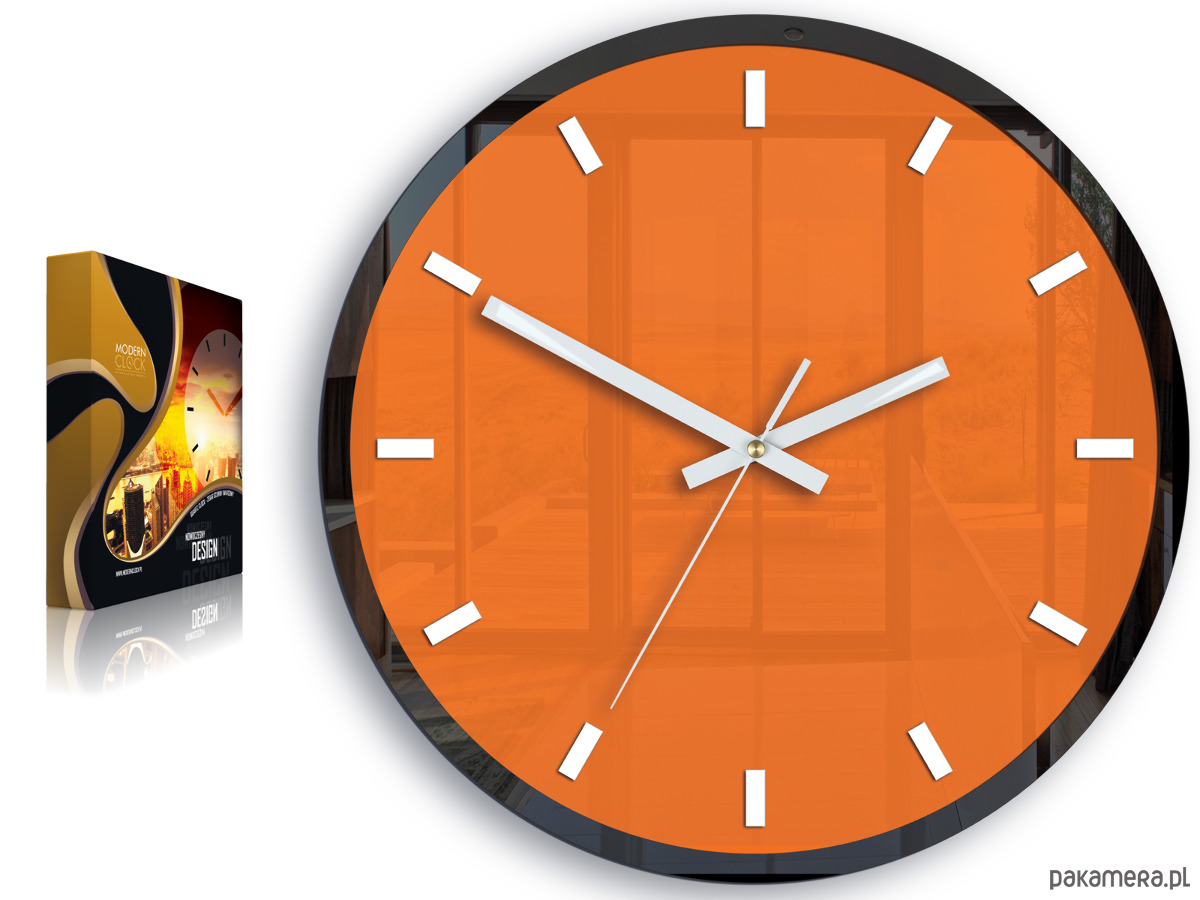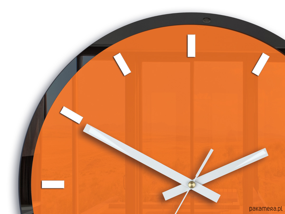 Zegar ten to połączenie pomarańczowej tarczy ze szkła akrylowego z indeksami w kolorze białym. Całość zegara została dopracowana ciekawą czarną oblamówką w wysokim połysku, co daje zegarowi trójwymiarowości.