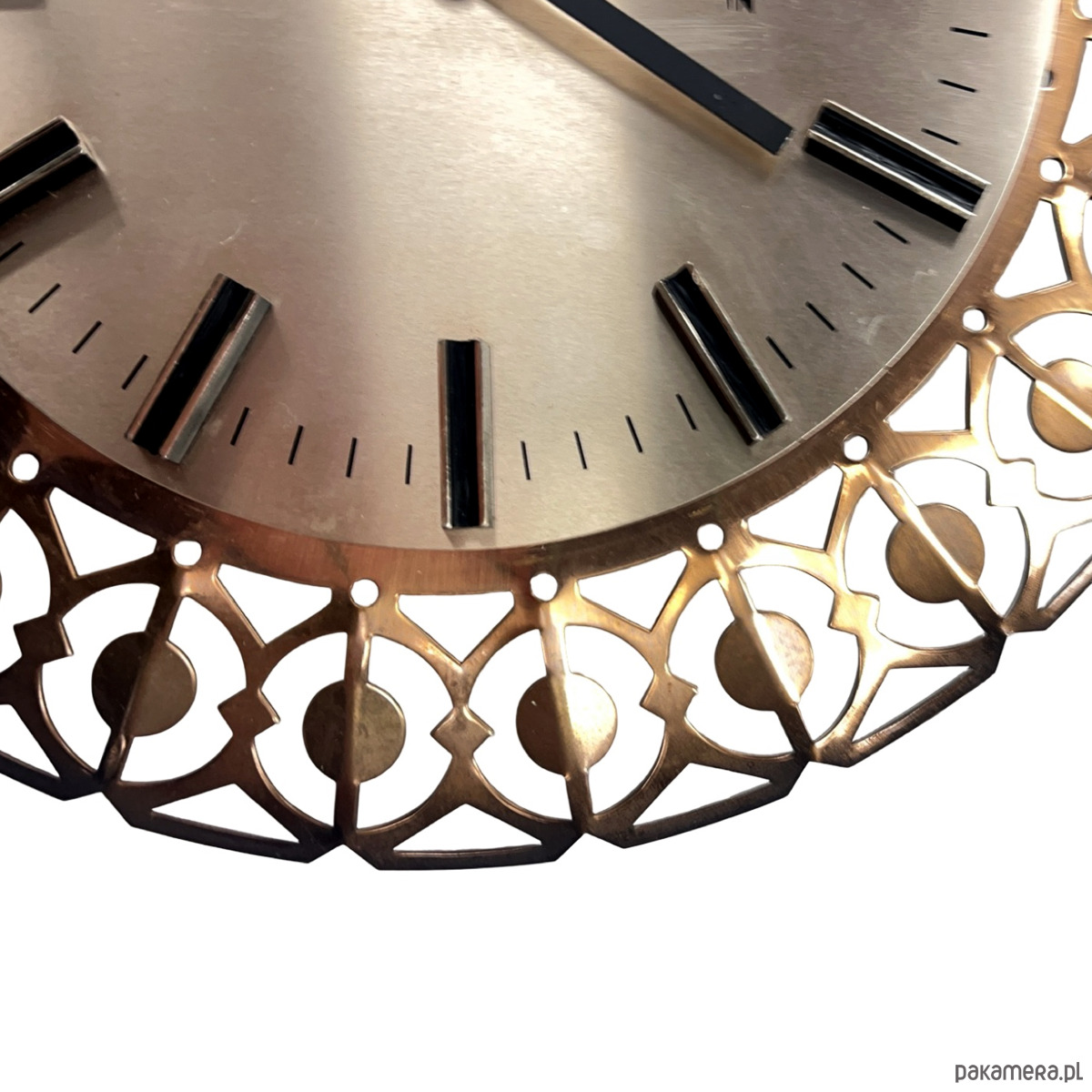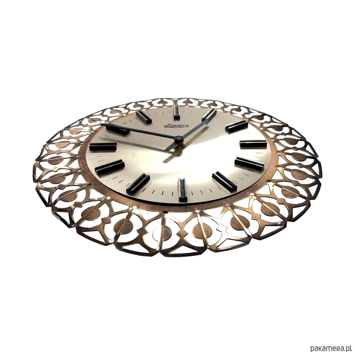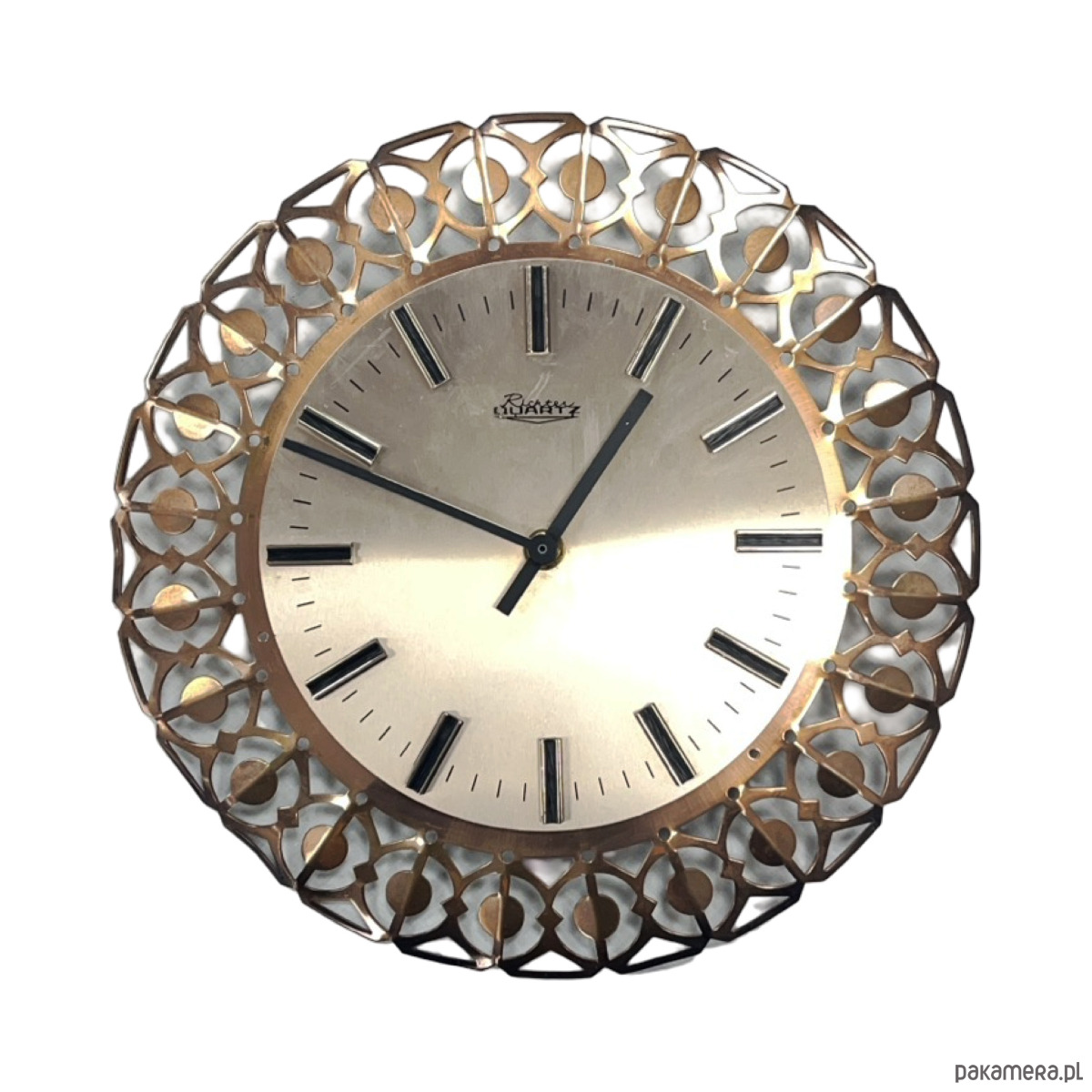 Zegar ścienny Richter — mosiądz ażurowy (filigree), metalowa tarcza srebrzona, czarne indeksy prostokątne, wskazówki czarne, mechanizm kwarcowy. Rama z mosiądzu w formie dekoracyjnego, ażurowego ornamentu geometrycznego z okrągłymi elementami osadzonymi w łukach — charakterystyczny wzór przypominający koronkę. Tarcza metalowa o gładkiej, srebrzystej powierzchni z czarnymi indeksami bez cyfr. Na tarczy sygnatura: Richter. Richter to niemiecki producent zegarów z Niemiec Zachodnich, znany z dekoracyjnych zegarów ściennych z mosiężnymi ażurowymi ramami. Wymiary: 29 × 29 × 3 cm. RFN (Niemcy Zachodnie), lata 60. XX w. Stan bardzo dobry, mechanizm sprawny.