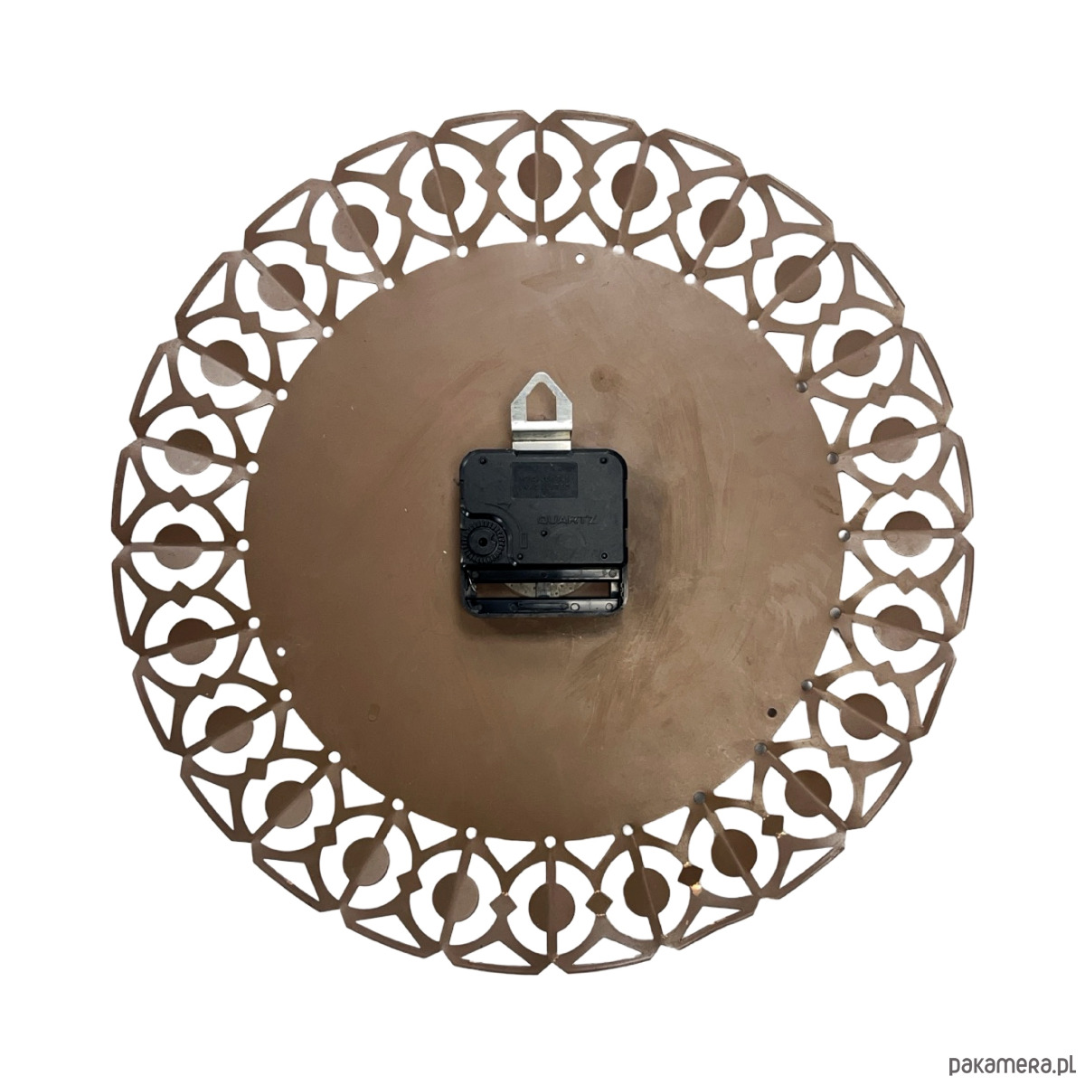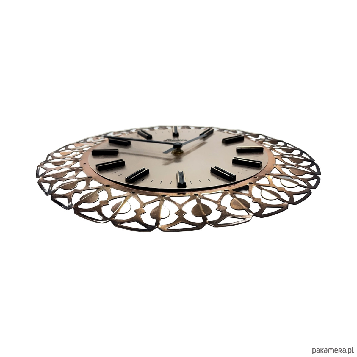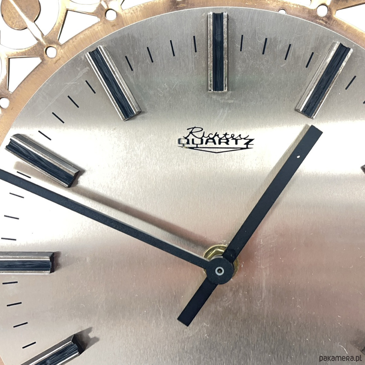 Zegar ścienny Richter — mosiądz ażurowy (filigree), metalowa tarcza srebrzona, czarne indeksy prostokątne, wskazówki czarne, mechanizm kwarcowy. Rama z mosiądzu w formie dekoracyjnego, ażurowego ornamentu geometrycznego z okrągłymi elementami osadzonymi w łukach — charakterystyczny wzór przypominający koronkę. Tarcza metalowa o gładkiej, srebrzystej powierzchni z czarnymi indeksami bez cyfr. Na tarczy sygnatura: Richter. Richter to niemiecki producent zegarów z Niemiec Zachodnich, znany z dekoracyjnych zegarów ściennych z mosiężnymi ażurowymi ramami. Wymiary: 29 × 29 × 3 cm. RFN (Niemcy Zachodnie), lata 60. XX w. Stan bardzo dobry, mechanizm sprawny.