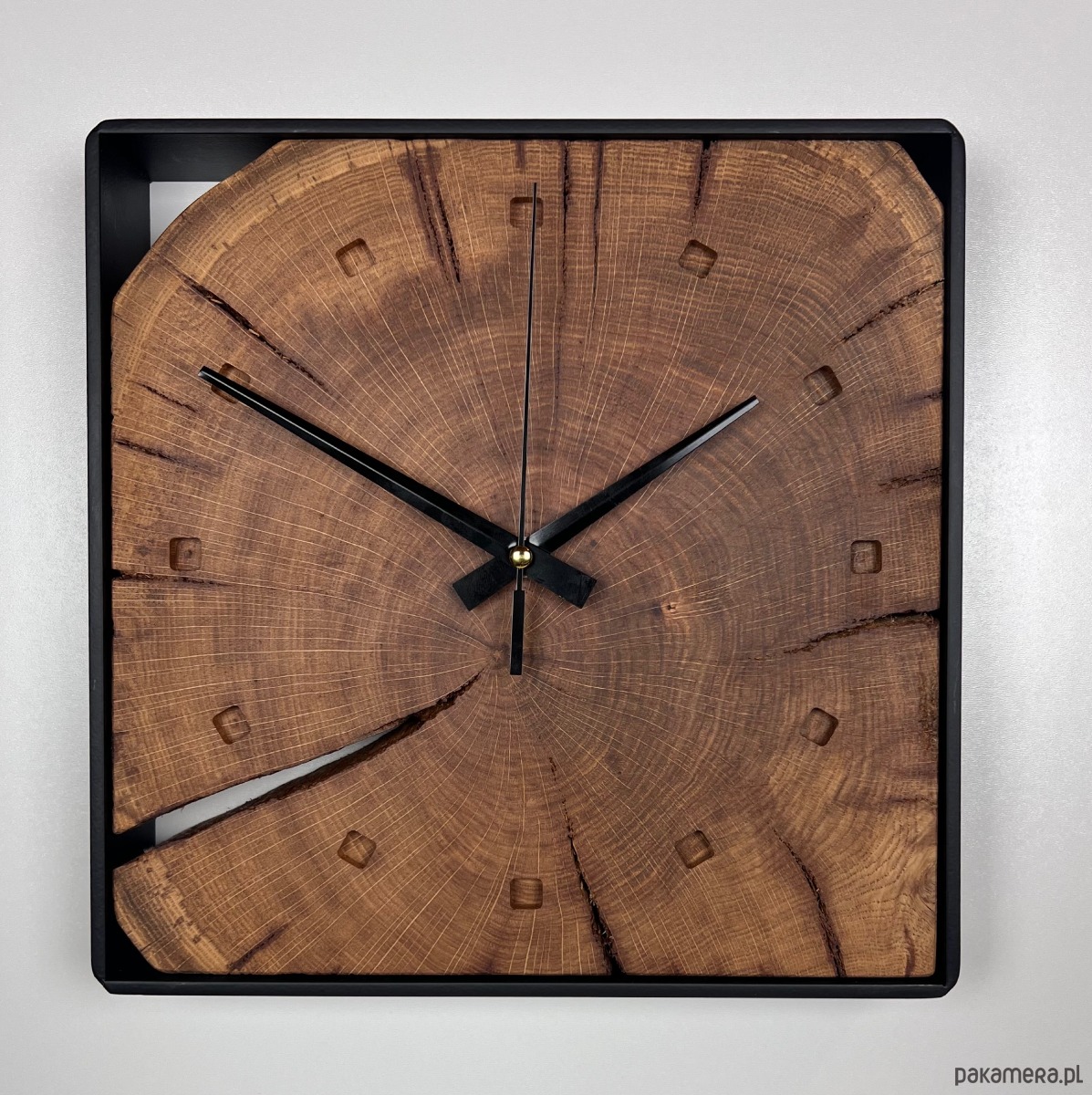 Drewno zostało zabezpieczone wysokiej jakości olejem Rubio Monocoat, który podkreśla naturalną strukturę dębu, chroni powierzchnię i zapewnia trwałość na lata. Znaczniki godzin są precyzyjnie wyfrezowane, co nadaje zegarowi elegancki, spójny wygląd bez zbędnych dodatków.