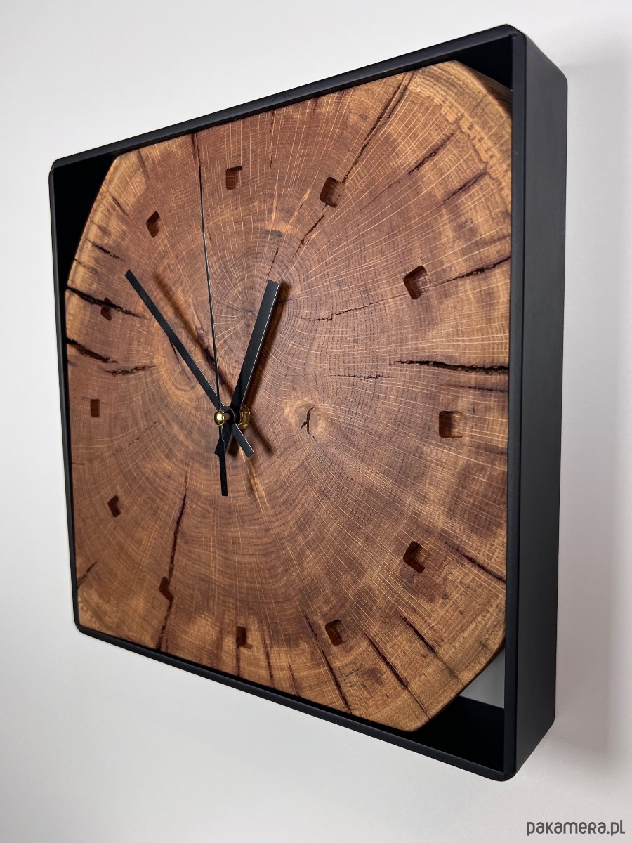 Drewno zostało zabezpieczone wysokiej jakości olejem Rubio Monocoat, który podkreśla naturalną strukturę dębu, chroni powierzchnię i zapewnia trwałość na lata. Znaczniki godzin są precyzyjnie wyfrezowane, co nadaje zegarowi elegancki, spójny wygląd bez zbędnych dodatków.