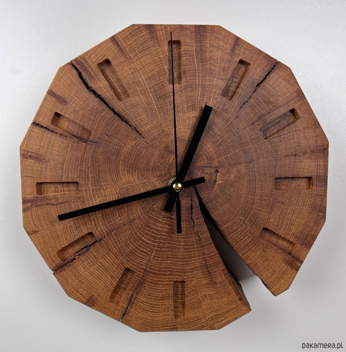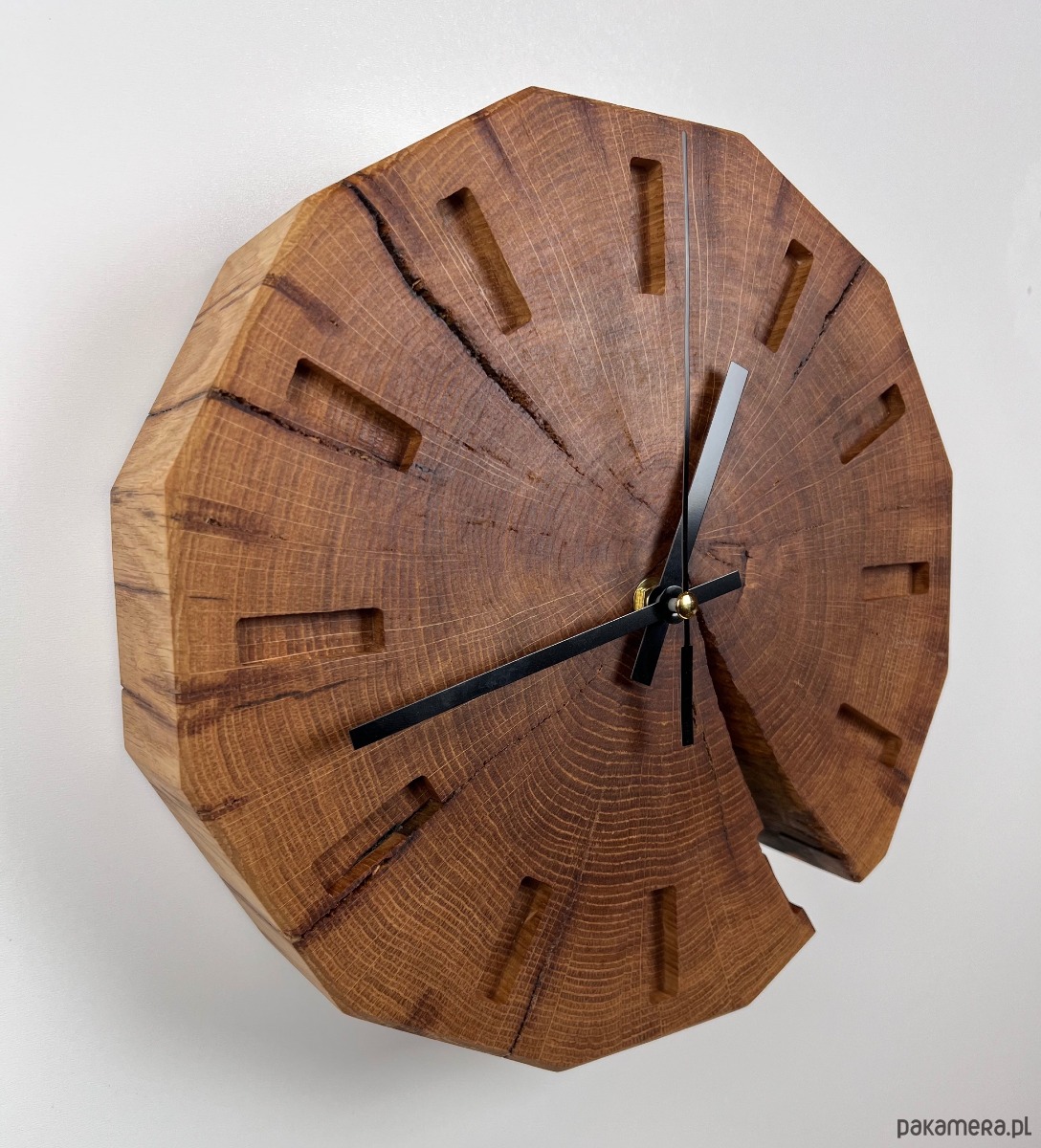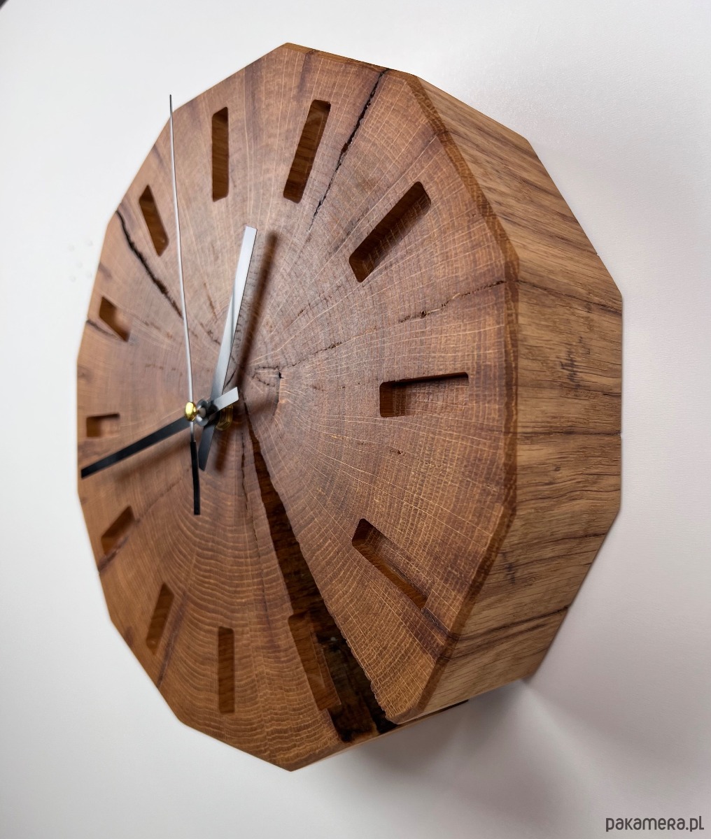 Dwunastokątna, geometryczna forma nadaje mu nowoczesnego charakteru i subtelnie kontrastuje z organiczną strukturą litego dębu. Delikatnie frezowane indeksy godzinowe oraz minimalistyczne, czarne wskazówki gwarantują doskonałą czytelność i ponadczasową estetykę. To zegar handmade z drewna, który doskonale wpisuje się w styl nowoczesny, loftowy i minimalistyczny.