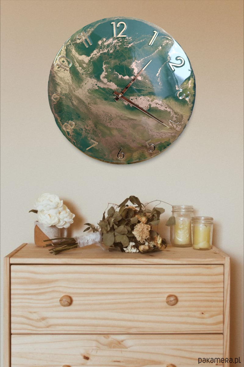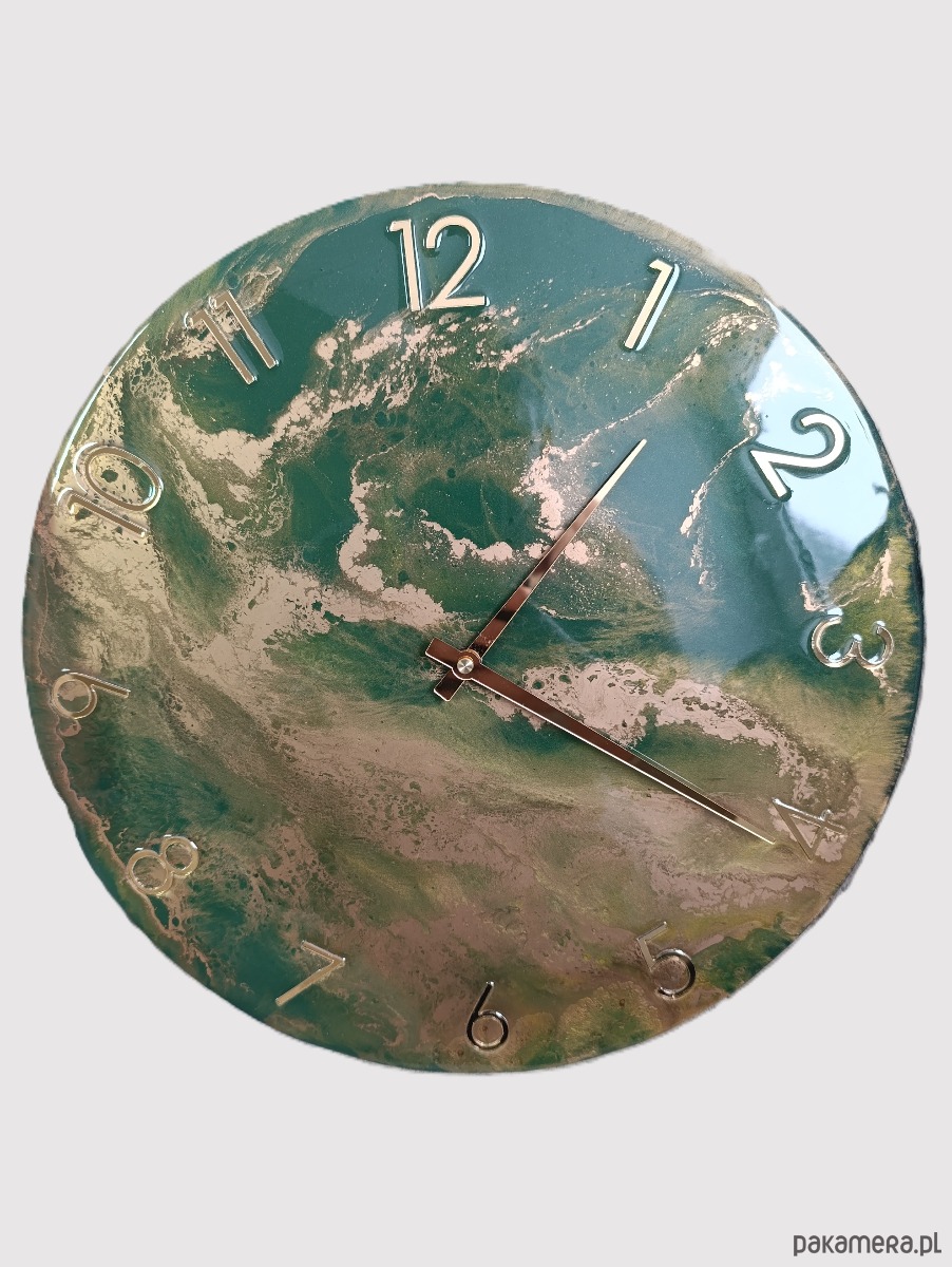 Wyjątkowy, artystyczny zegar ścienny wykonany ręcznie z wysokiej jakości żywicy epoksydowej. Dynamiczny, abstrakcyjny wzór inspirowany naturą łączy odcienie zieleni, beżu i błękitu, tworząc efekt głębi przypominający pejzaż widziany z lotu ptaka. To dekoracja, która natychmiast przyciąga wzrok i nadaje wnętrzu niepowtarzalny charakter.