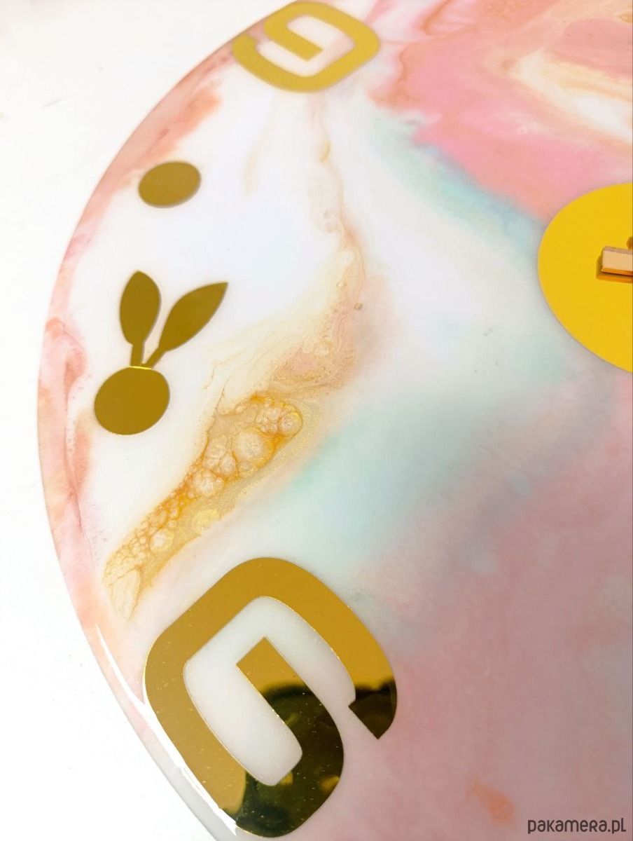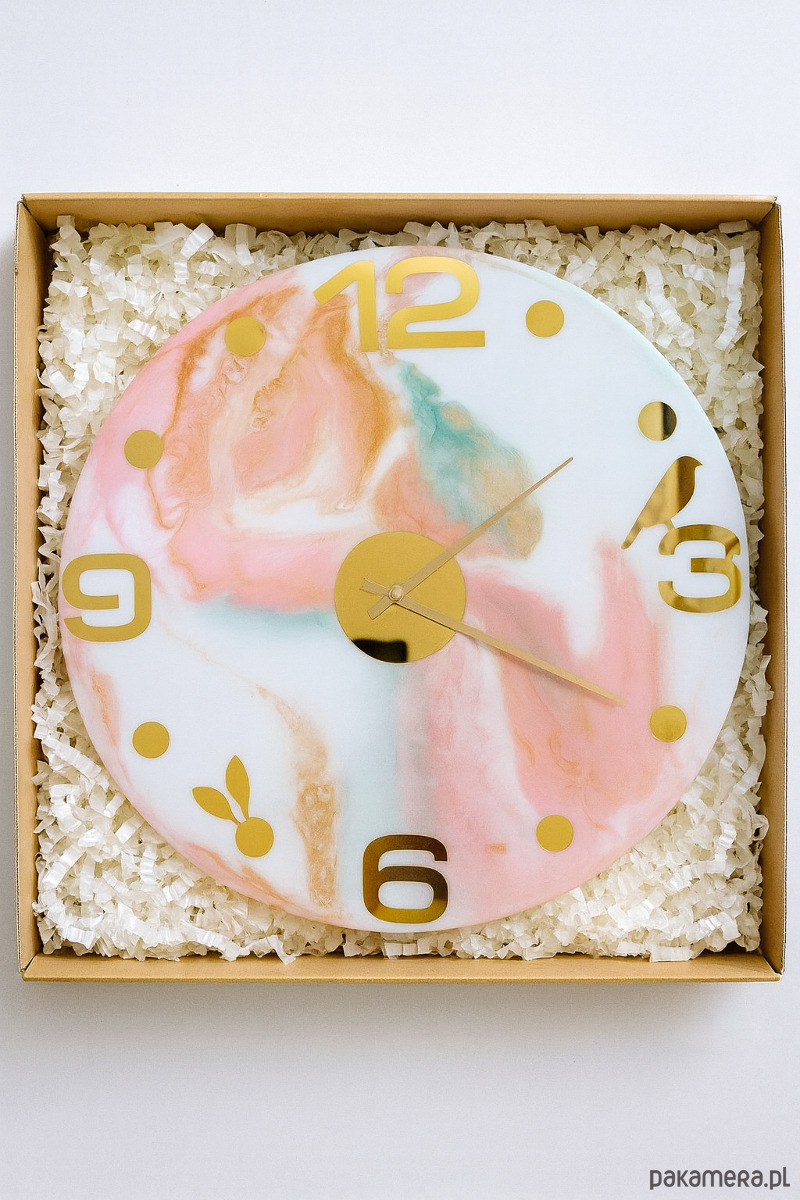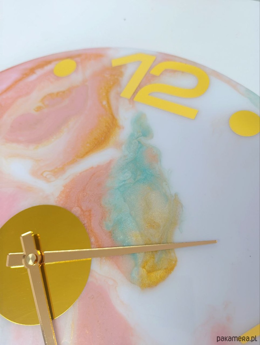 Elegancki zegar ścienny o średnicy 40 cm, wykonany ręcznie z wysokiej jakości żywicy epoksydowej. Unikatowy marmurkowy wzór w pastelowych odcieniach różu, błękitu i turkusu, wzbogacony złotymi detalami, sprawia, że zegar staje się nie tylko funkcjonalnym elementem, ale także wyjątkową dekoracją wnętrza.