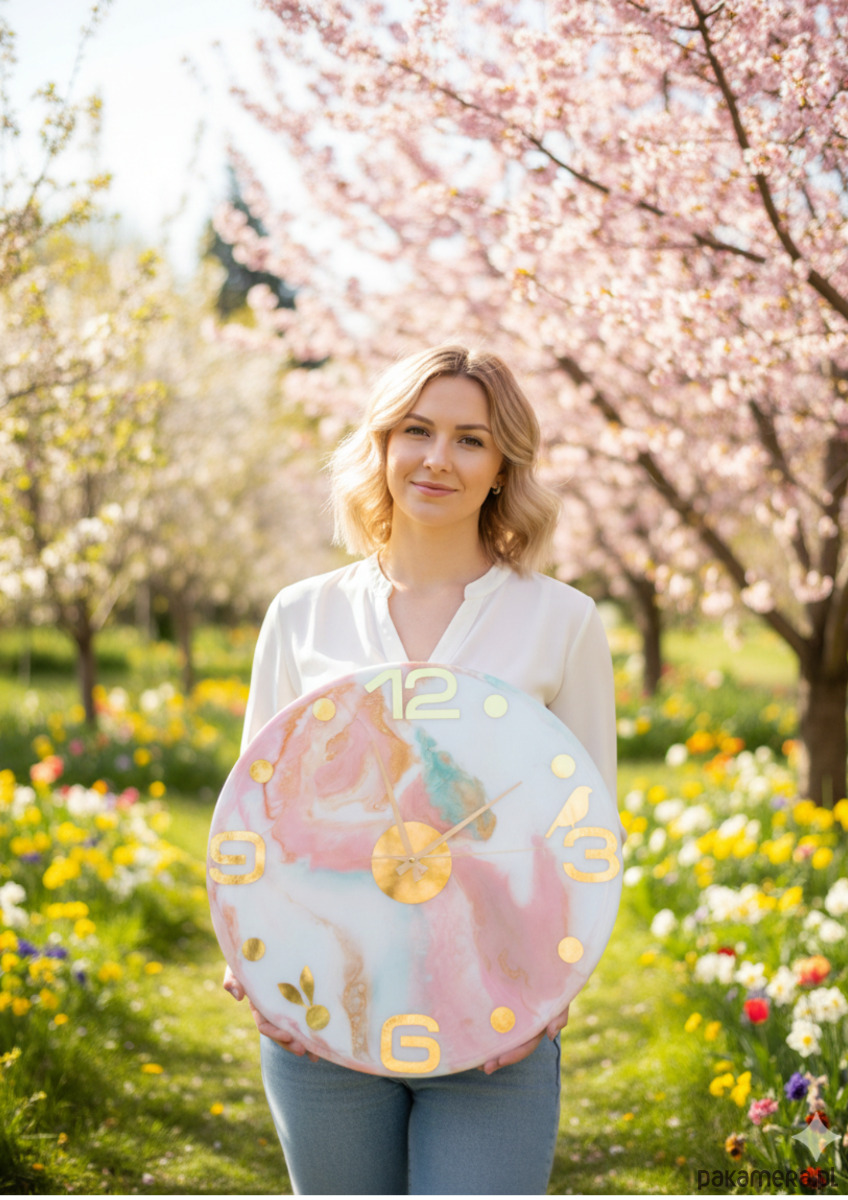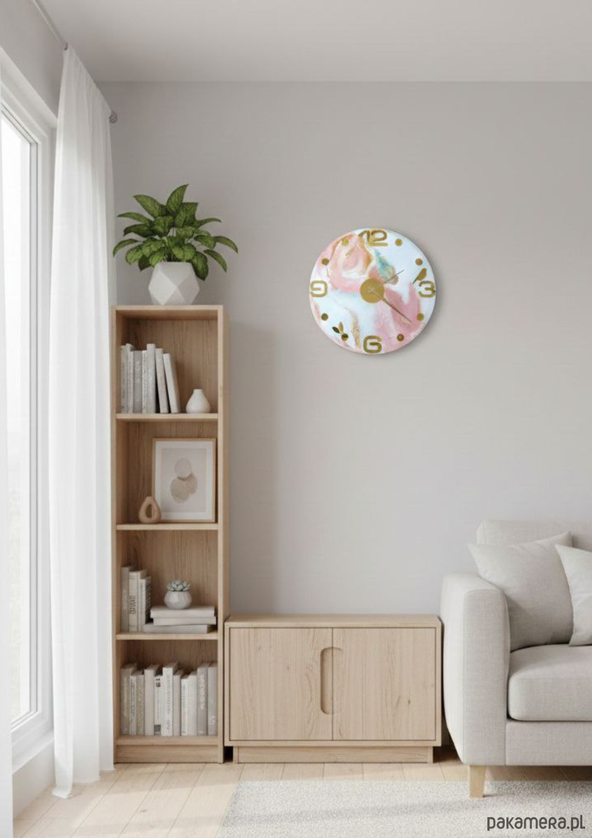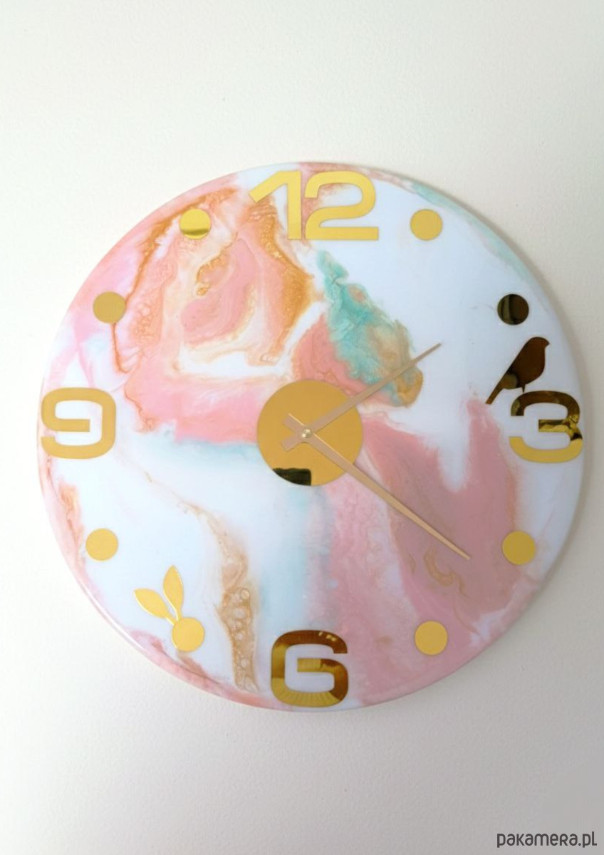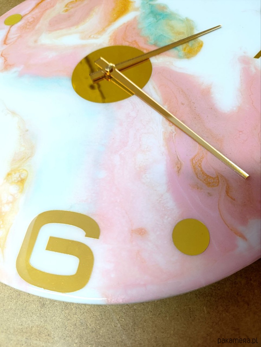 Elegancki zegar ścienny o średnicy 40 cm, wykonany ręcznie z wysokiej jakości żywicy epoksydowej. Unikatowy marmurkowy wzór w pastelowych odcieniach różu, błękitu i turkusu, wzbogacony złotymi detalami, sprawia, że zegar staje się nie tylko funkcjonalnym elementem, ale także wyjątkową dekoracją wnętrza.