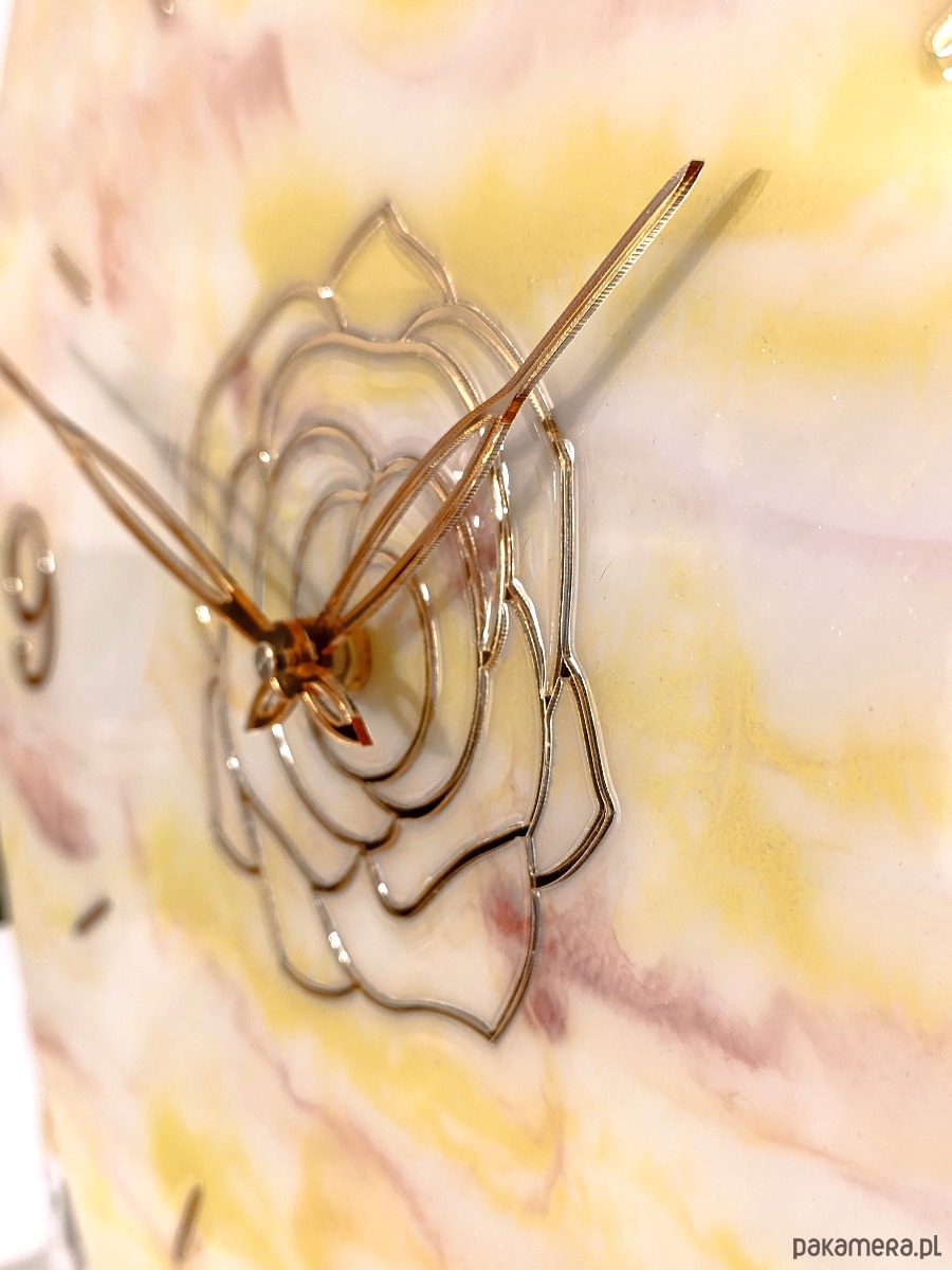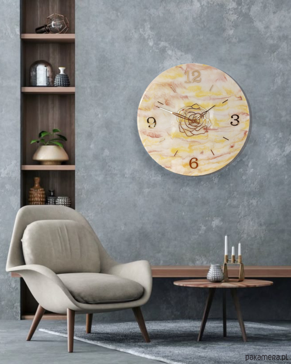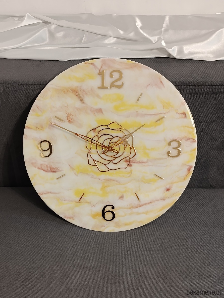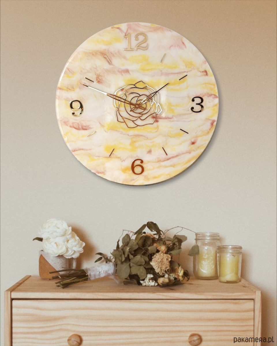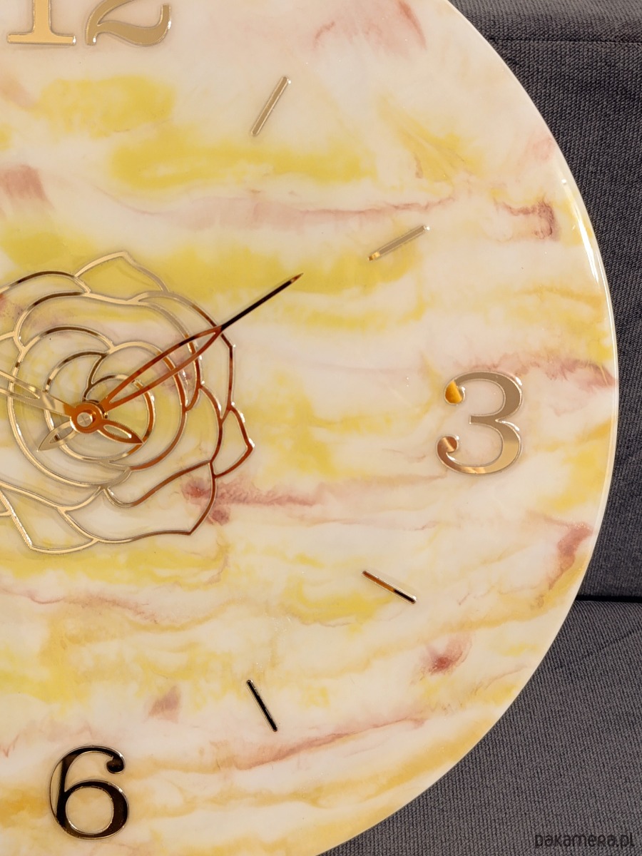 Wyjątkowy, duży zegar ścienny wykonany ręcznie z żywicy epoksydowej o średnicy 50 cm. Jego powierzchnia imituje delikatny marmur w odcieniach bieli, żółci i różu, tworząc ciepły, elegancki efekt. Złote wskazówki, cyfry i ozdobny motyw róży nadają mu luksusowego charakteru.
