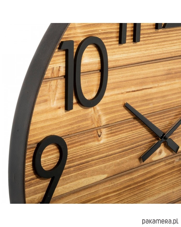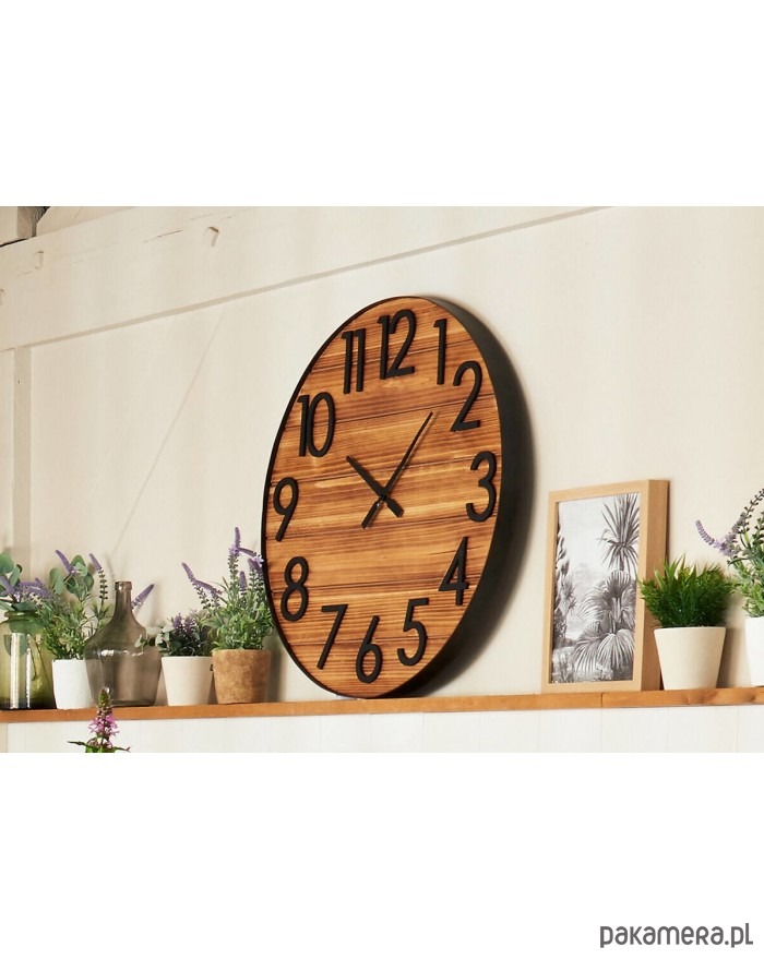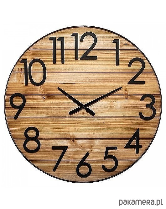 Duży zegar wiszący to duża ozdoba pomieszczenia, w którym się znajduje. Dominujący kolor to brązowy. Na tarczy znajdują się czarne, duże cyfry arabskie i wskazówki, które pozwalają szybko sprawdzić godzinę. Tarcza została wykonana z drewna jodłowego i sprawia wrażenie jakby była zbudowana z desek ułożonych poziomo. Zasilanie na baterię AA, której brak w zestawie.