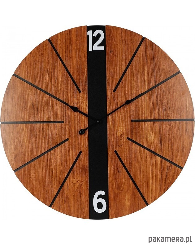Zegar ścienny z minimalistyczną tarczą wykonaną z brązowej płyty MDF imitującej drewno. Tylko godzina 12 i 6 są opisane cyframi, reszta została zaznaczona czarnymi liniami.