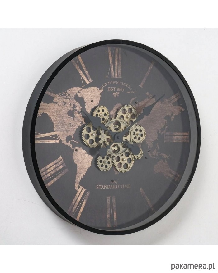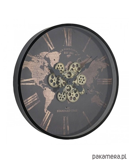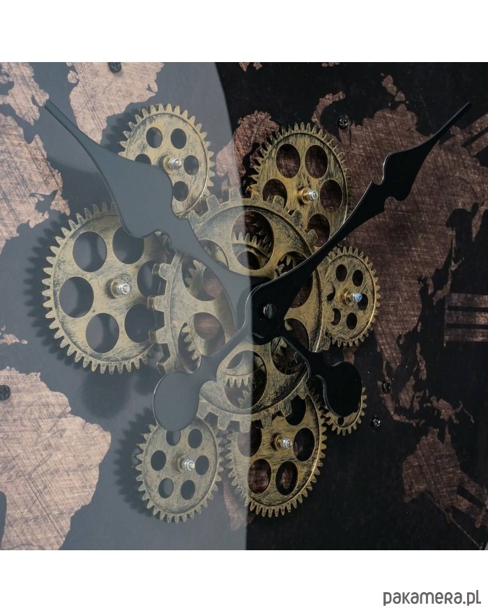 Zegar ścienny, który łączy w sobie styl nowoczesny z rustykalnym, kolonialnym wykończeniem. Szyba przesłania mechanizm zegara, który znajduje się na tle mapy świata. Duże, rzymskie cyfry pozwalają szybko określić godzinę. Materiał z którego zegar został wykonany, to MDF i polipropylen, wytrzymałe i odporne na uszkodzenia. Na tylnej ściance znajduje się uchwyt do powieszenia na ścianie. Zasilanie baterie AA niezałączone do produktu.