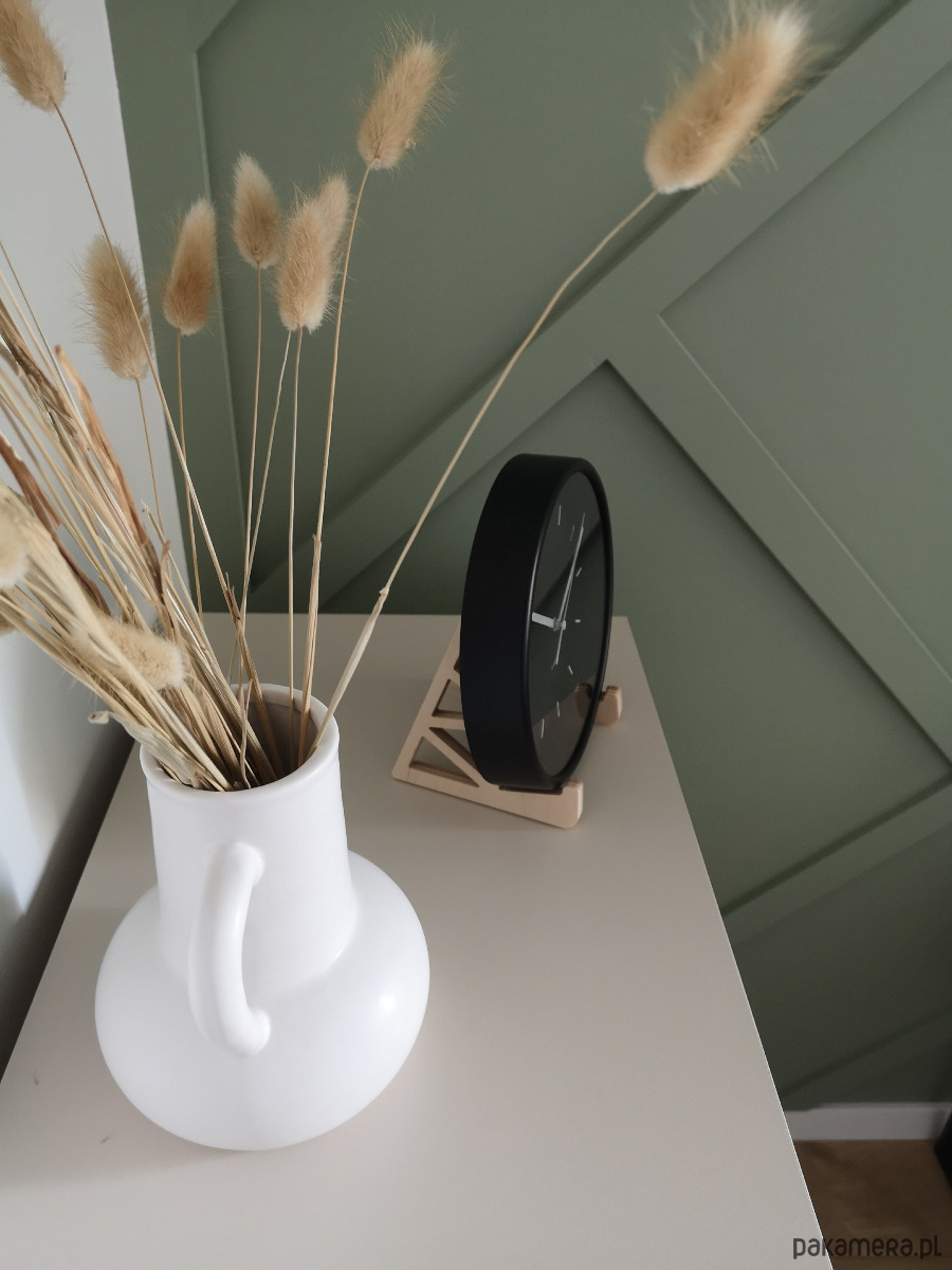 Drewniany stojak, na którym zegar jest umieszczony, dodaje naturalnego charakteru do wnętrza. Stojak wykonany jest z grubej naturalnej sklejki, która zapewnia stabilność i trwałość. Dzięki niemu zegar może stać na biurku, półce lub innym płaskim powierzchniach bez ryzyka przewrócenia.