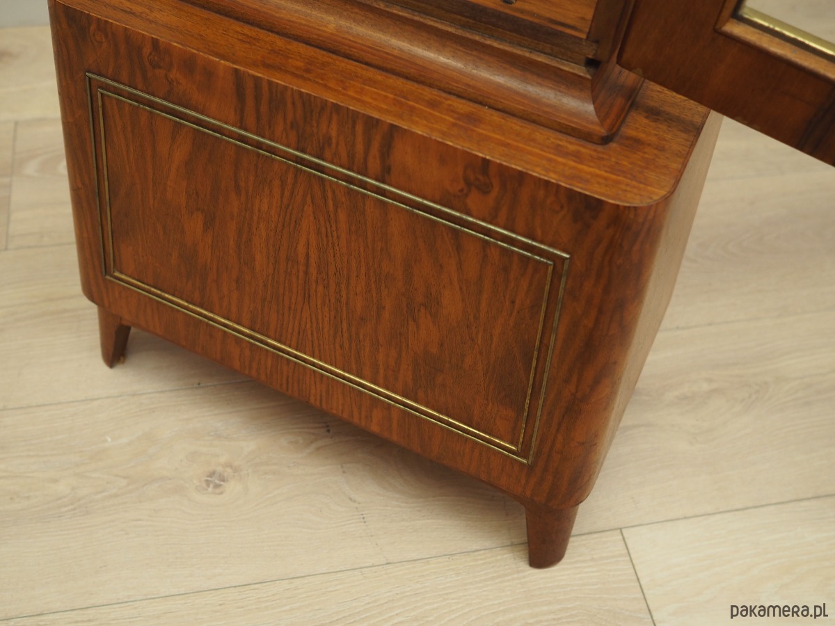 Górna część skrzyni pokryta została fornirem. Dolna część skrzyni wykonana z drewna sosnowego. Zegar jest idealnym uzupełnieniem wystroju salonu lub sypialni.