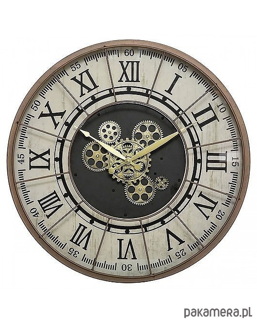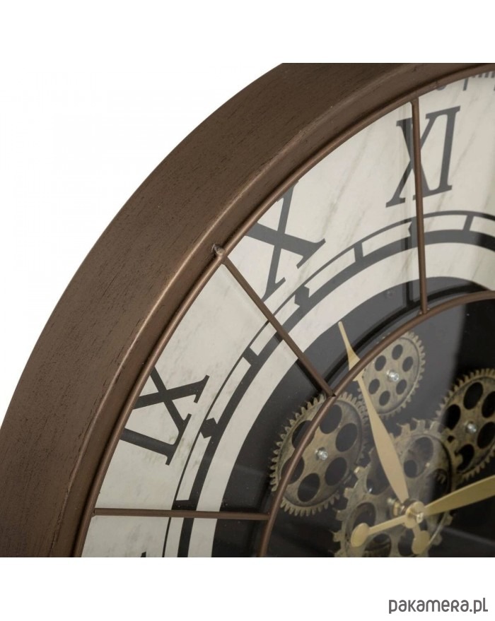 Zegar ścienny loftowy. Posiada widoczny mechanizm. Został wykonany z metalu w brązowym kolorze z mosiężnymi dodatkami. Wyraźne, rzymskie cyfry.