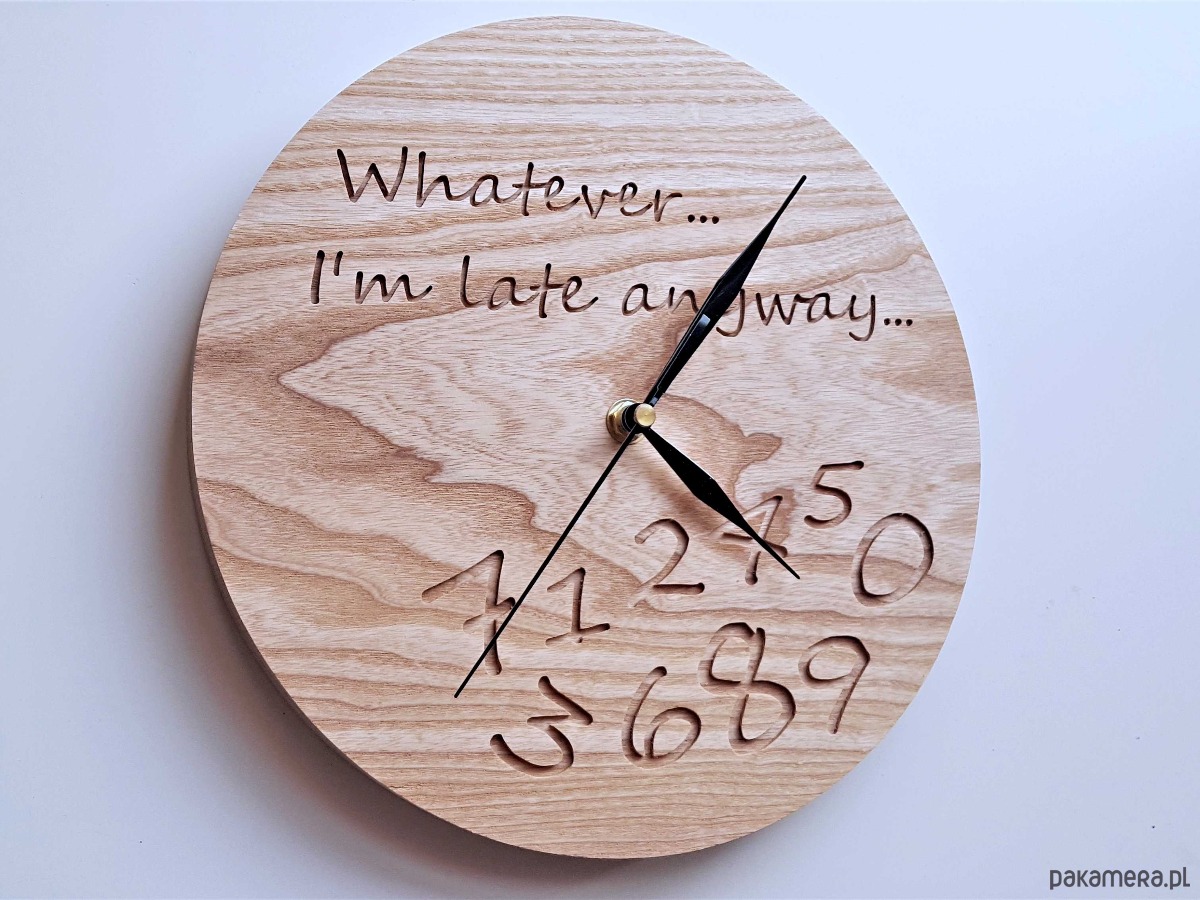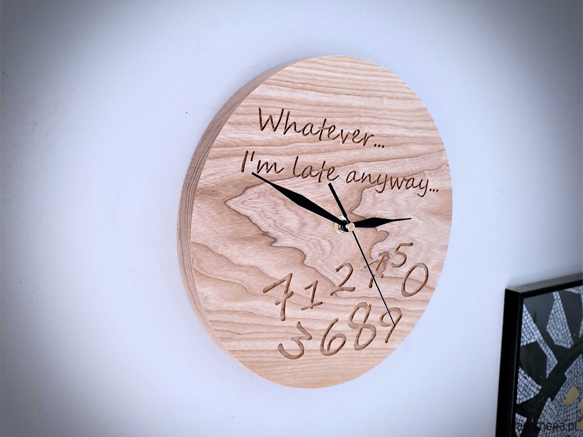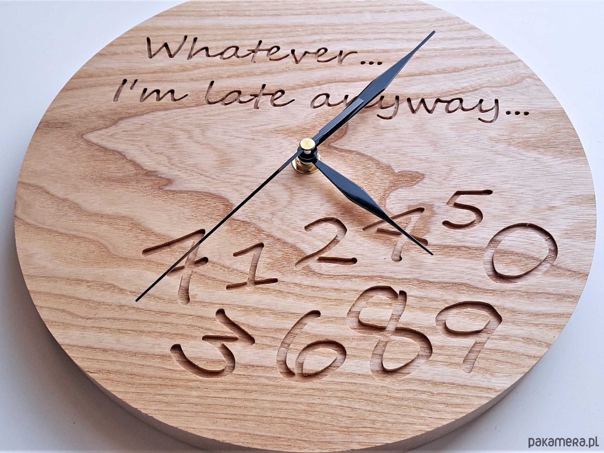 Zegar z drewna dla spóźnialskich, grawer, jesion