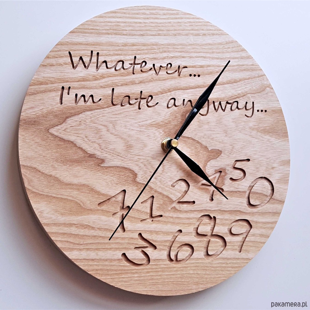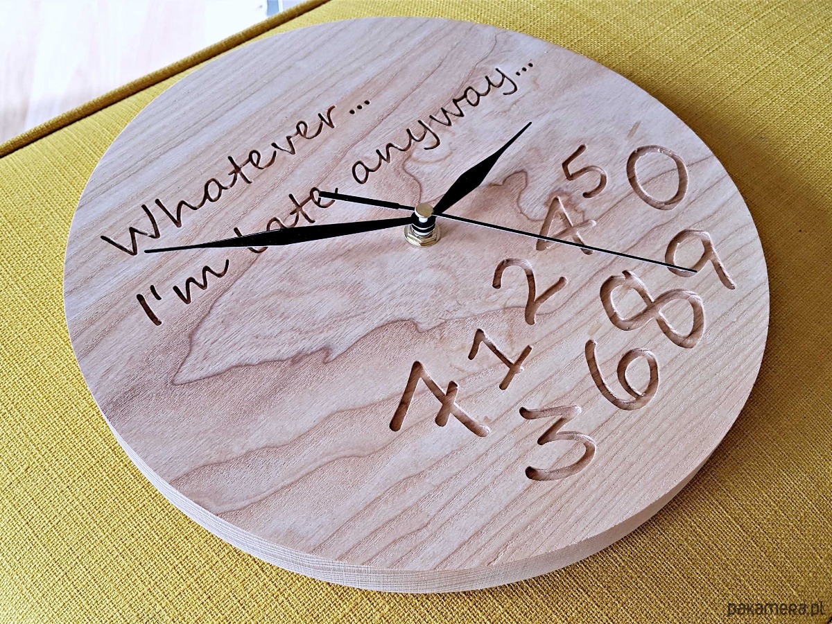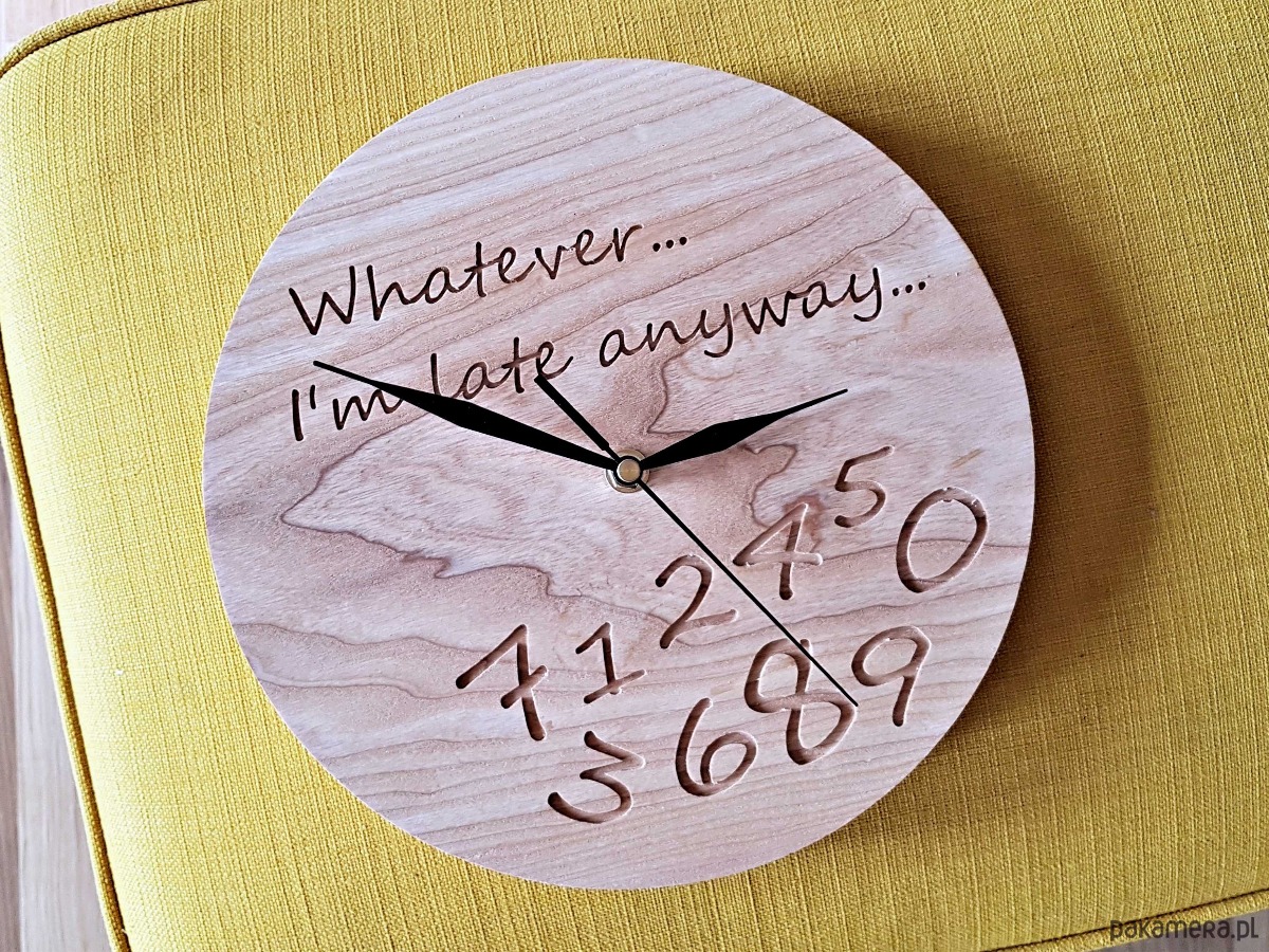 Zegar z drewna dla spóźnialskich, grawer, jesion