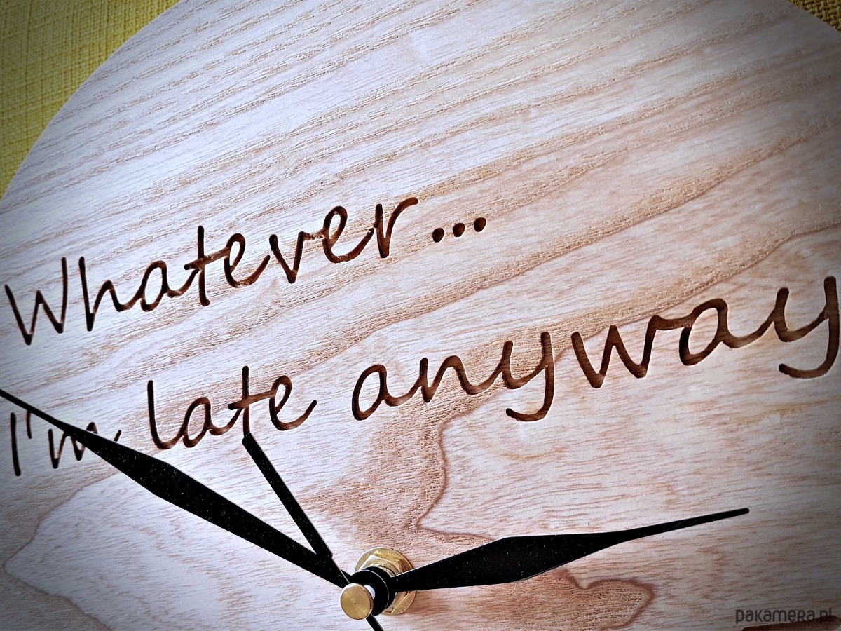 Przepięknie wykonany drewniany zegar, z żartobliwym zwrotem. Idealny dla spóźnialskich lub tych, co szczęśliwe czasu liczyć nie muszą :)