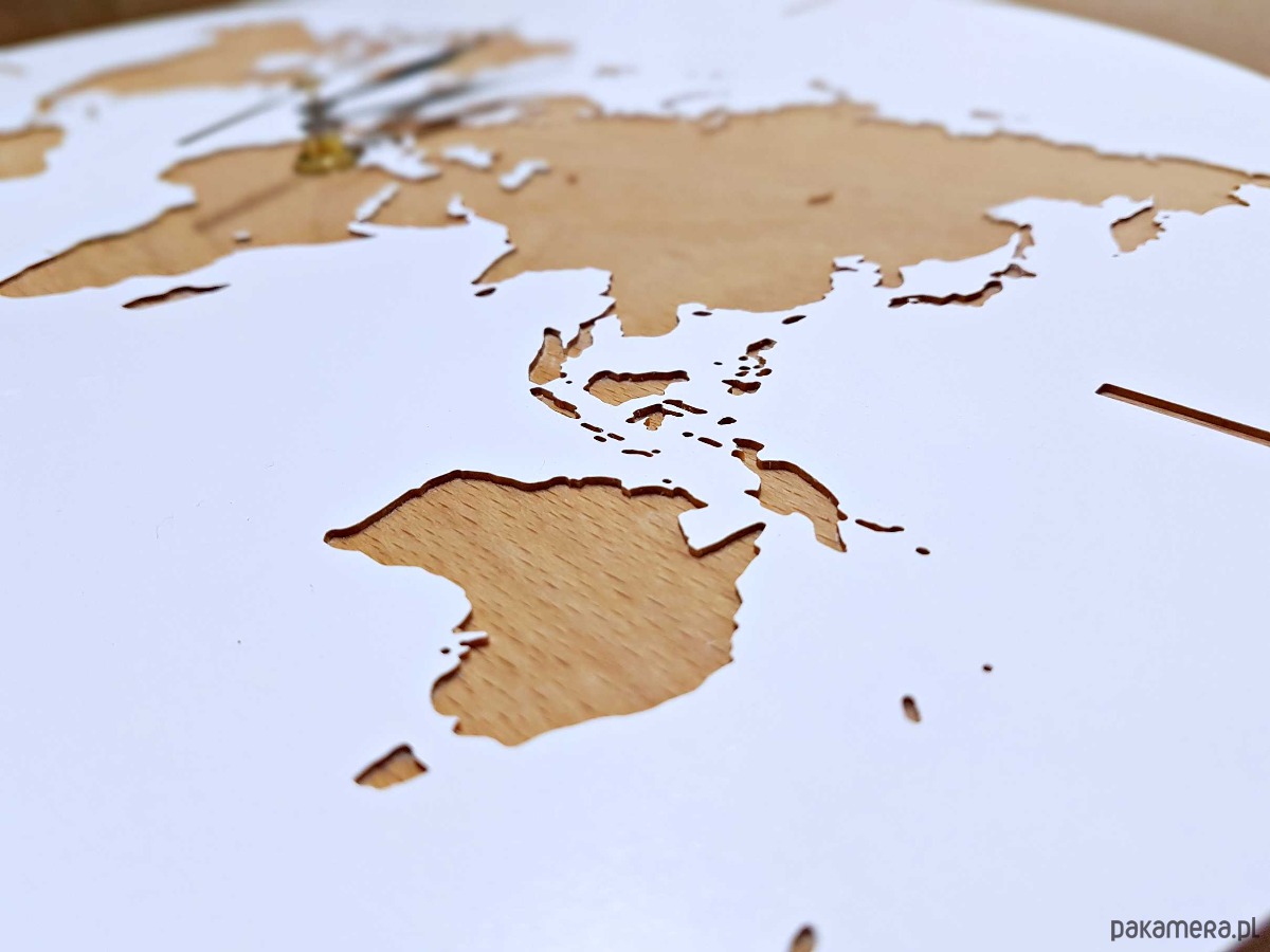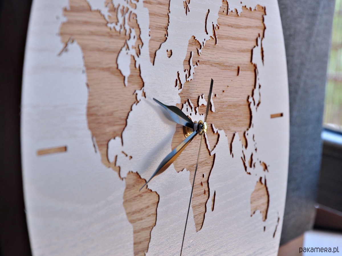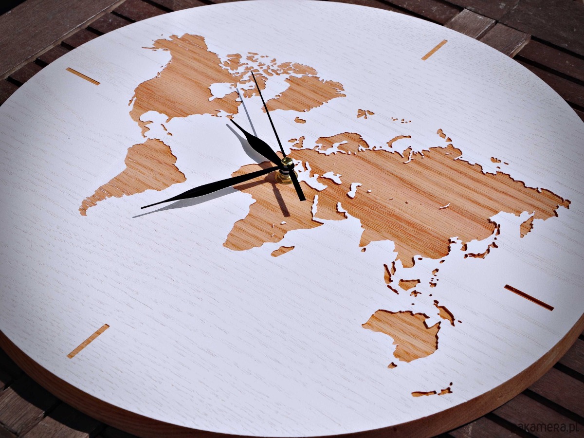 Każdy zegar powstaje ręcznie, z dbałością o detale – od wyboru drewna, poprzez precyzyjne frezowanie mapy, aż po wykończenie, które podkreśla naturalne piękno materiału. Dzięki temu każdy egzemplarz jest unikatowy.
