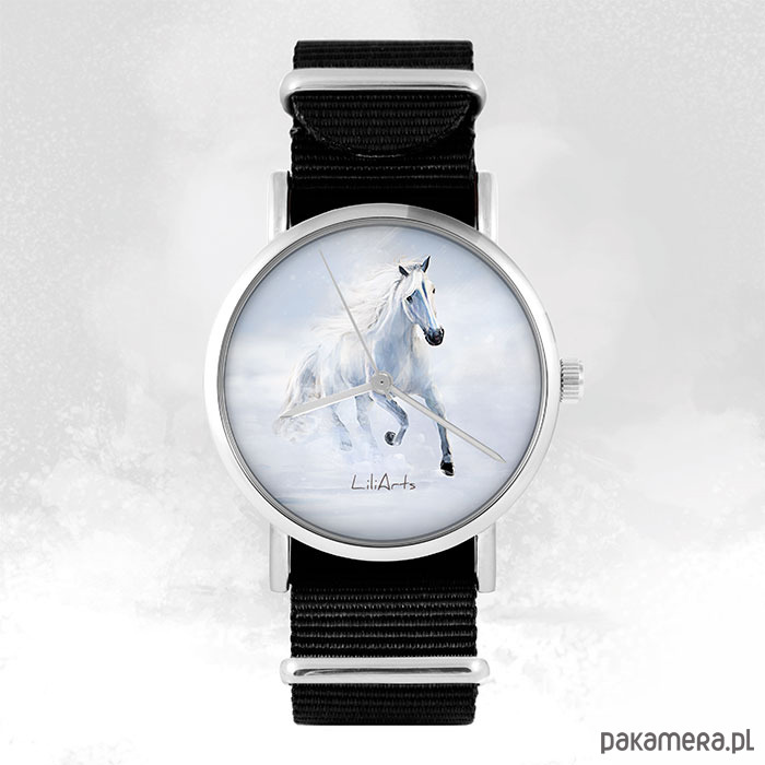 Zegarek - Biały koń biegnący - czarny, nylonowy