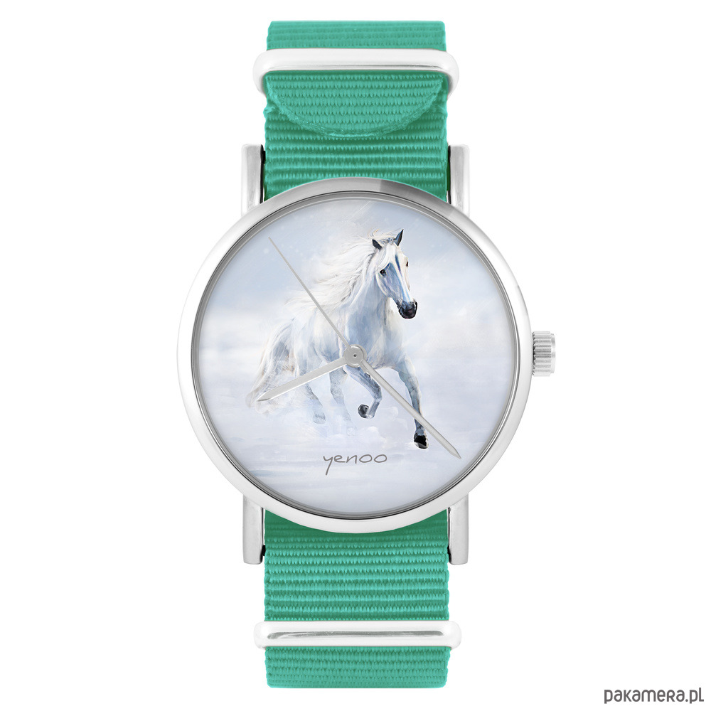 Zegarek - Biały koń biegnący - turkusowy, nylonowy