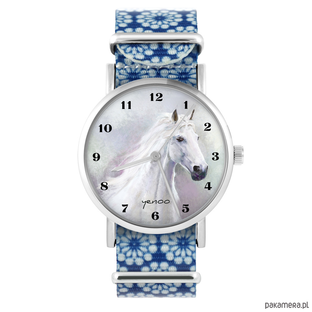 Zegarek - Biały koń - niebieski, kwiaty