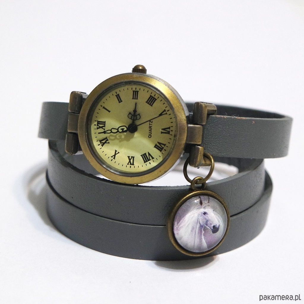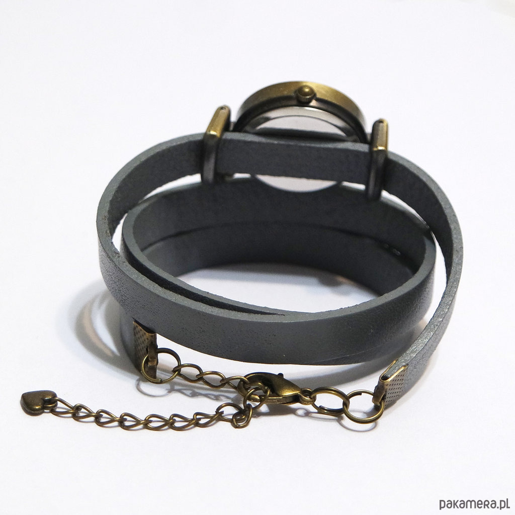 Zegarek umieszczony jest na szarym, skórzanym pasku o szerokości 1 cm, owijanym trzykrotnie na nadgarstku.