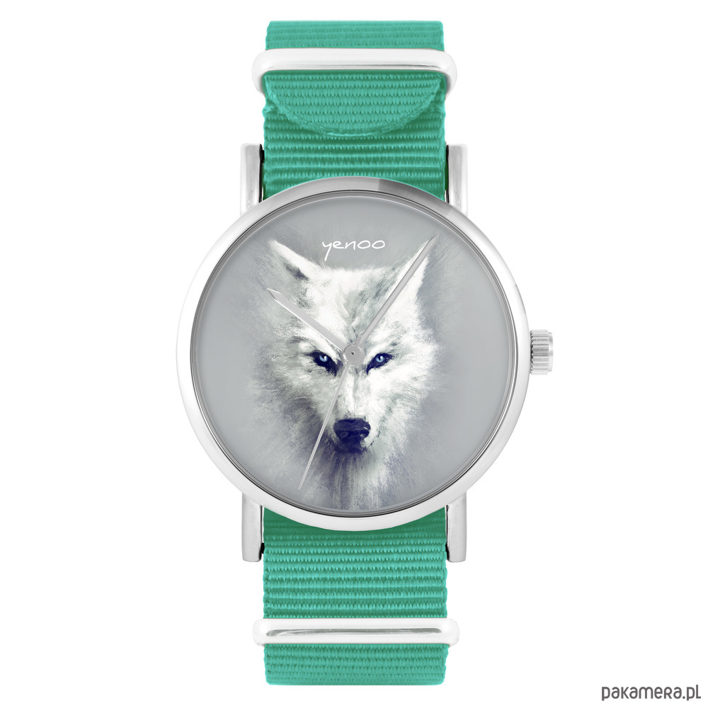 Zegarek - Biały wilk - turkusowy, nylonowy