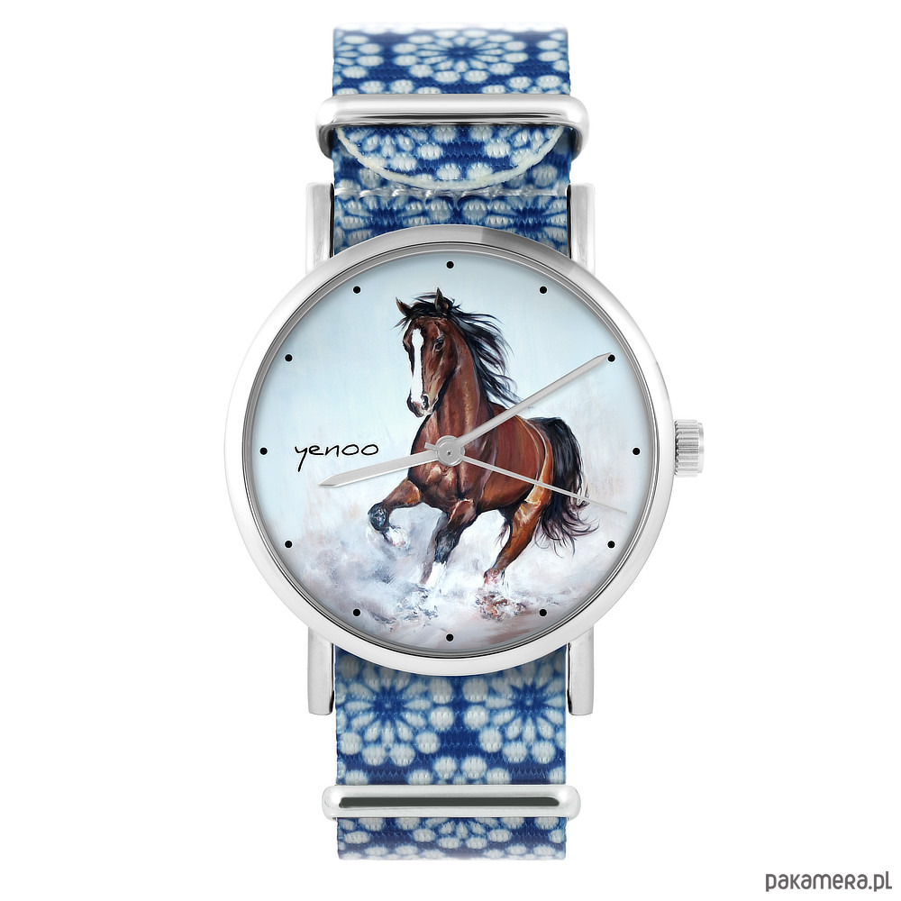 Zegarek - Brązowy koń - niebieski, kwiaty