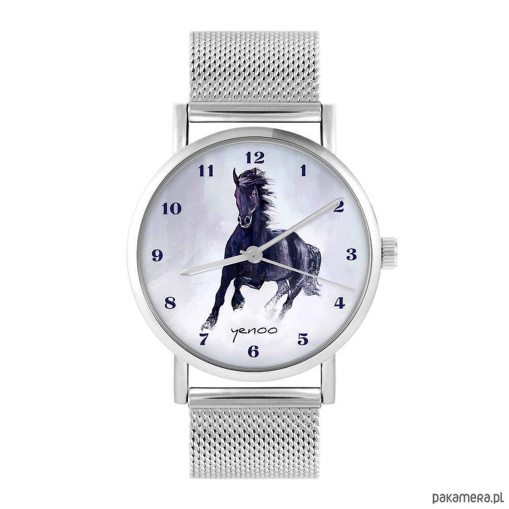 Zegarek - Czarny koń, cyfry - bransoleta mesh